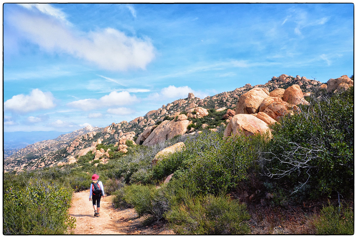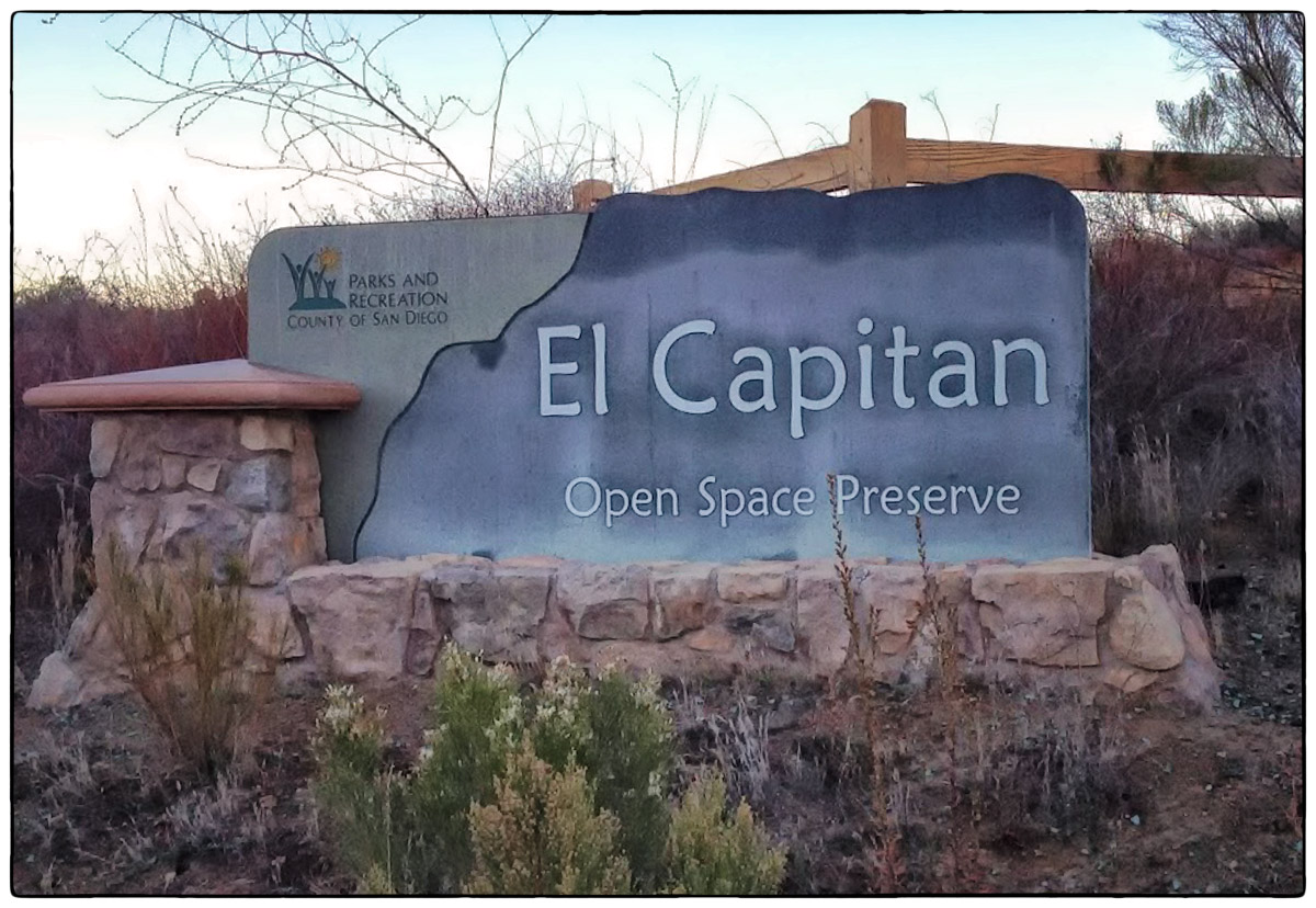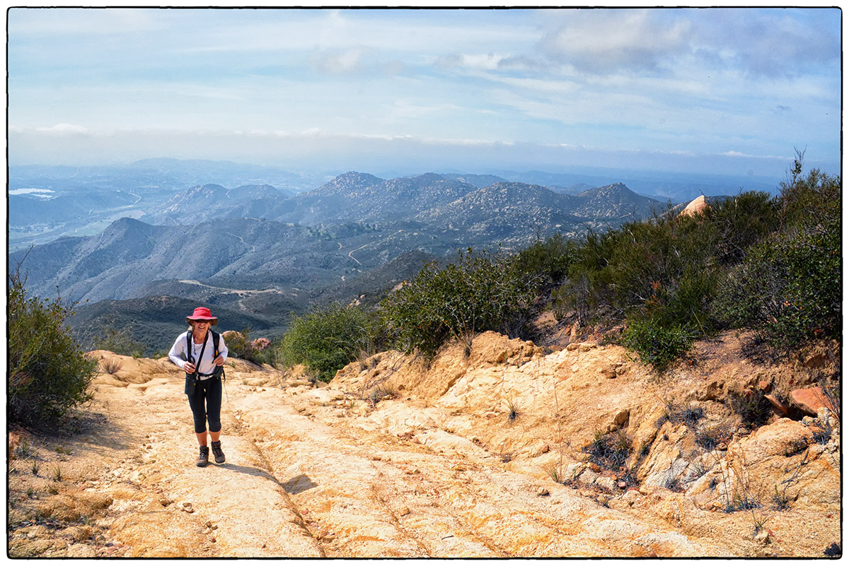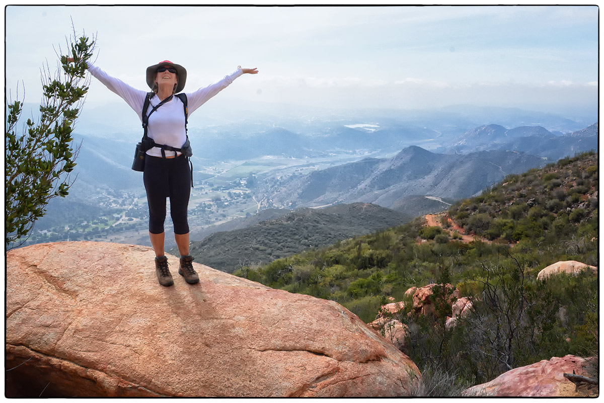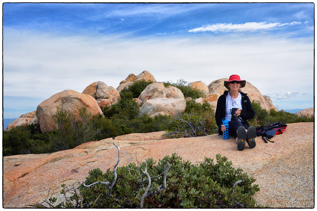 On Friday, March 7th, it was time to challenge our fitness level and attack El Cajon Mountain (El Capitan) a 12 mile round trip strenuous hike with over 4300 feet of elevation gain. Located near Lakeside only about 30 minutes from Santee we arrived around 10am and parked at the trailhead parking lot and started up the road past the private Blue Sky Ranch, a haven for local mystics. Soon we hook up with the old mining road, a precariously steep road bulldozed by miners years ago, no switchbacks just straight up and down. It twists and turns over a scrubby, boulder-punctuated landscape. We reached the STOP sign at 11:45am and new we could continue to the top and still make it back by 4:30pm when the gates close. Onward and upward we went and at 5.5 miles, the road arrives on a saddle where we finally found some other hikers resting before heading back down. We continued on for 1.4 mile trek over a severally eroded and partially overgrown roadbed. Then through thick chaparral and around jumbo- sized boulders to El Cajon’s Mountain summit (3675 ft) with views of the ocean, islands, and innumerable mountain peaks. We stopped for a very short rest and had some snacks then turned around and headed right back down to get to the parking lot before 4:30pm.