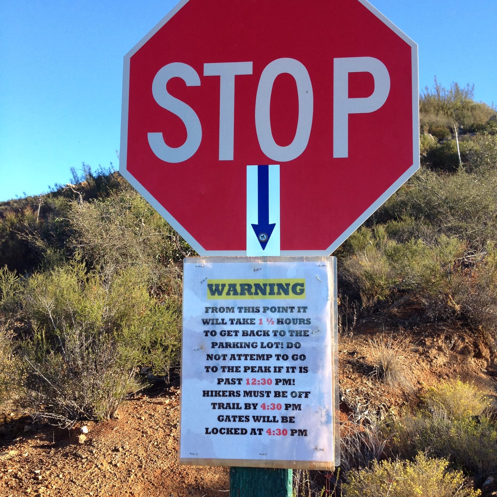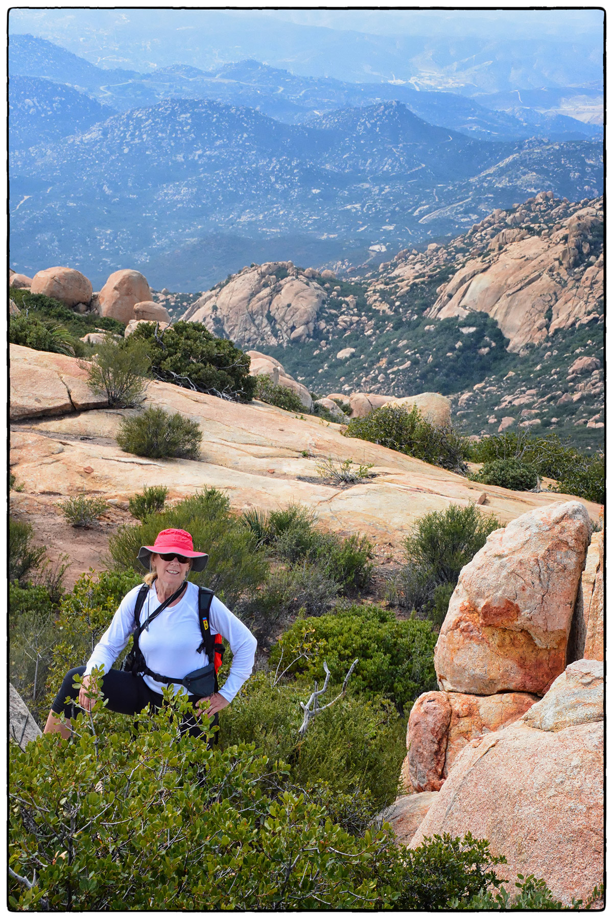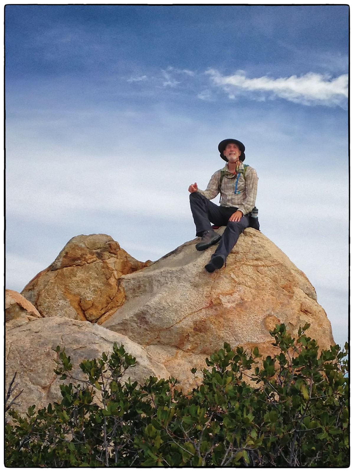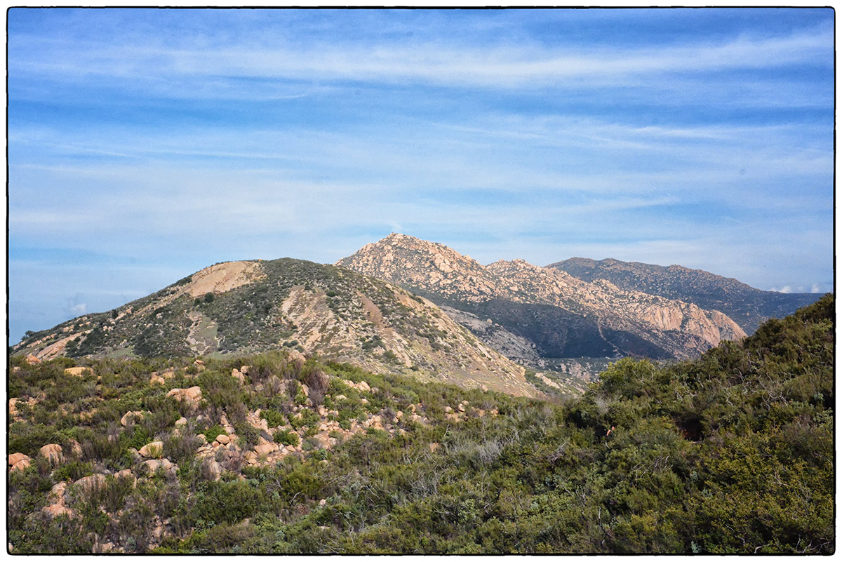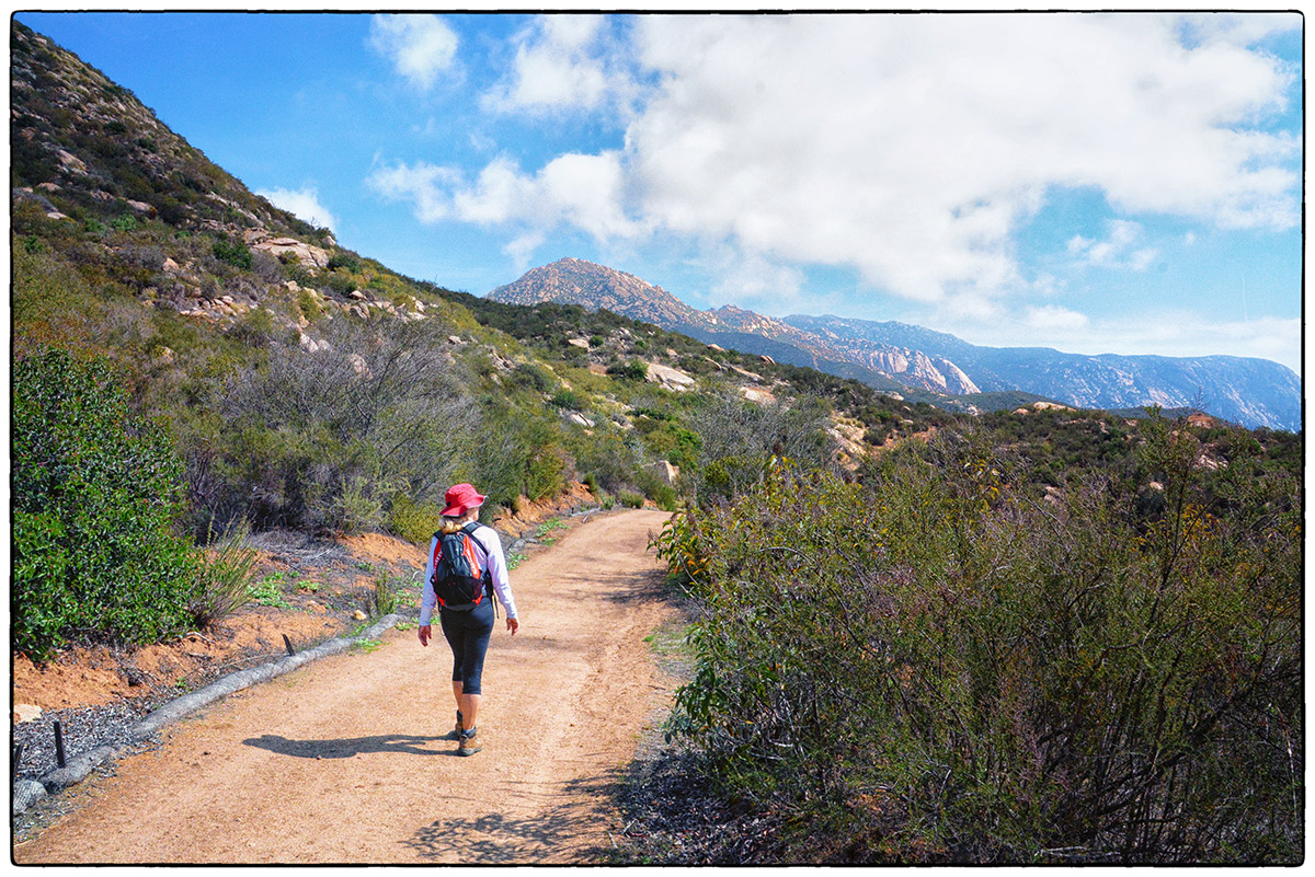 On Friday, March 7th, it was time to challenge our fitness level and attack El Cajon Mountain (El Capitan) a 12 mile round trip strenuous hike with over 4300 feet of elevation gain. Located near Lakeside only about 30 minutes from Santee we arrived around 10am and parked at the trailhead parking lot and started up the road past the private Blue Sky Ranch, a haven for local mystics. Soon we hook up with the old mining road, a precariously steep road bulldozed by miners years ago, no switchbacks just straight up and down. It twists and turns over a scrubby, boulder-punctuated landscape. We reached the STOP sign at 11:45am and new we could continue to the top and still make it back by 4:30pm when the gates close. Onward and upward we went and at 5.5 miles, the road arrives on a saddle where we finally found some other hikers resting before heading back down. We continued on for 1.4 mile trek over a severally eroded and partially overgrown roadbed. Then through thick chaparral and around jumbo- sized boulders to El Cajon’s Mountain summit (3675 ft) with views of the ocean, islands, and innumerable mountain peaks. We stopped for a very short rest and had some snacks then turned around and headed right back down to get to the parking lot before 4:30pm.