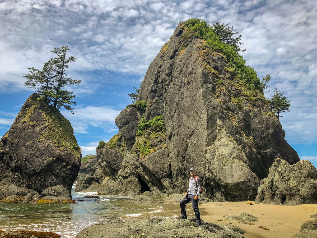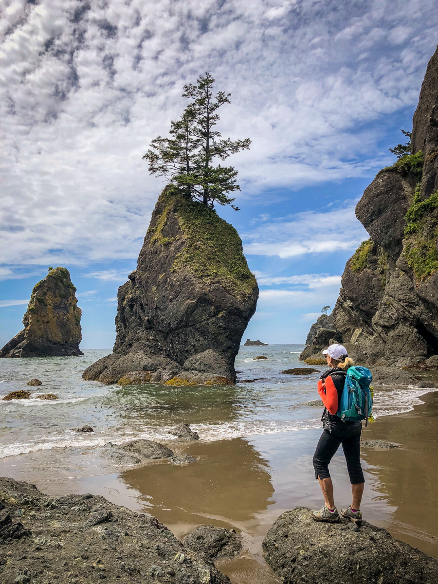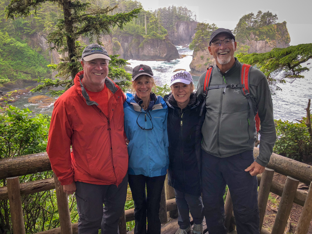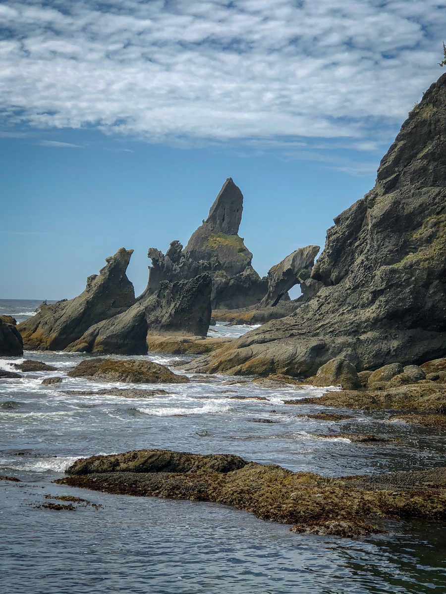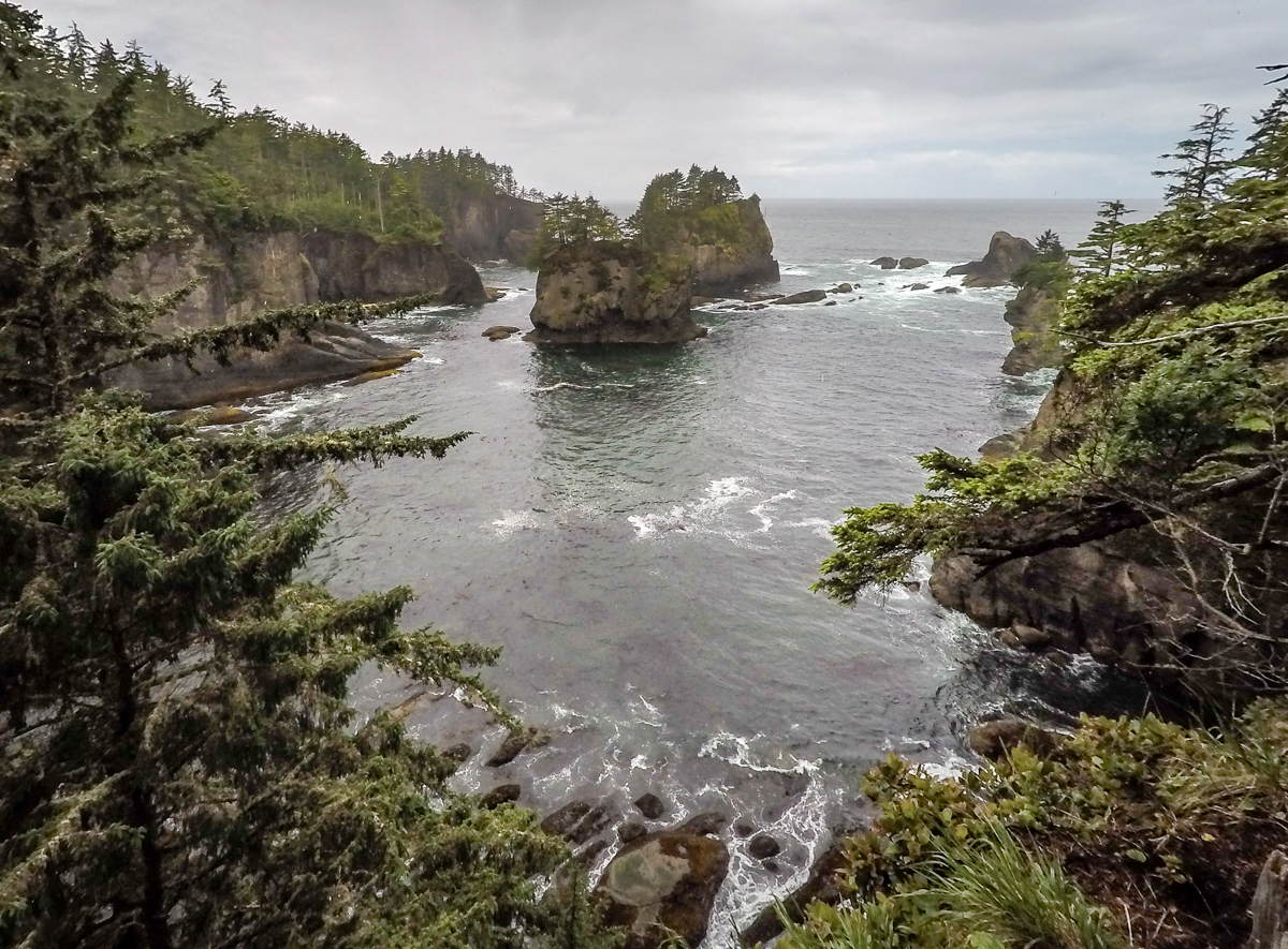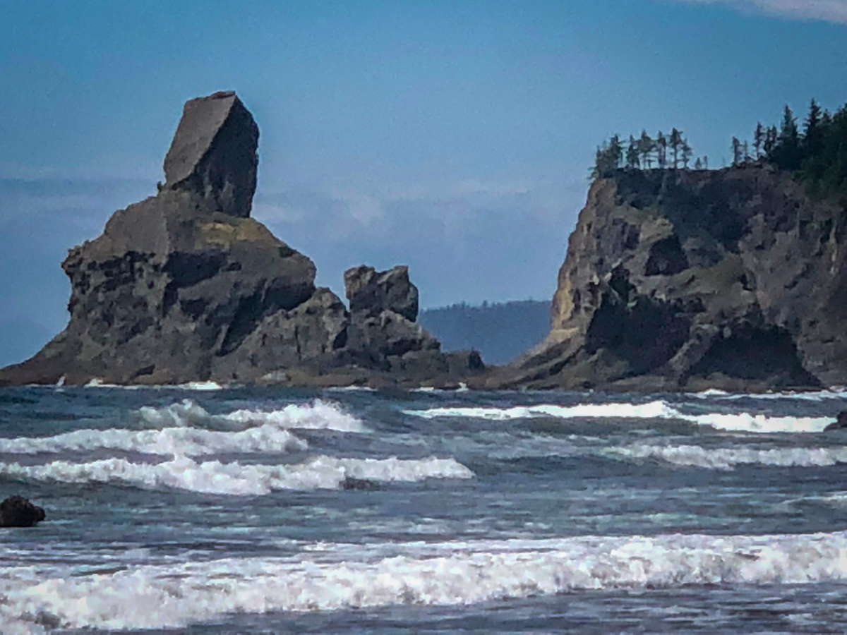 Today we drove out to the wild and rugged Olympic Coast and Shi Shi Beach to hike the 8 miles round trip to the Point of Arches. We had to stop at the Museum in Neah Bay to purchase the Makah Recreation Pass a permit for the trail. We arrived at the Trailhead and started our hike along the recently-rehabilitated trail for a mile winding through brushy clearcut and groves of Sitka spruce. We crossed over several bridges and boardwalks, but then the trail got messier and almost always muddy and wet. But shortly we were rewarded with the site of Shi Shi Beach.