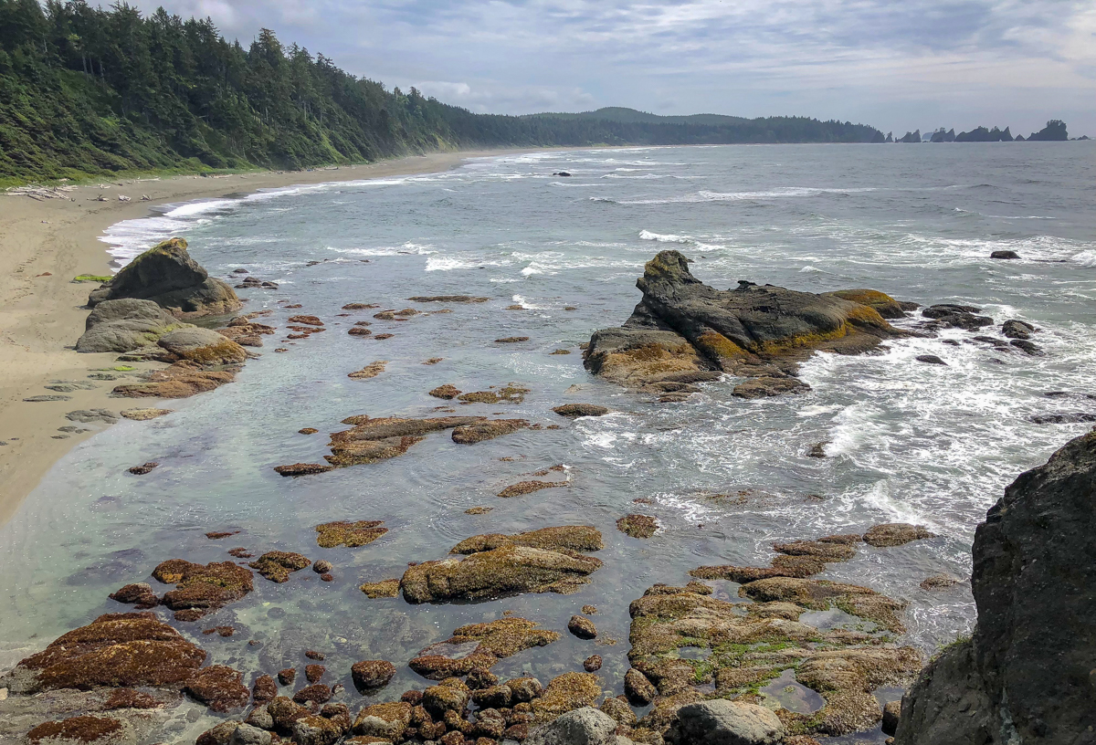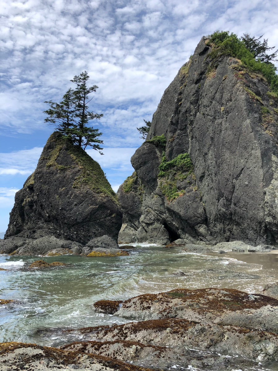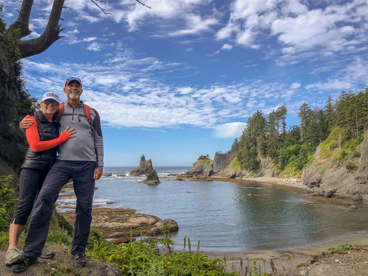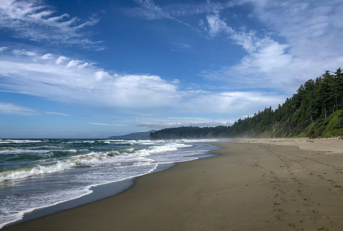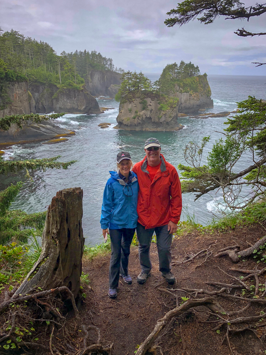 Today we drove out to the wild and rugged Olympic Coast and Shi Shi Beach to hike the 8 miles round trip to the Point of Arches. We had to stop at the Museum in Neah Bay to purchase the Makah Recreation Pass a permit for the trail. We arrived at the Trailhead and started our hike along the recently-rehabilitated trail for a mile winding through brushy clearcut and groves of Sitka spruce. We crossed over several bridges and boardwalks, but then the trail got messier and almost always muddy and wet. But shortly we were rewarded with the site of Shi Shi Beach.