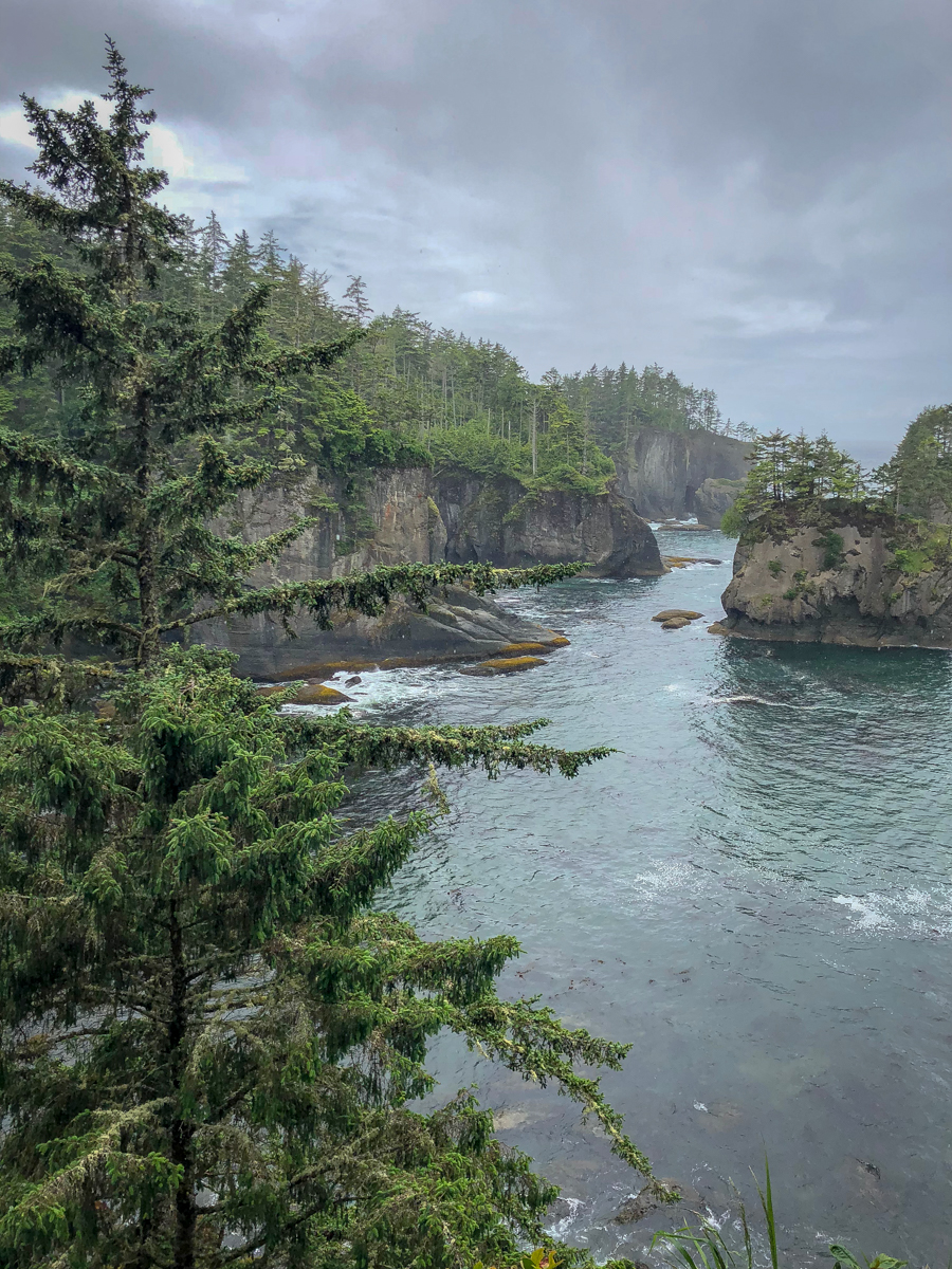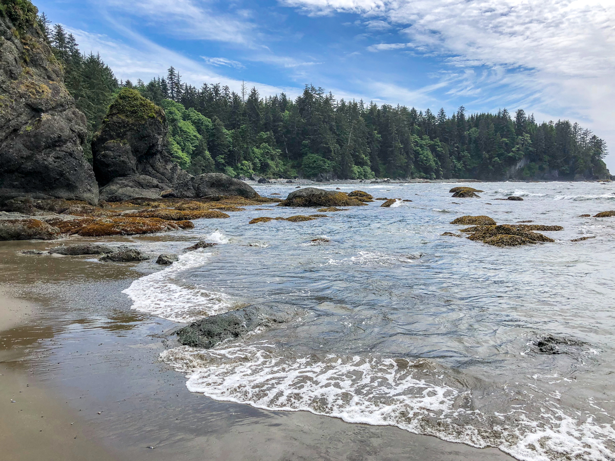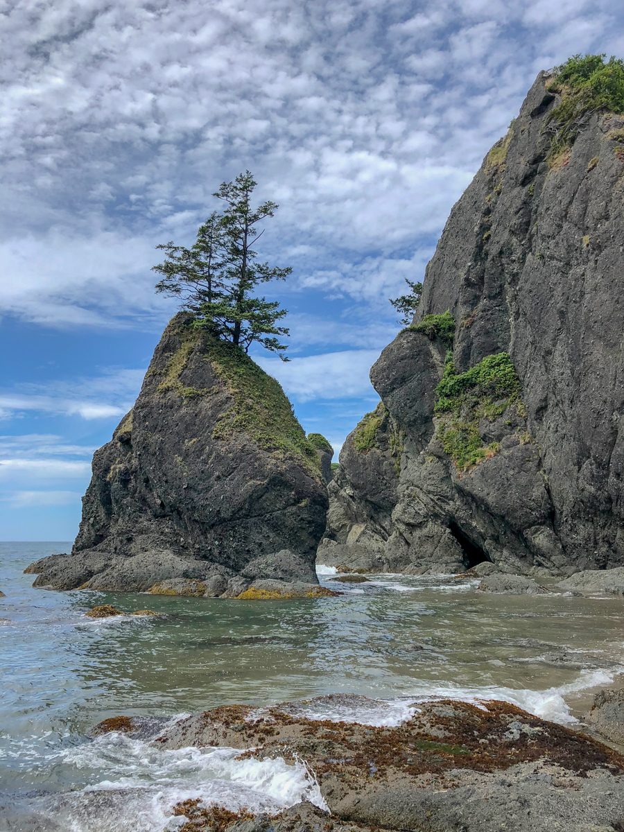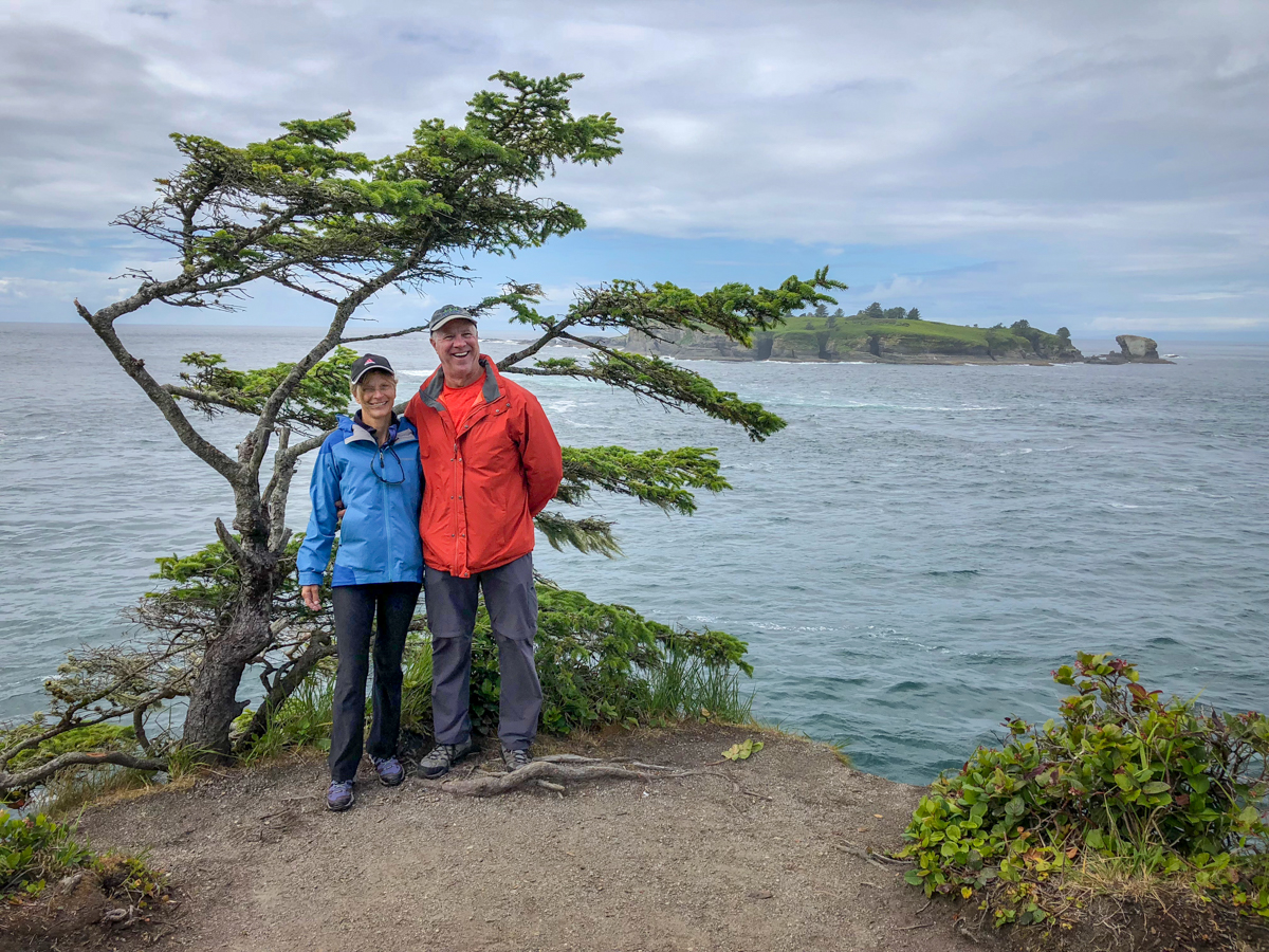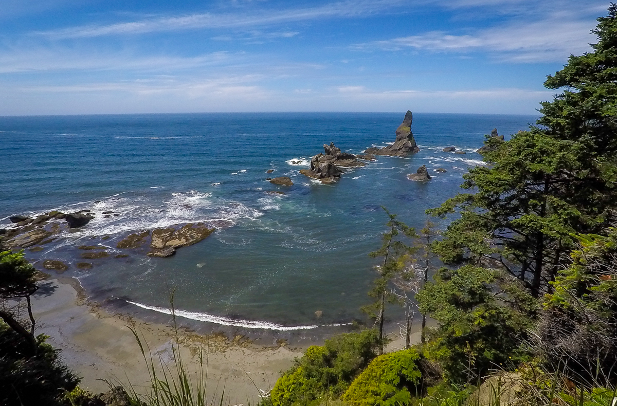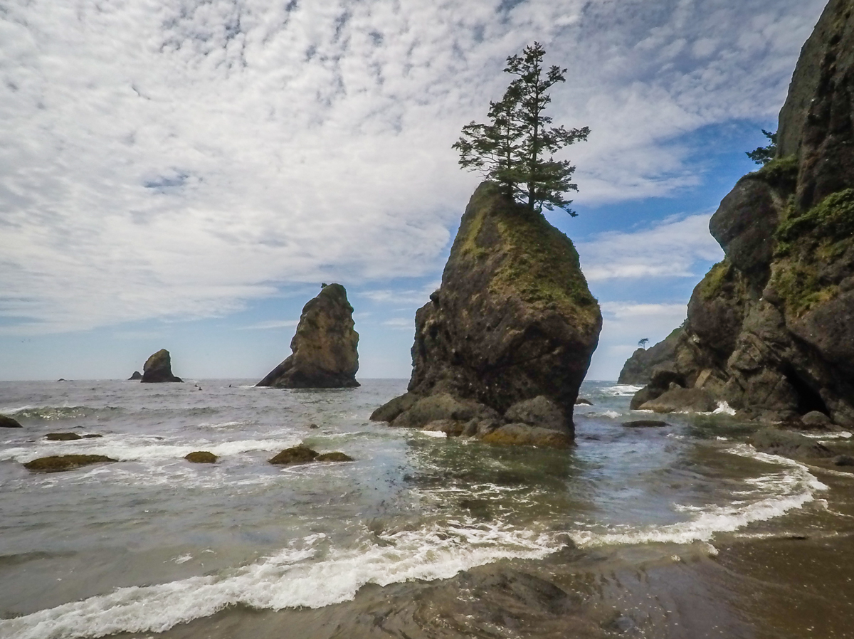 Today we drove out to the wild and rugged Olympic Coast and Shi Shi Beach to hike the 8 miles round trip to the Point of Arches. We had to stop at the Museum in Neah Bay to purchase the Makah Recreation Pass a permit for the trail. We arrived at the Trailhead and started our hike along the recently-rehabilitated trail for a mile winding through brushy clearcut and groves of Sitka spruce. We crossed over several bridges and boardwalks, but then the trail got messier and almost always muddy and wet. But shortly we were rewarded with the site of Shi Shi Beach.