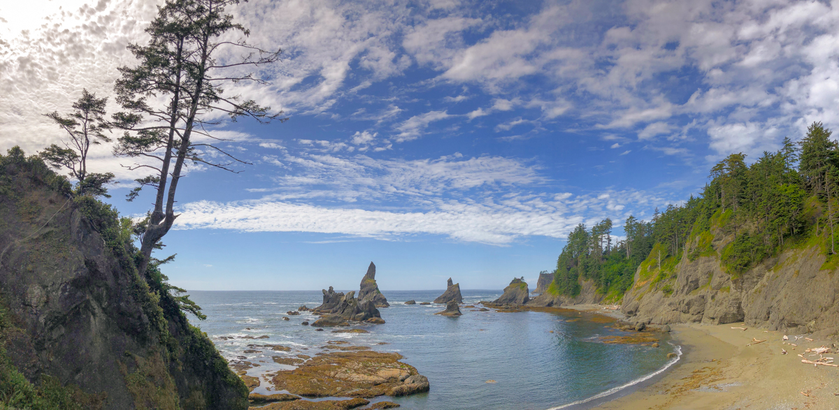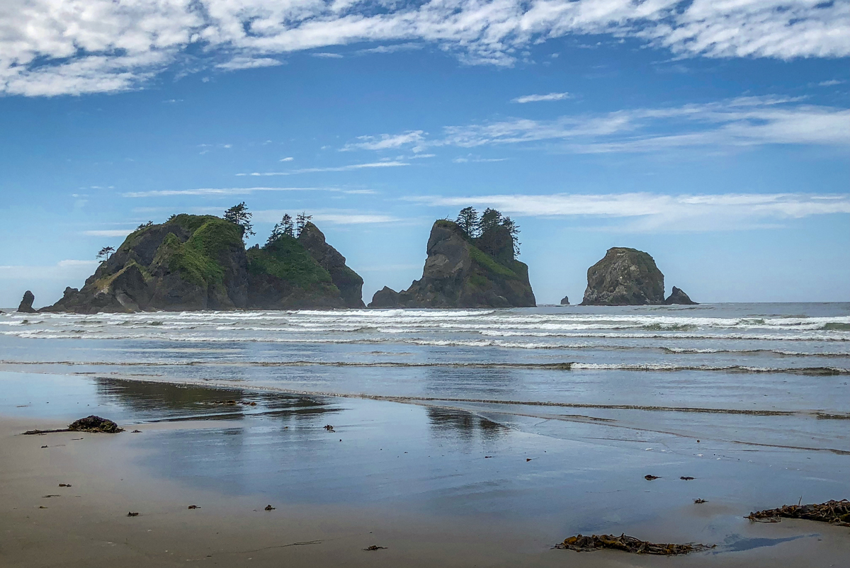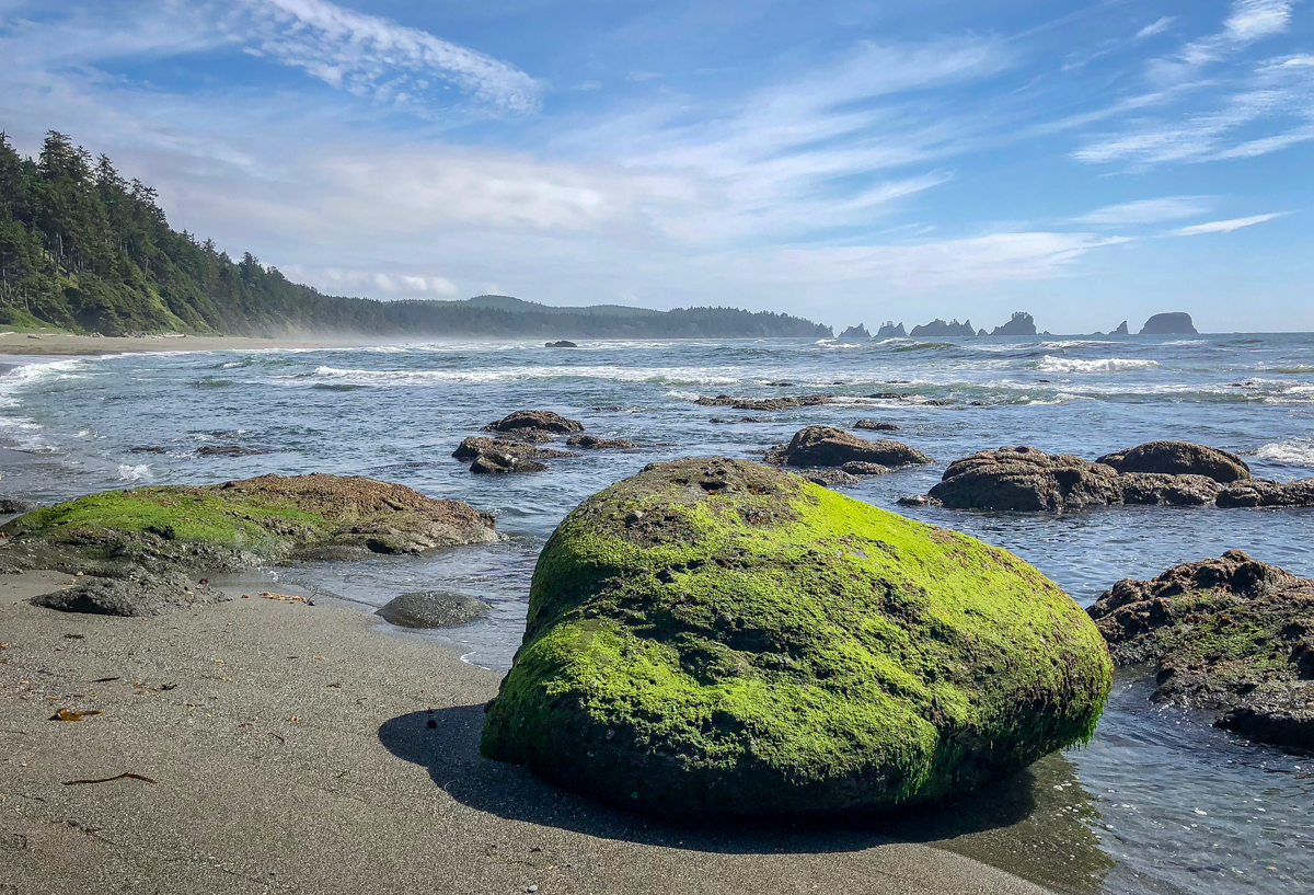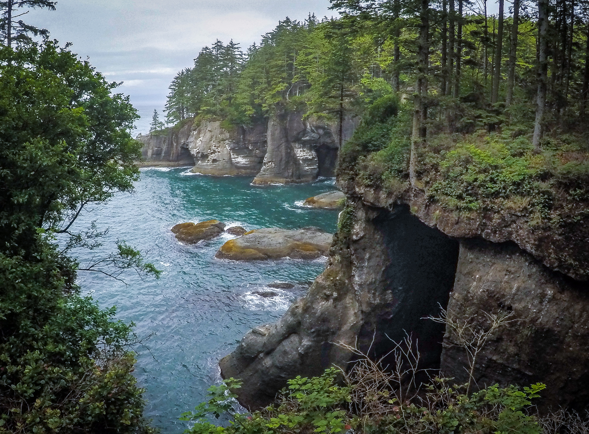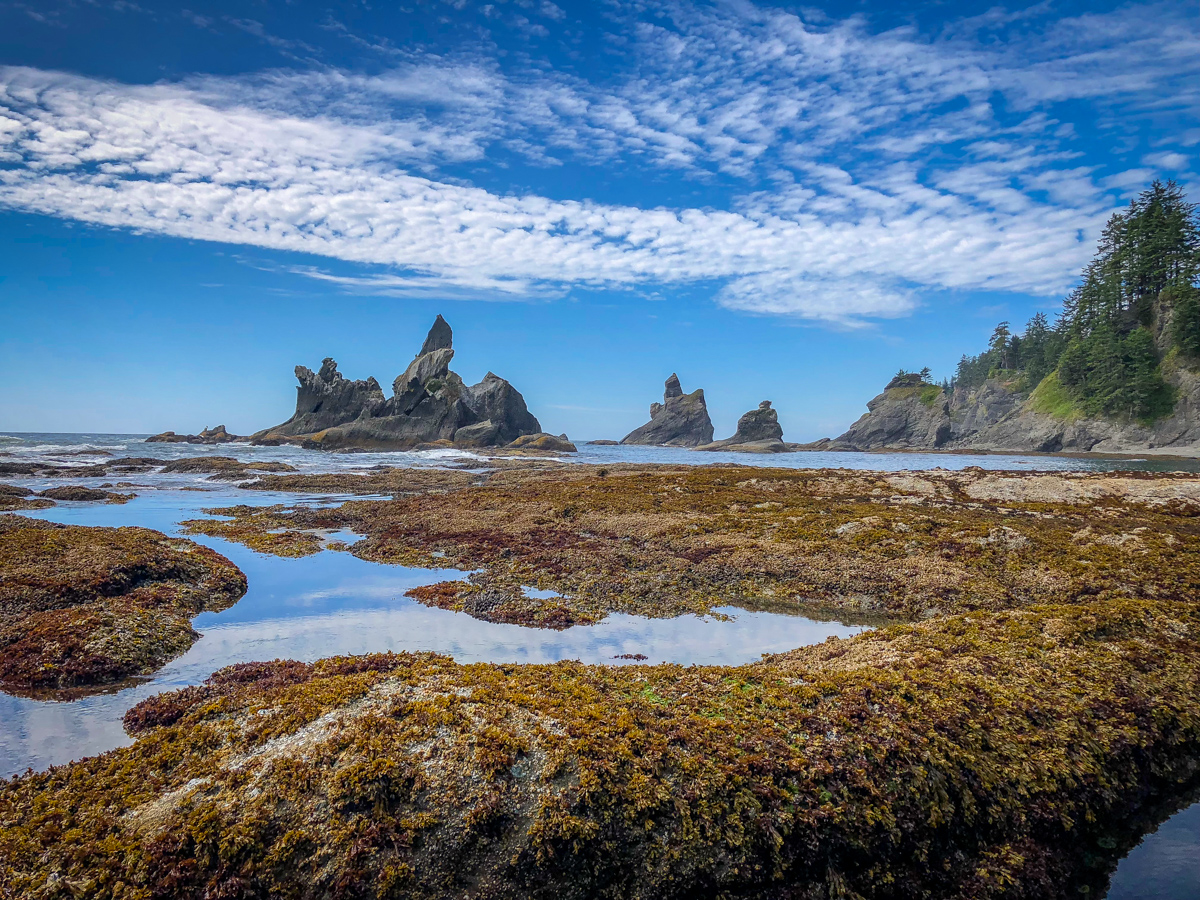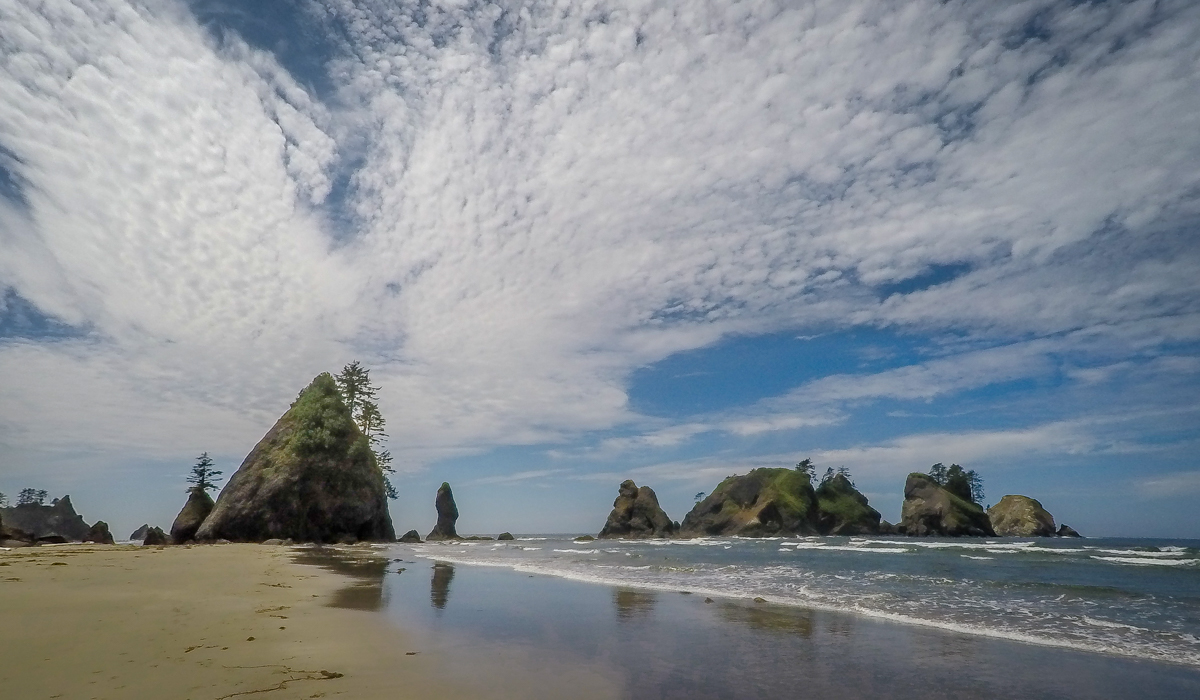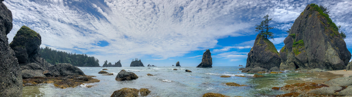 Today we drove out to the wild and rugged Olympic Coast and Shi Shi Beach to hike the 8 miles round trip to the Point of Arches. We had to stop at the Museum in Neah Bay to purchase the Makah Recreation Pass a permit for the trail. We arrived at the Trailhead and started our hike along the recently-rehabilitated trail for a mile winding through brushy clearcut and groves of Sitka spruce. We crossed over several bridges and boardwalks, but then the trail got messier and almost always muddy and wet. But shortly we were rewarded with the site of Shi Shi Beach.