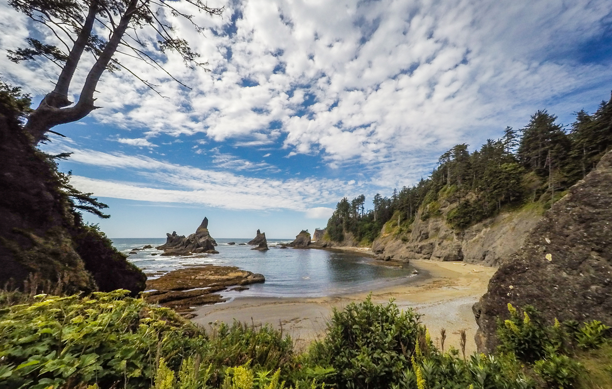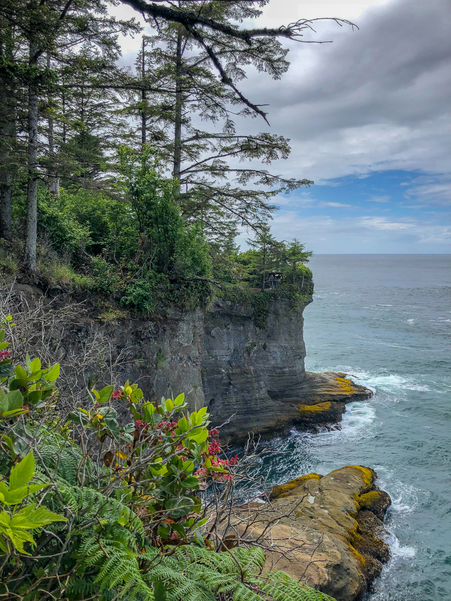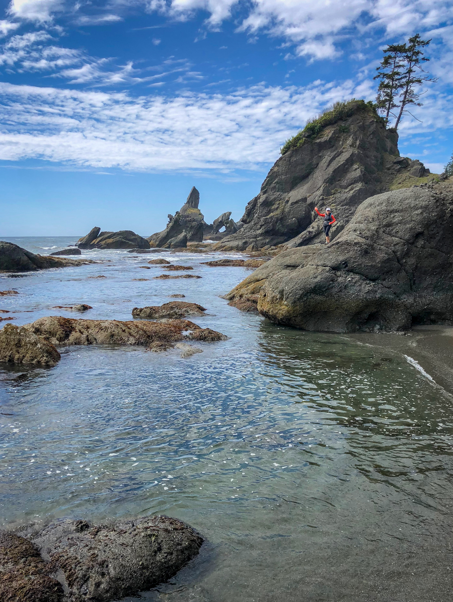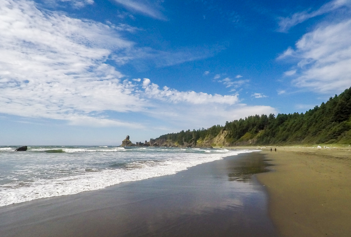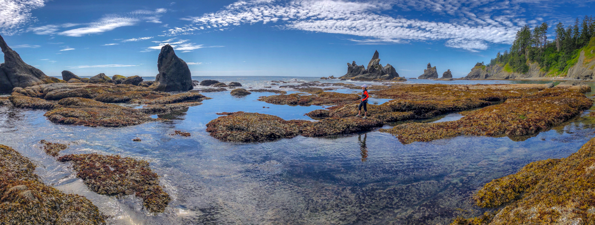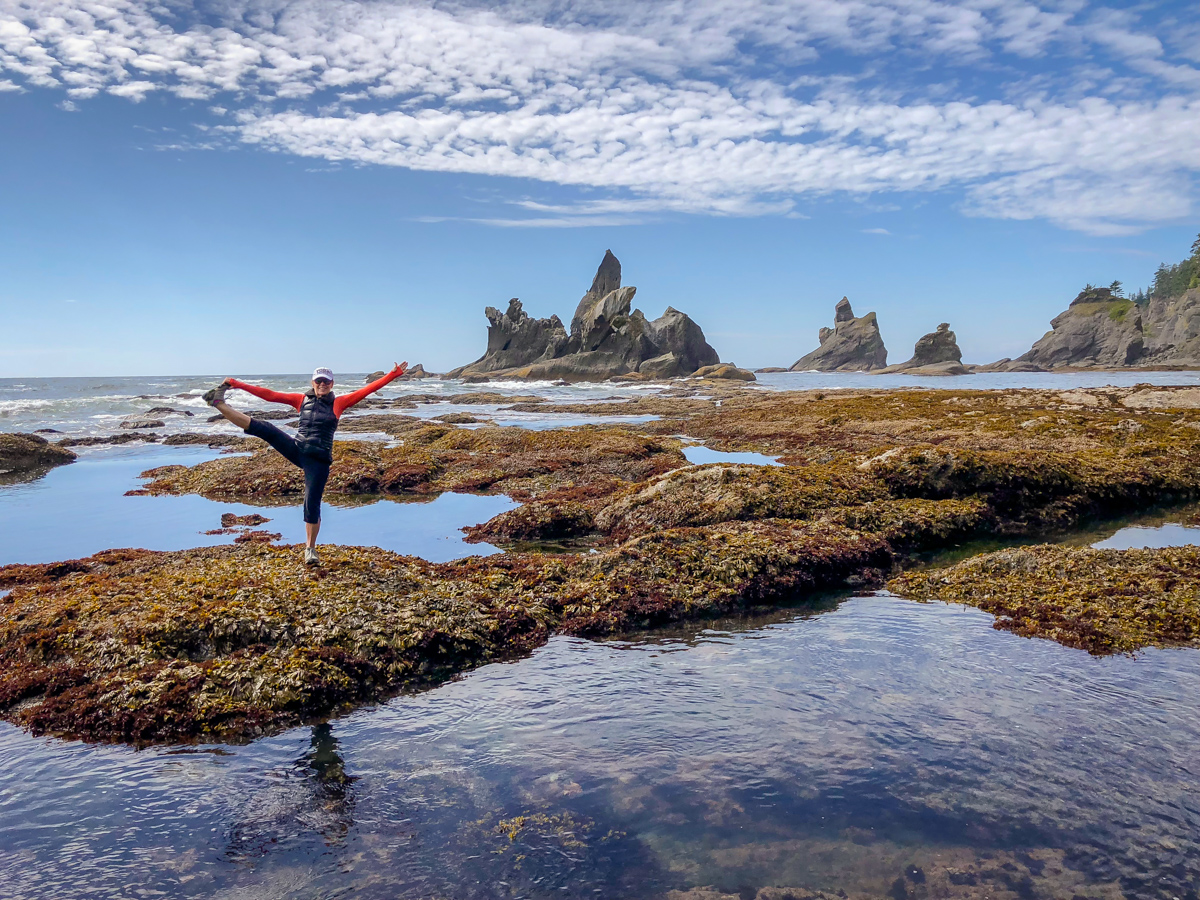 Today we drove out to the wild and rugged Olympic Coast and Shi Shi Beach to hike the 8 miles round trip to the Point of Arches. We had to stop at the Museum in Neah Bay to purchase the Makah Recreation Pass a permit for the trail. We arrived at the Trailhead and started our hike along the recently-rehabilitated trail for a mile winding through brushy clearcut and groves of Sitka spruce. We crossed over several bridges and boardwalks, but then the trail got messier and almost always muddy and wet. But shortly we were rewarded with the site of Shi Shi Beach.