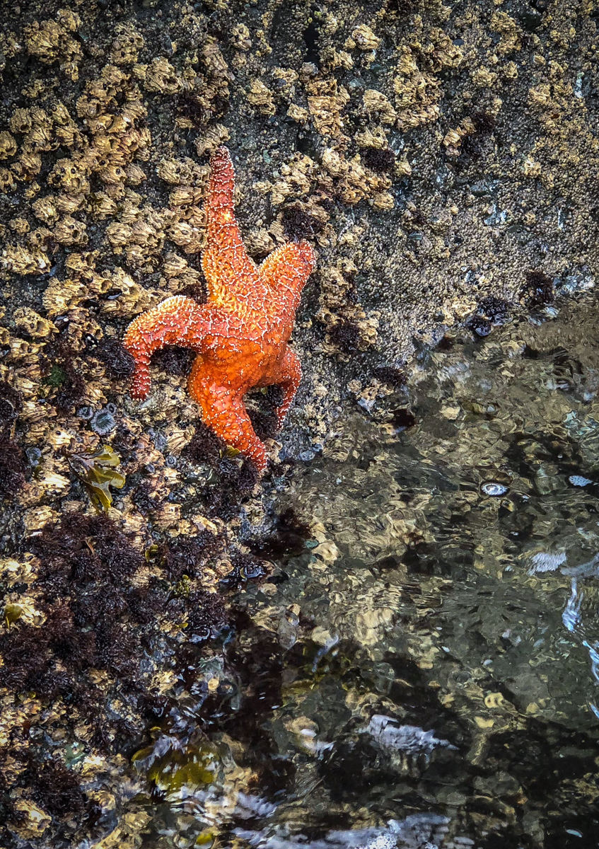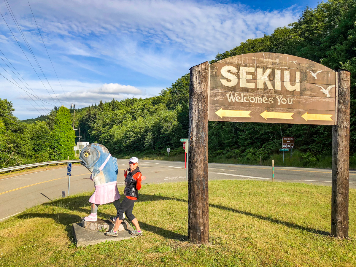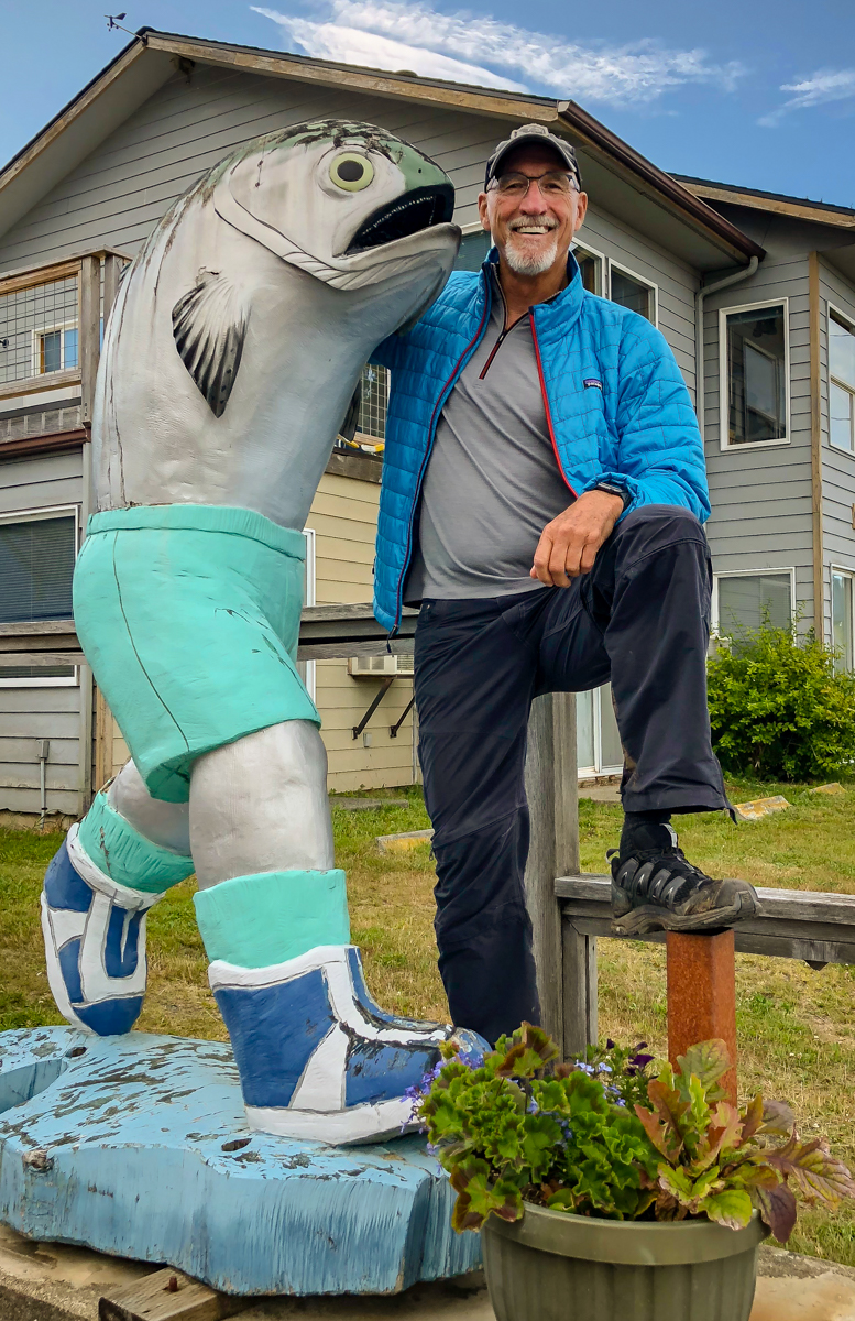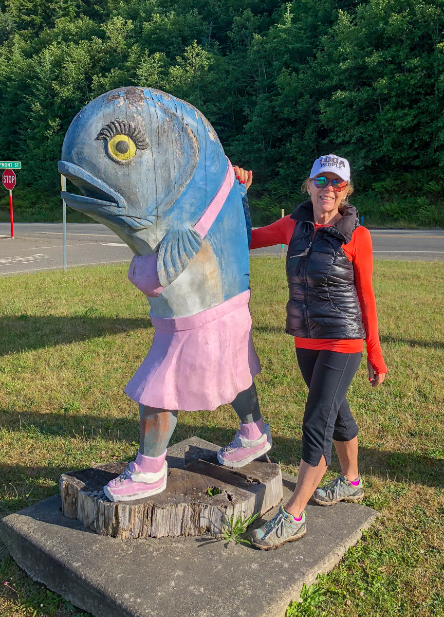 We walked along the beach for 1.3 miles to the Point of Arches, a mile-long parade of rocky sea stacks. We wandered around the tide pools, observing the daily goings on of the resident coastal critters and relished being in one of the most scenic locations in the Northwest. We passed several campsites along the beach in the sheltered forest upslope, where we would love to come back and spend more time here to watch the sunset over the sea stack-strewn Pacific. On the way back we stopped at the small, much-too-isolated fishing village of Sekiu, WA, where we were welcomed by a carved wooden statue of the fish…….. running towards the town of Sekiu while wearing a pink bra and skirt with tennis shoes, named Rosie. We ate fish and chips at By the Bay Cafe, where we found the shorts-and-sneaker-clad running fish boy, Gil, who is probably looking for his running fish girlfriend, Rosie. Click on thumbnail to view images