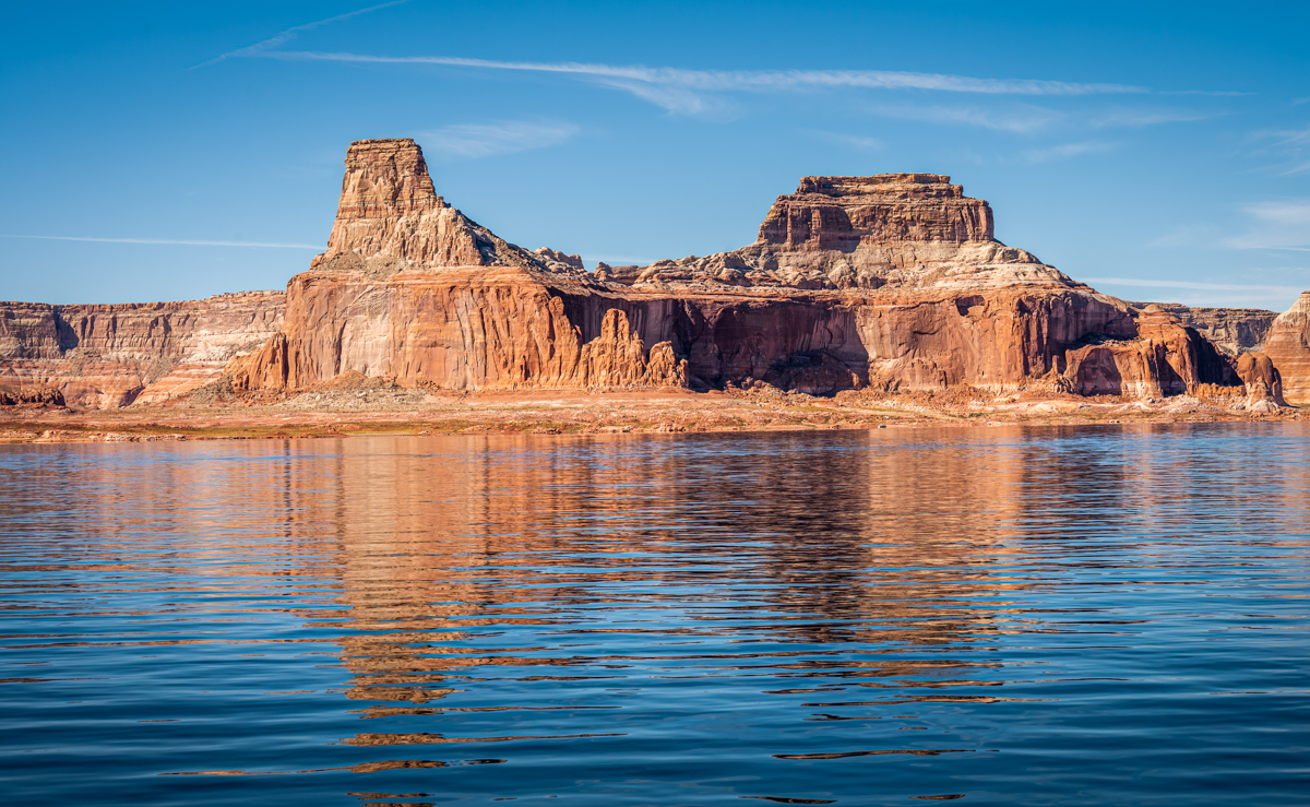 We continued our journey across the lake, taking in the spectacular views of the towering cliffs and buttes that lined the shore. The reflections of the landscape on the calm waters of the lake were truly stunning.