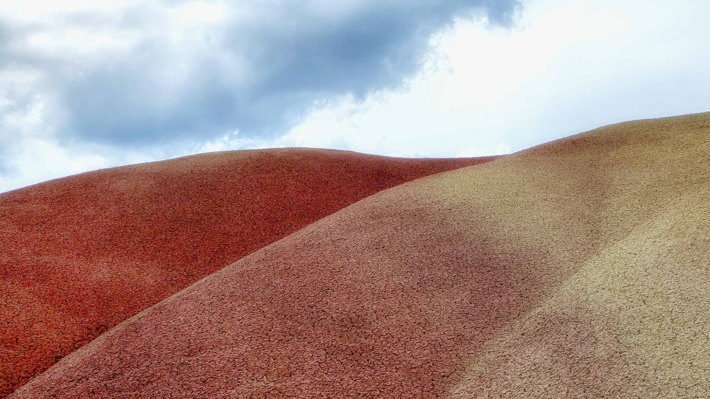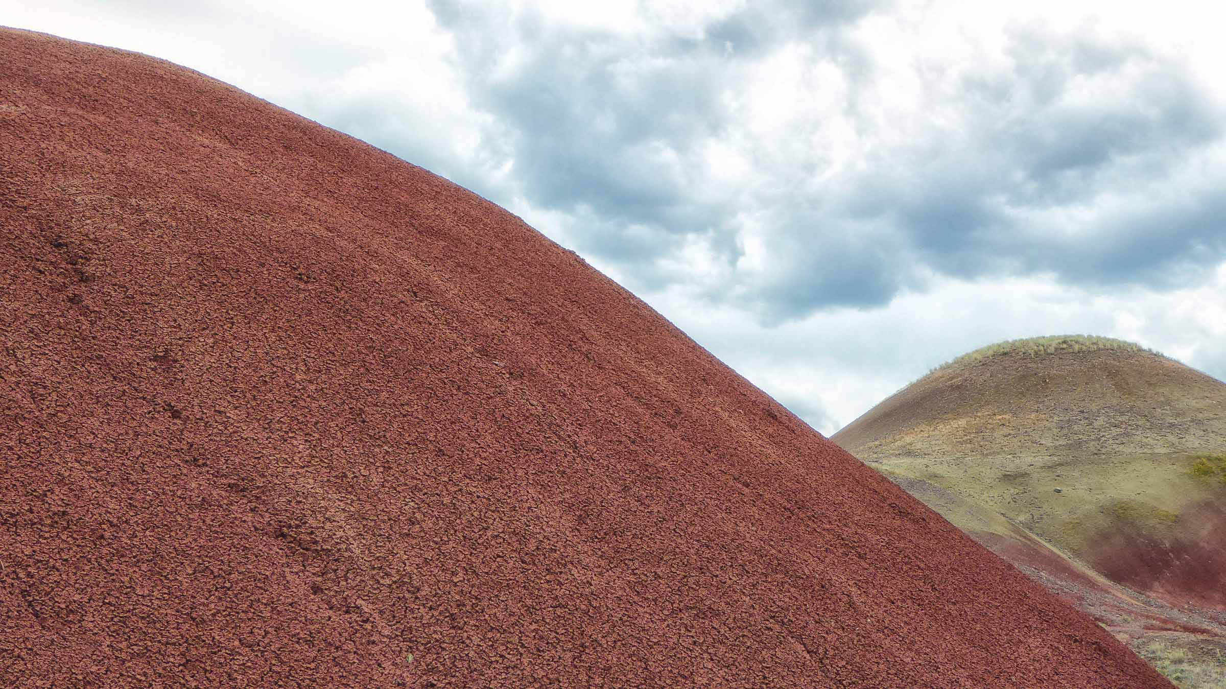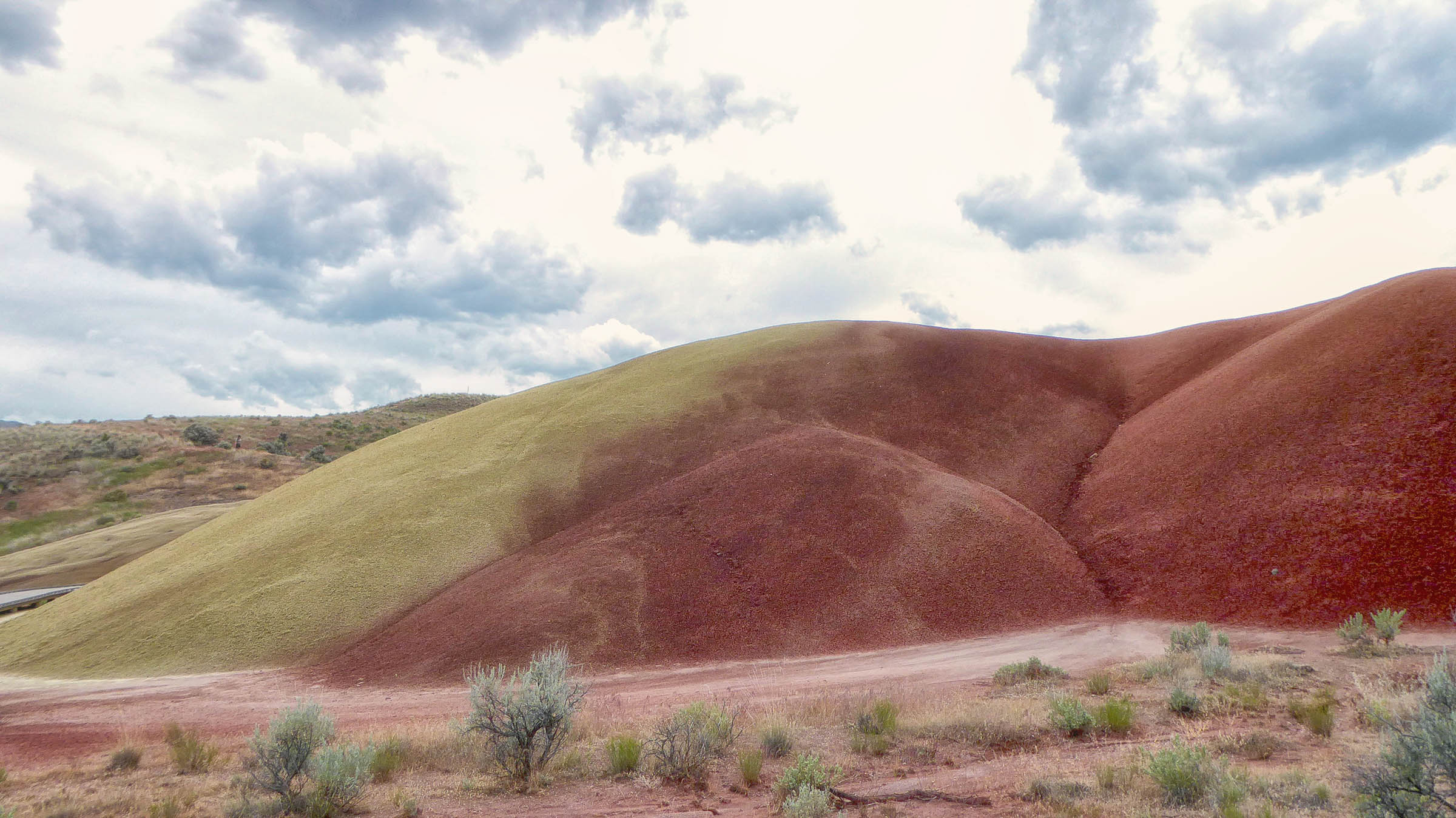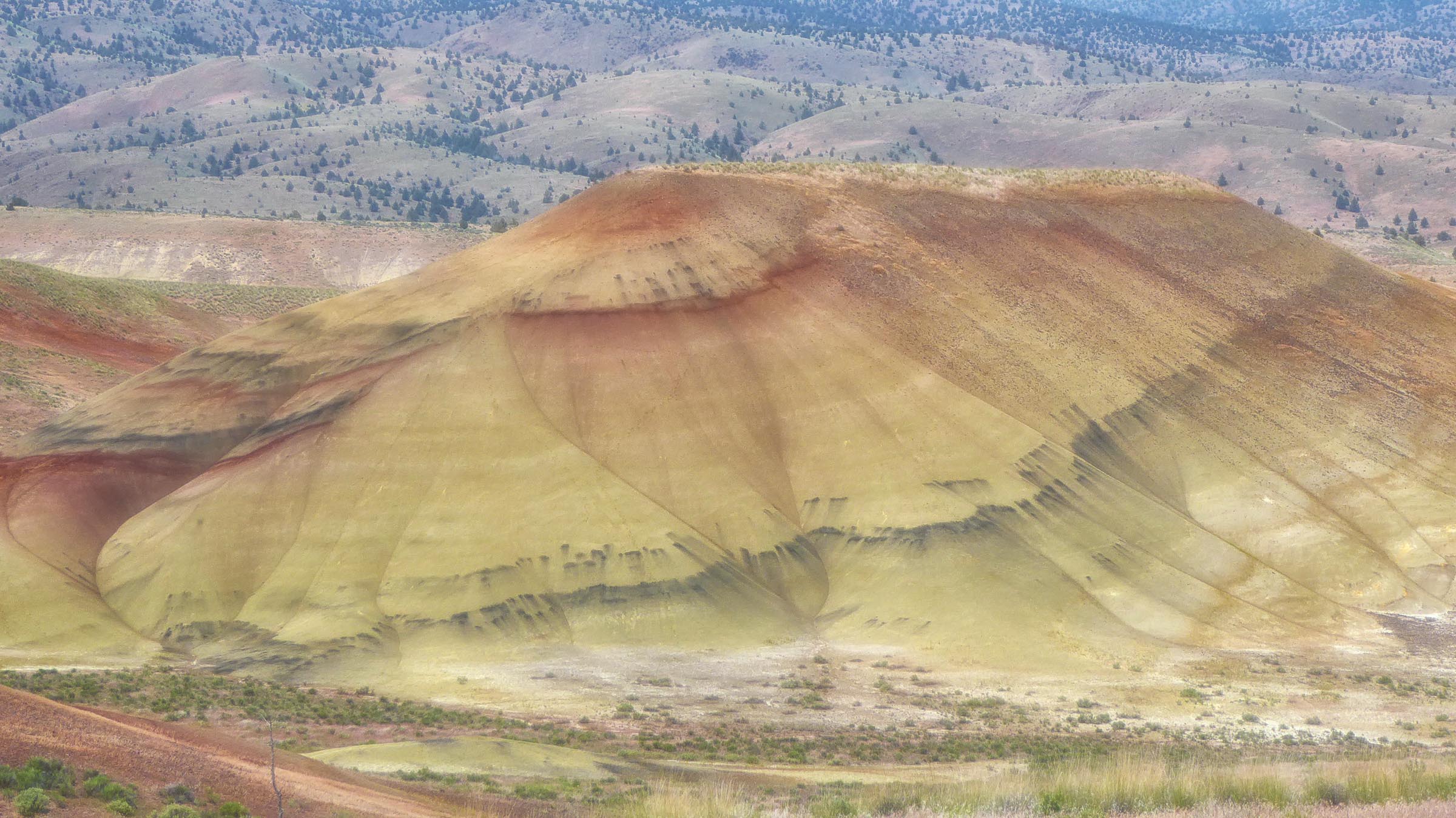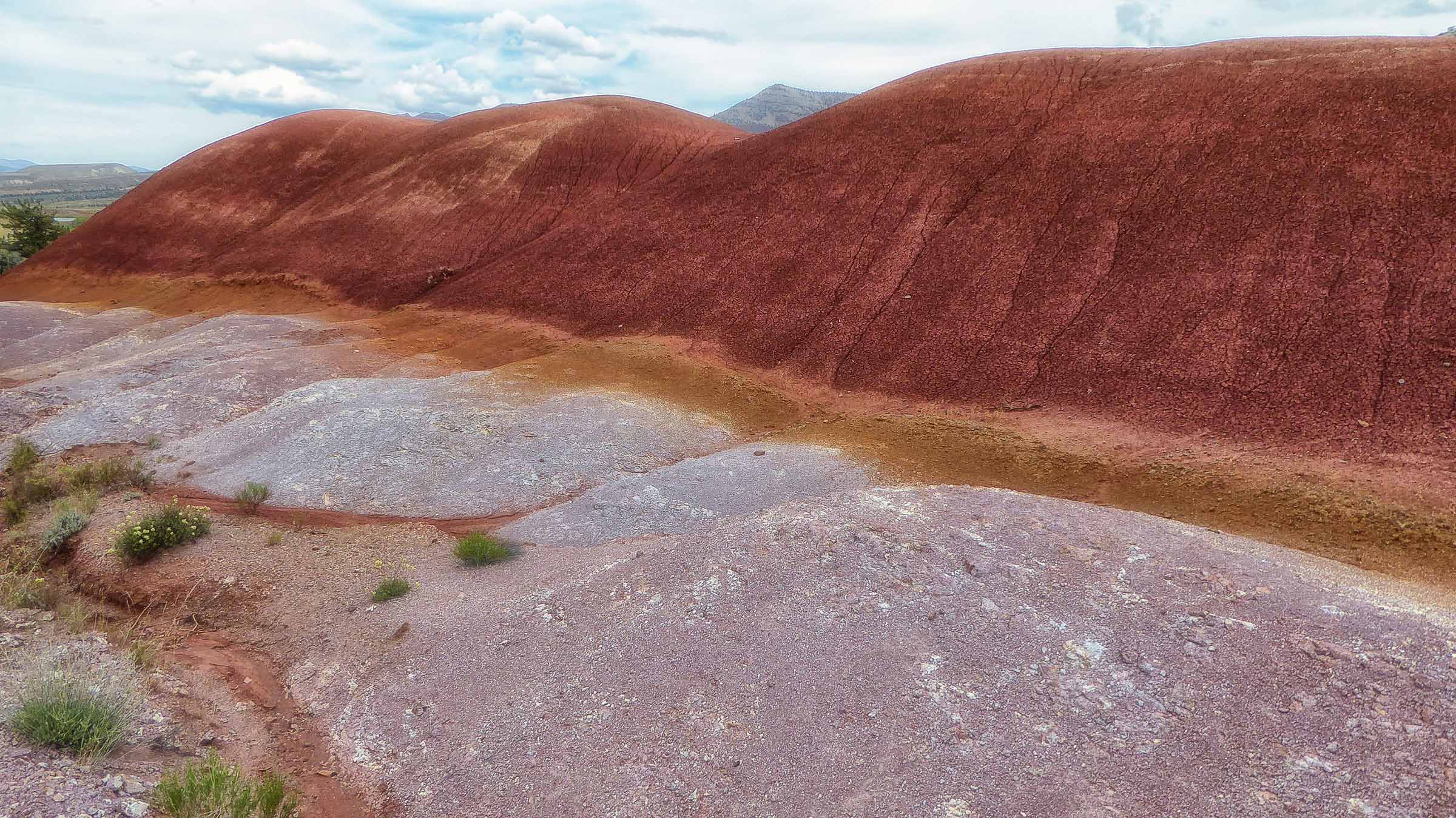 T’S MY BIRTHDAY!! The day started with presents, cards and phone calls with my kids. So grateful for my wonderful family! Then it was off to Painted Hills State Park which is a 2 hour drive from our Park. The guide book said “GO……this is an Oregon must see!” First we walked up the Painted Hills Overlook Trail for wonderful views of the colorful hills, the yellows, golds, reds and the fabulous black streaking stood out in the changing light of the day. Then to the Painted Cove Nature Trail with a board walk amongst the red, orange, yellow and lavender hills. Yes, the lavender-gray layer is ” highly weathered remains of a rhyolite lava flow”, and is about 40 million years old. The only problem is that nothing grows on these hills, they are inhospitable to plants, but the colors are so brilliant that it makes up for the lack of trees and plants. However, we did see many beautiful wild flowers on the walks to the hills. Our last stop was a walk around the Red Hill and an intimate view of a vibrantly painted hill.