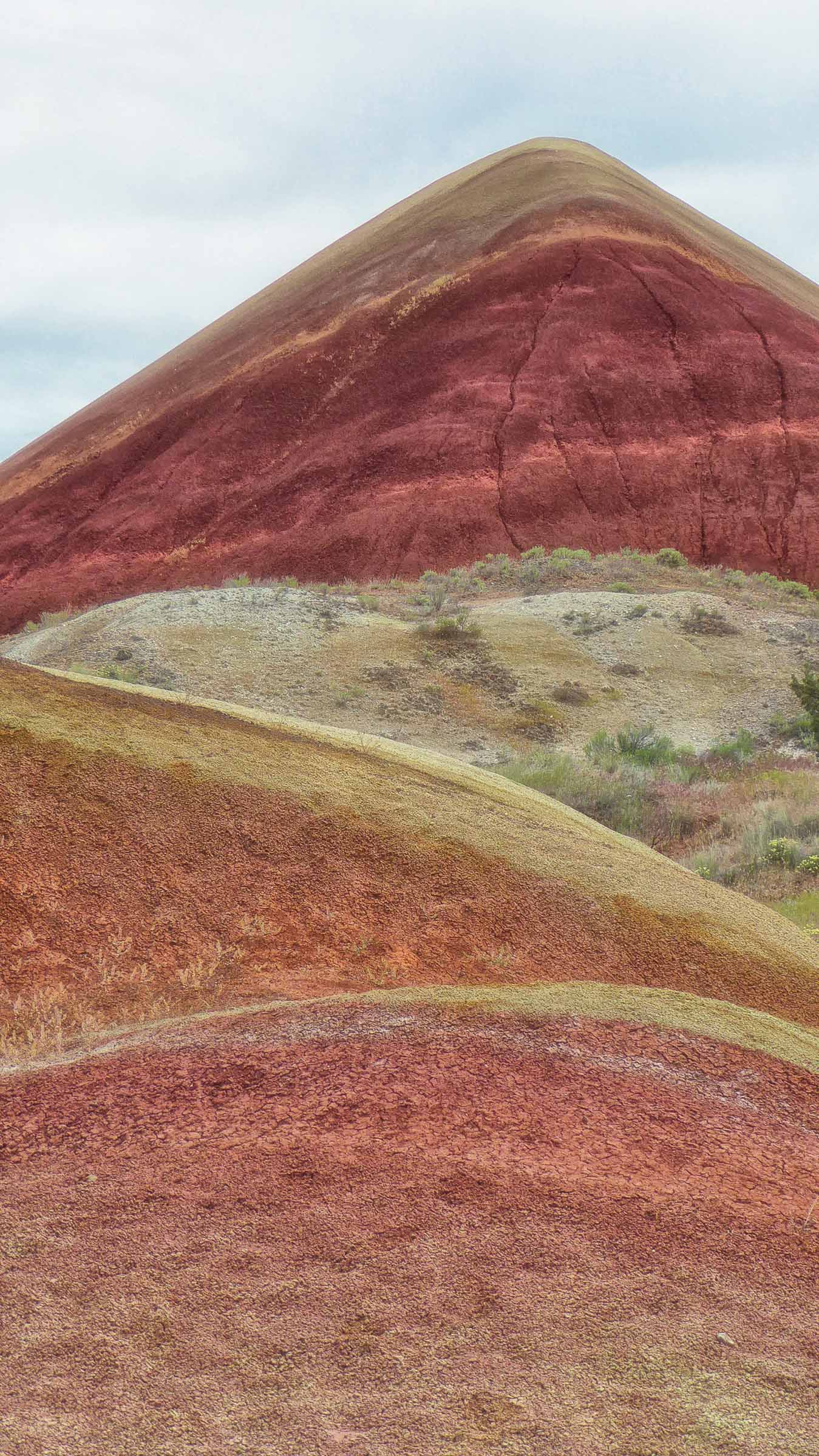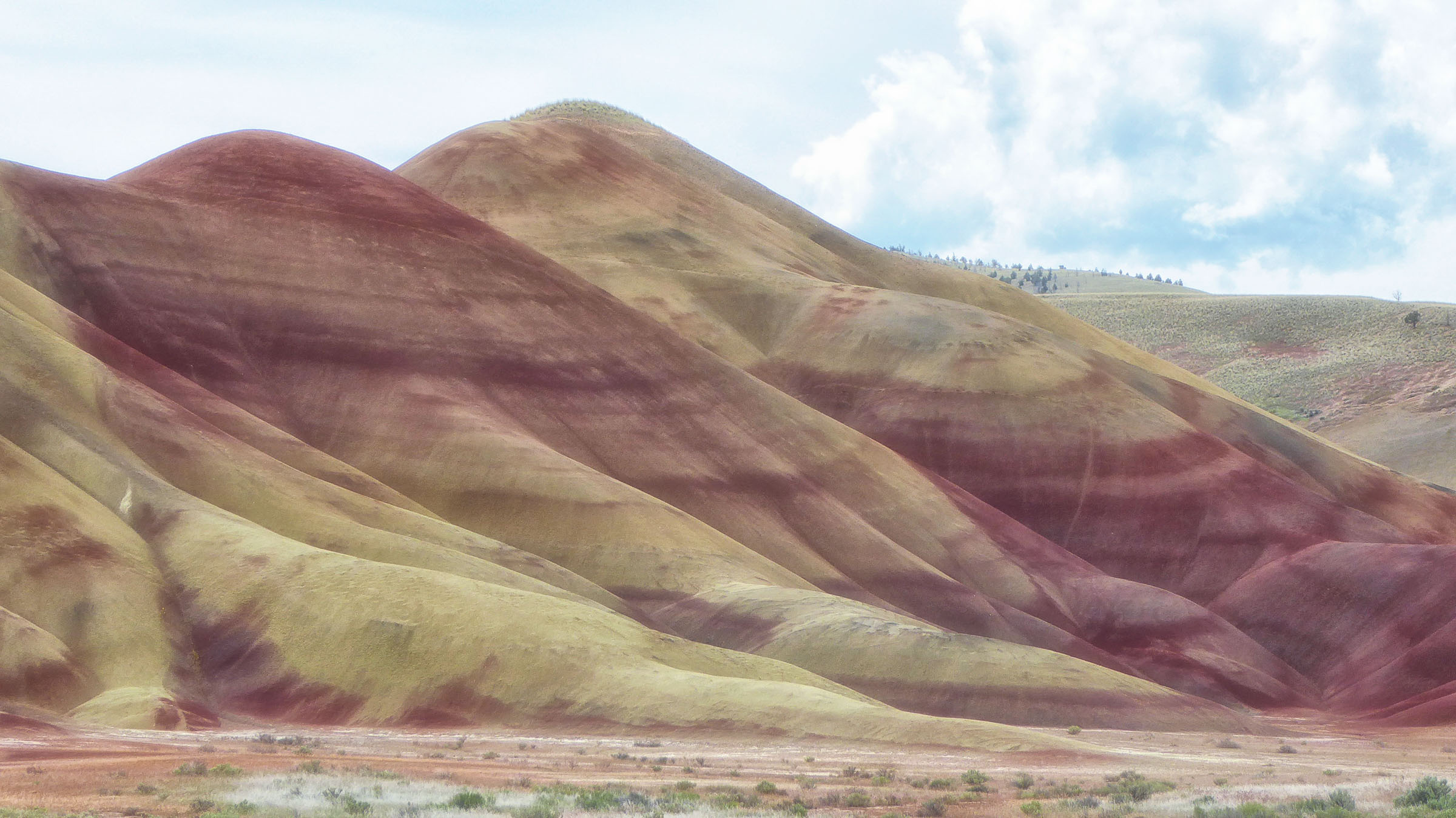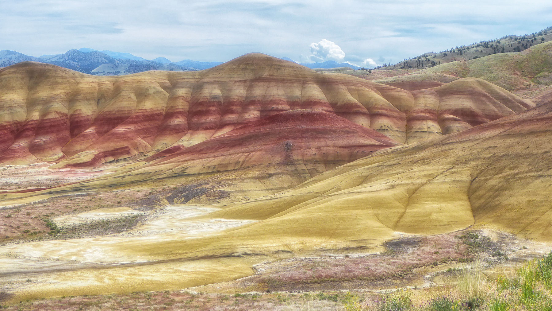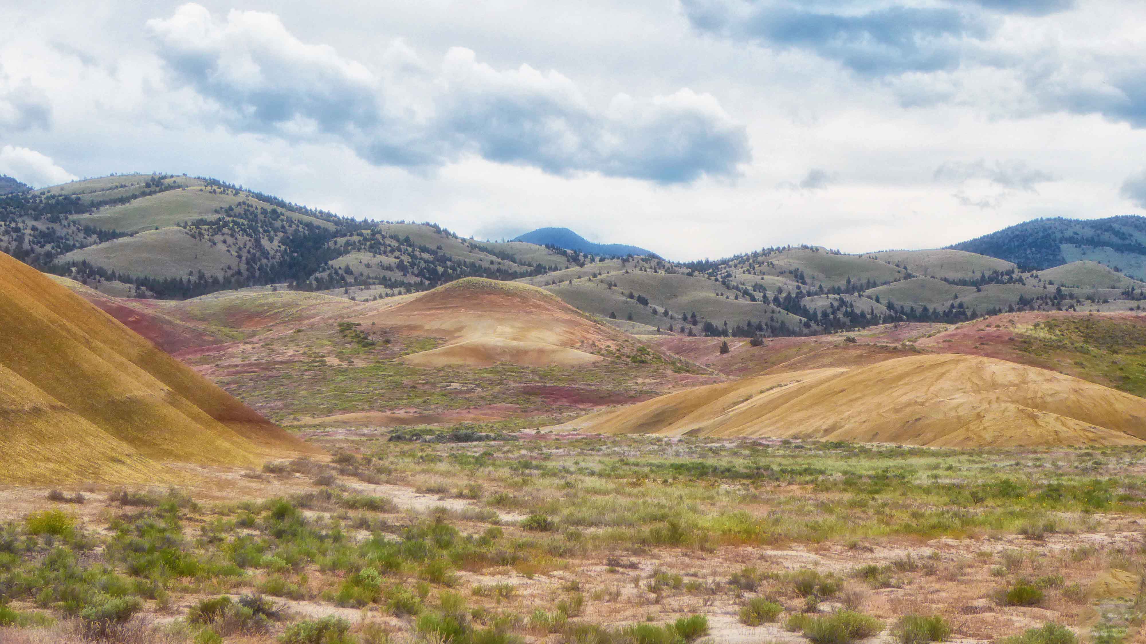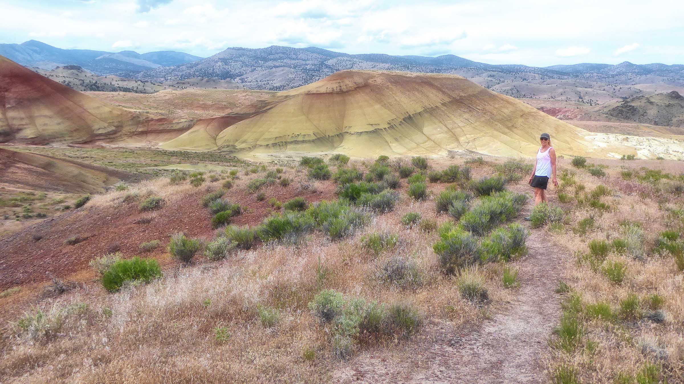 T’S MY BIRTHDAY!! The day started with presents, cards and phone calls with my kids. So grateful for my wonderful family! Then it was off to Painted Hills State Park which is a 2 hour drive from our Park. The guide book said “GO……this is an Oregon must see!” First we walked up the Painted Hills Overlook Trail for wonderful views of the colorful hills, the yellows, golds, reds and the fabulous black streaking stood out in the changing light of the day. Then to the Painted Cove Nature Trail with a board walk amongst the red, orange, yellow and lavender hills. Yes, the lavender-gray layer is ” highly weathered remains of a rhyolite lava flow”, and is about 40 million years old. The only problem is that nothing grows on these hills, they are inhospitable to plants, but the colors are so brilliant that it makes up for the lack of trees and plants. However, we did see many beautiful wild flowers on the walks to the hills. Our last stop was a walk around the Red Hill and an intimate view of a vibrantly painted hill.