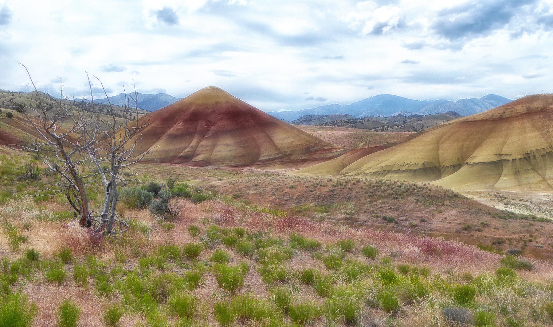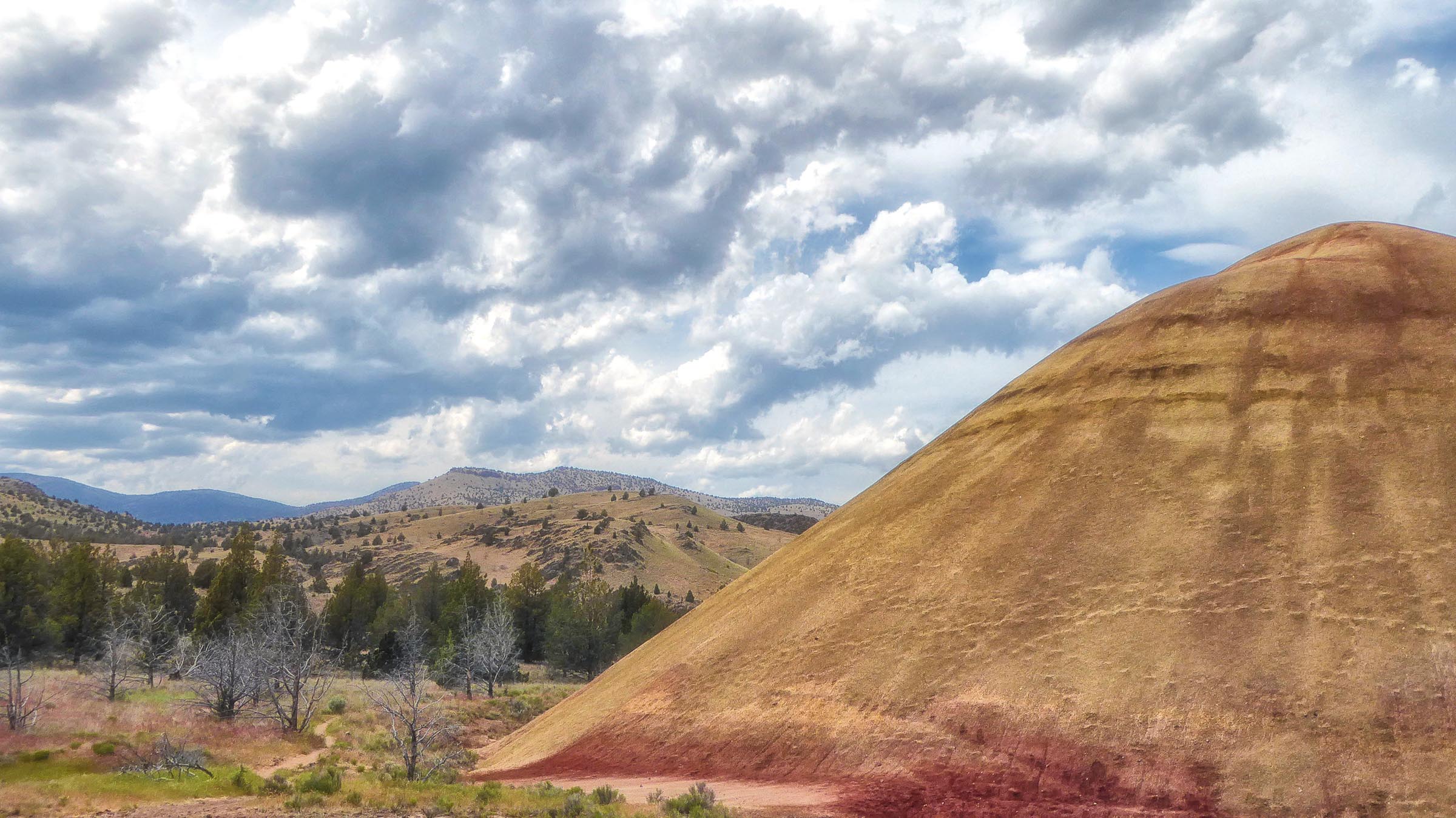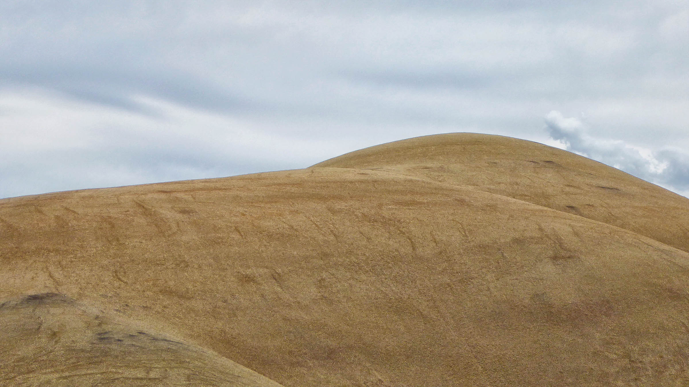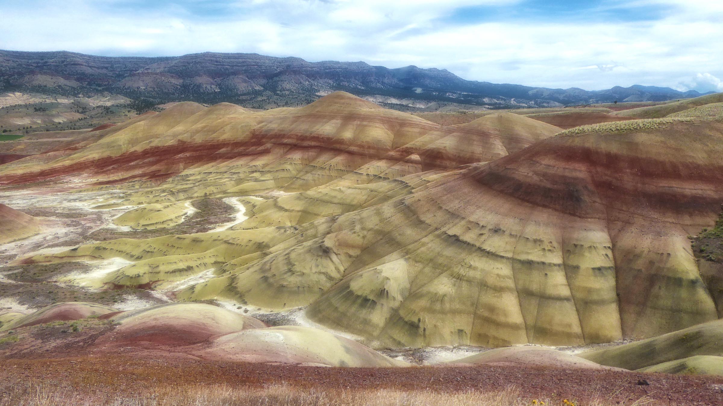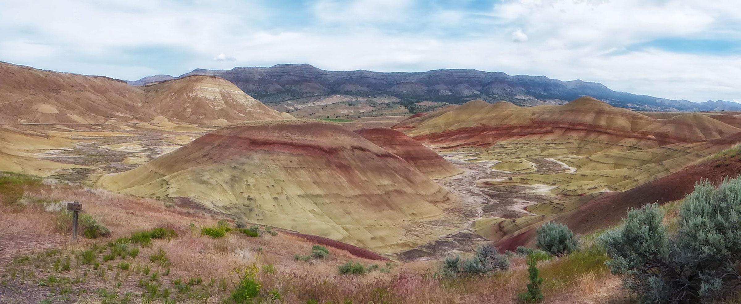 T’S MY BIRTHDAY!! The day started with presents, cards and phone calls with my kids. So grateful for my wonderful family! Then it was off to Painted Hills State Park which is a 2 hour drive from our Park. The guide book said “GO……this is an Oregon must see!” First we walked up the Painted Hills Overlook Trail for wonderful views of the colorful hills, the yellows, golds, reds and the fabulous black streaking stood out in the changing light of the day. Then to the Painted Cove Nature Trail with a board walk amongst the red, orange, yellow and lavender hills. Yes, the lavender-gray layer is ” highly weathered remains of a rhyolite lava flow”, and is about 40 million years old. The only problem is that nothing grows on these hills, they are inhospitable to plants, but the colors are so brilliant that it makes up for the lack of trees and plants. However, we did see many beautiful wild flowers on the walks to the hills. Our last stop was a walk around the Red Hill and an intimate view of a vibrantly painted hill.