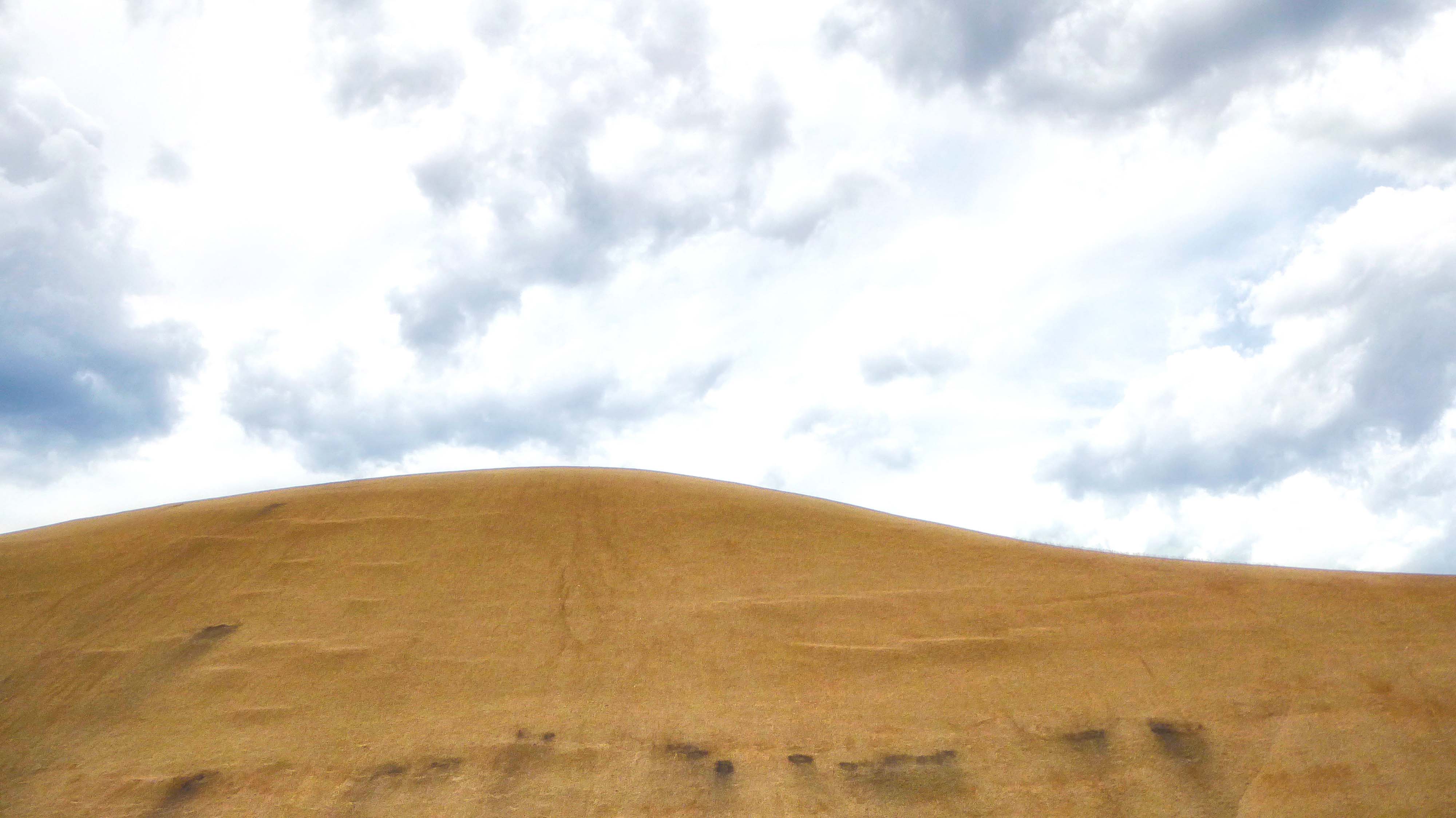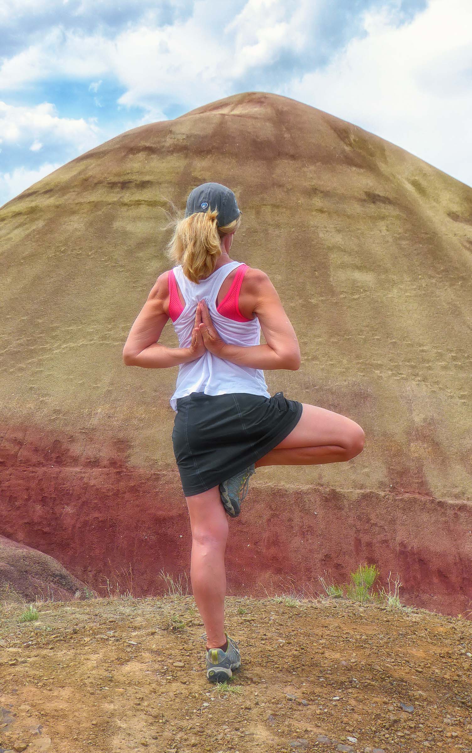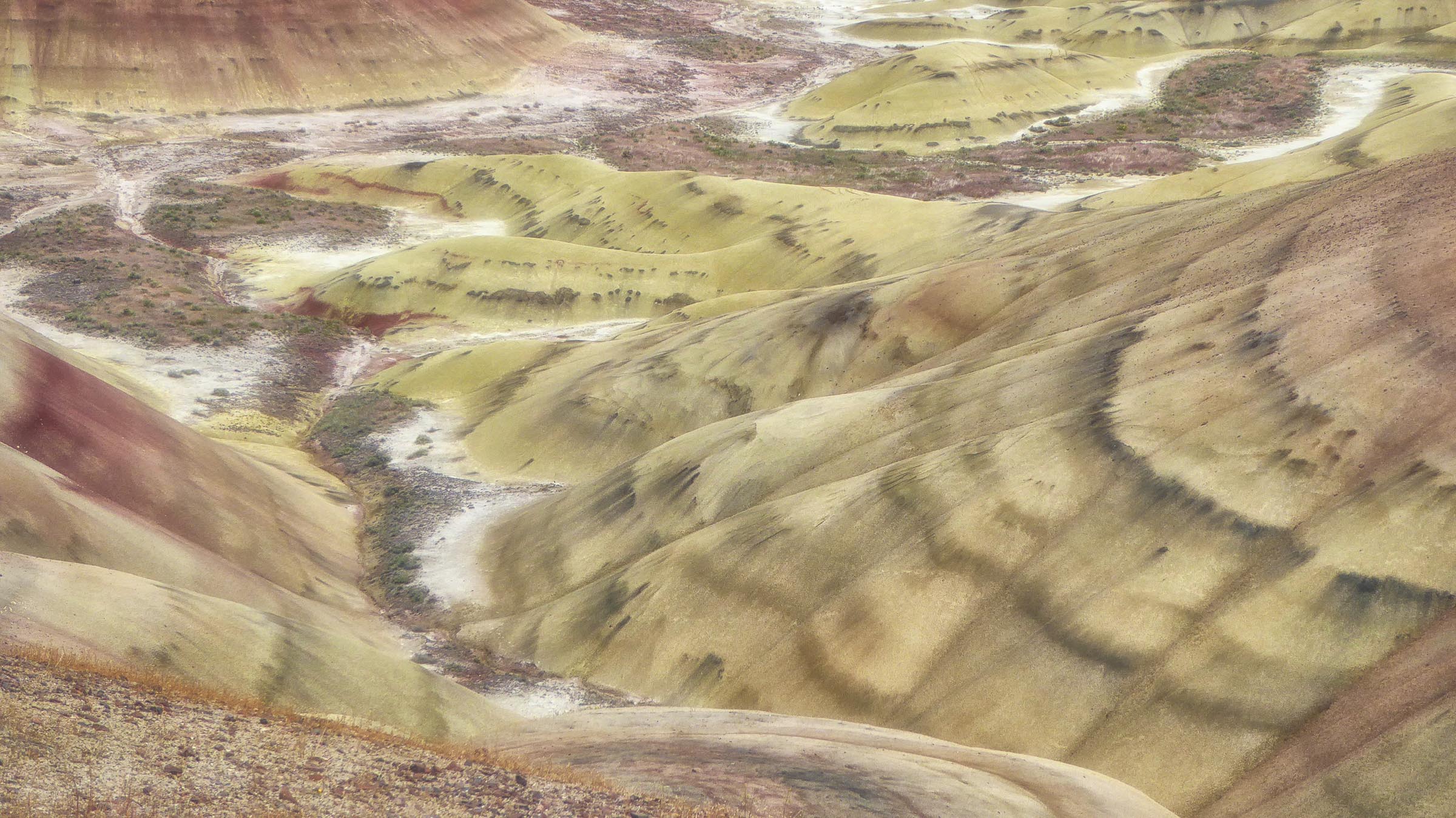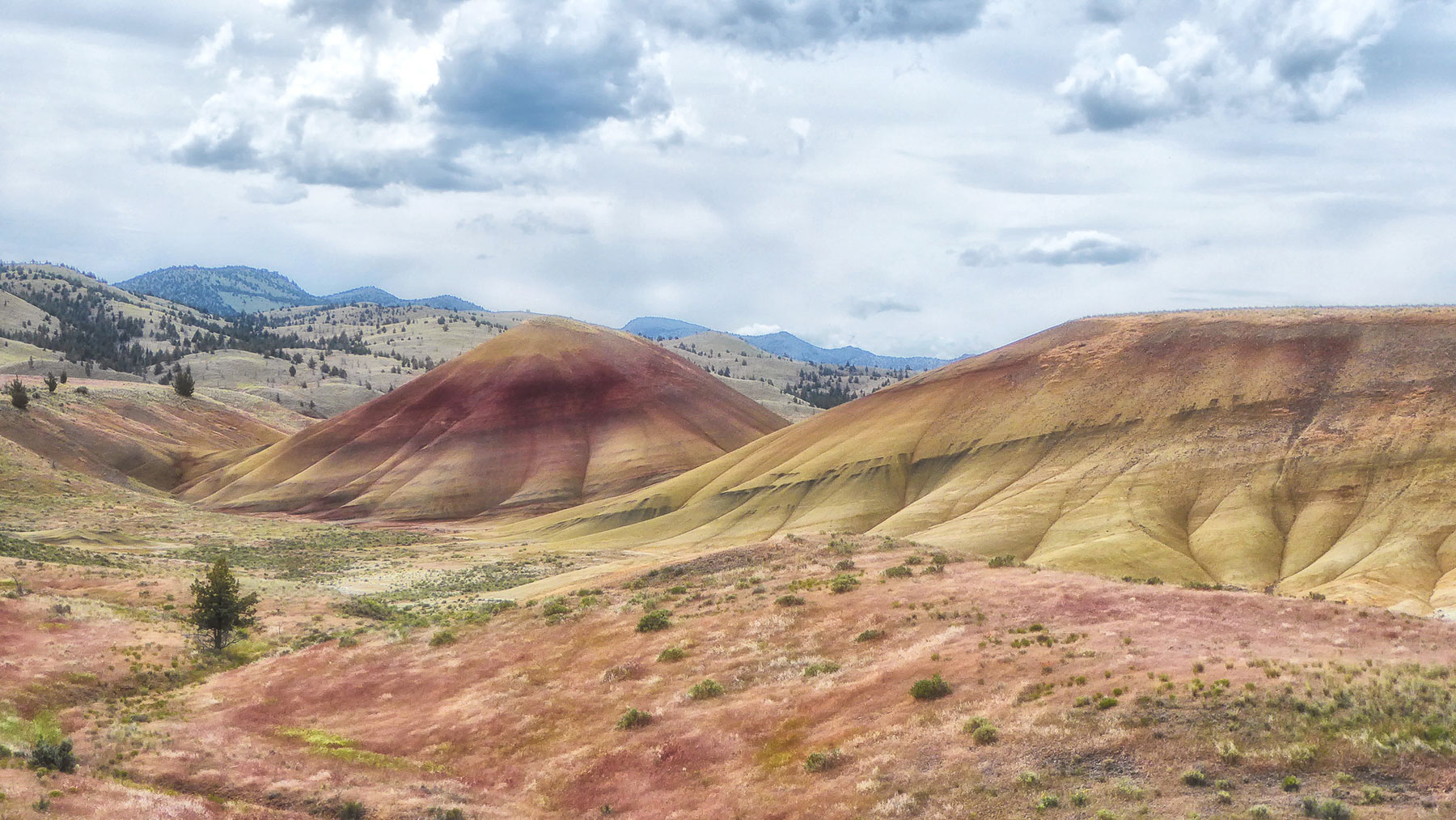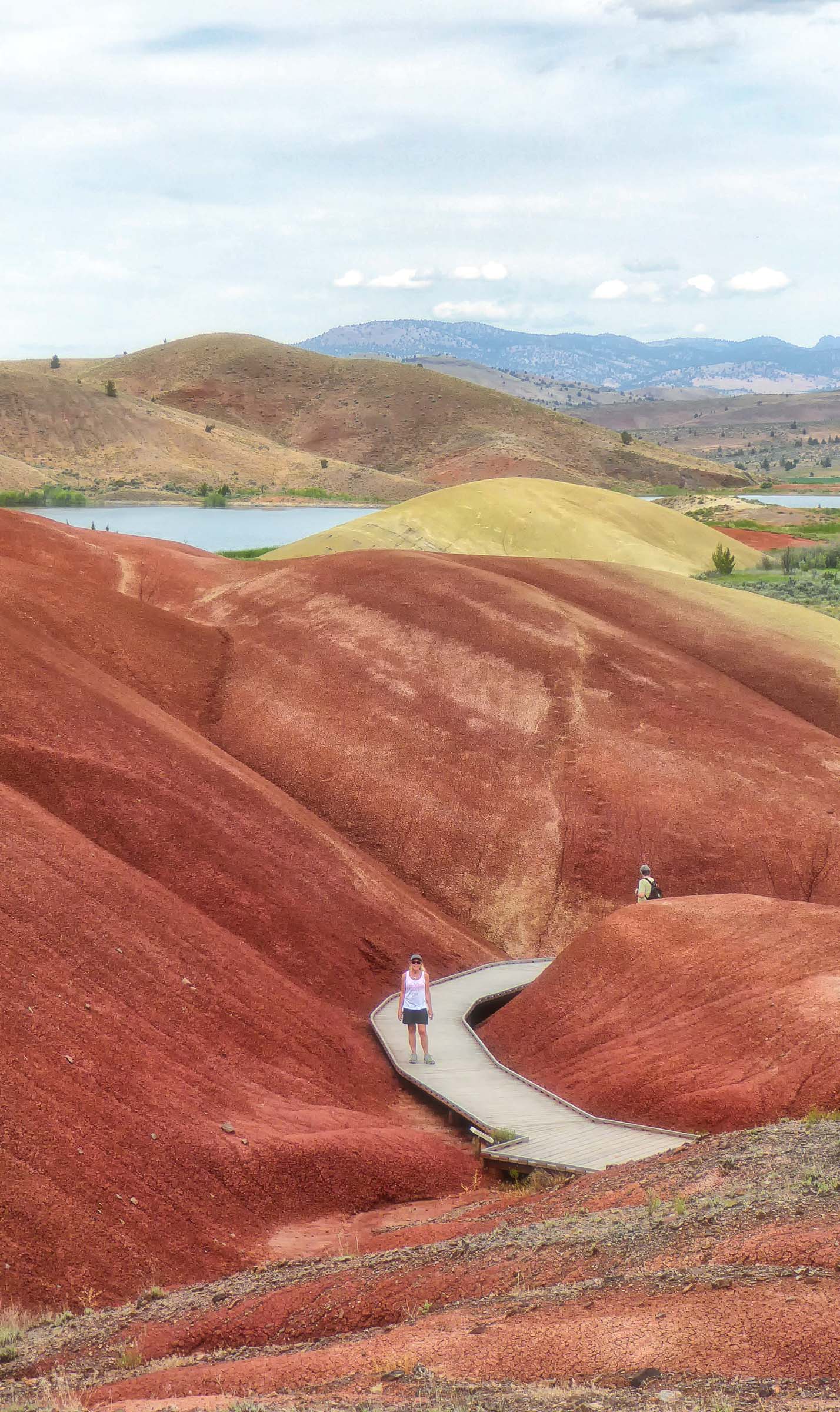 T’S MY BIRTHDAY!! The day started with presents, cards and phone calls with my kids. So grateful for my wonderful family! Then it was off to Painted Hills State Park which is a 2 hour drive from our Park. The guide book said “GO……this is an Oregon must see!” First we walked up the Painted Hills Overlook Trail for wonderful views of the colorful hills, the yellows, golds, reds and the fabulous black streaking stood out in the changing light of the day. Then to the Painted Cove Nature Trail with a board walk amongst the red, orange, yellow and lavender hills. Yes, the lavender-gray layer is ” highly weathered remains of a rhyolite lava flow”, and is about 40 million years old. The only problem is that nothing grows on these hills, they are inhospitable to plants, but the colors are so brilliant that it makes up for the lack of trees and plants. However, we did see many beautiful wild flowers on the walks to the hills. Our last stop was a walk around the Red Hill and an intimate view of a vibrantly painted hill.