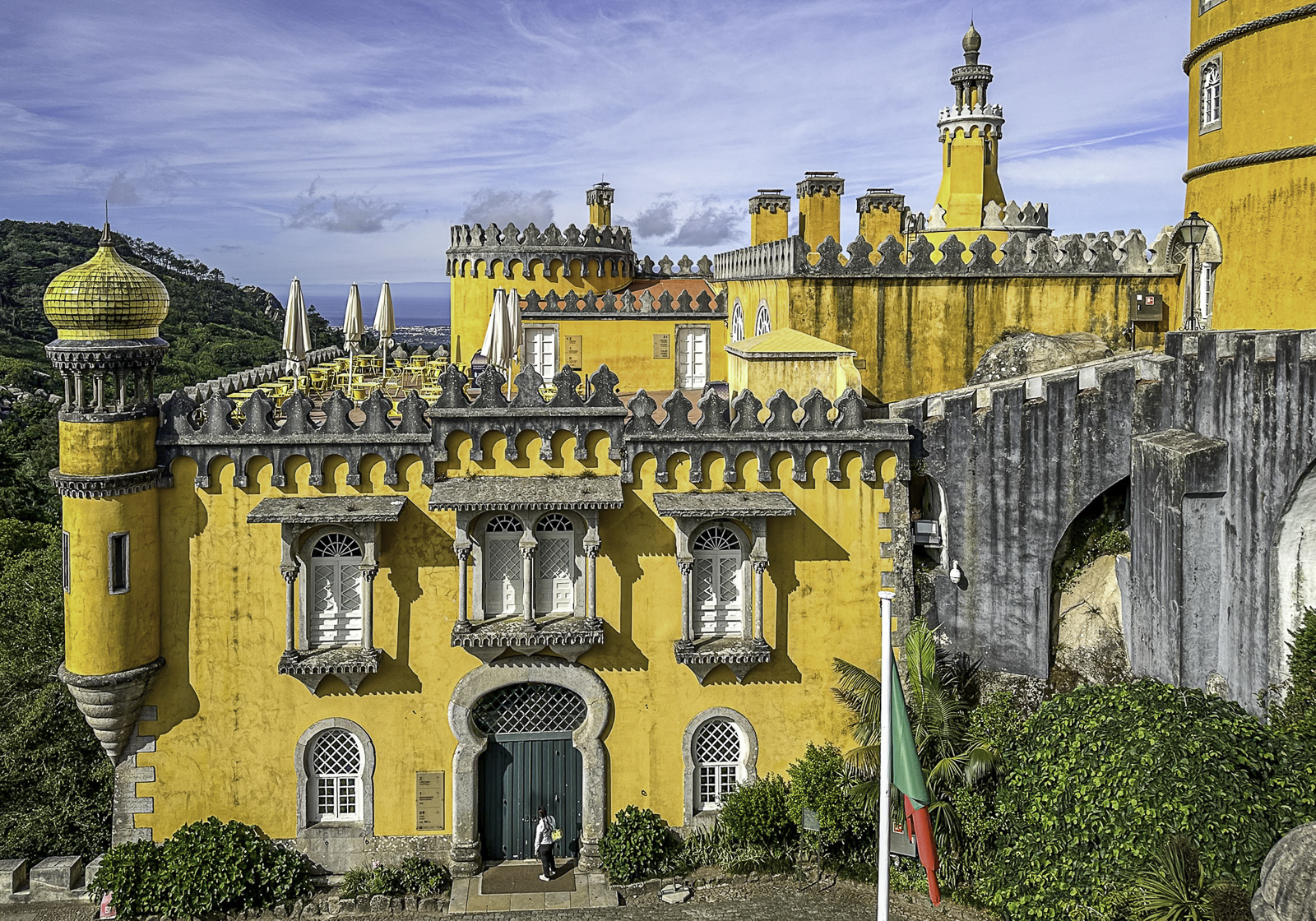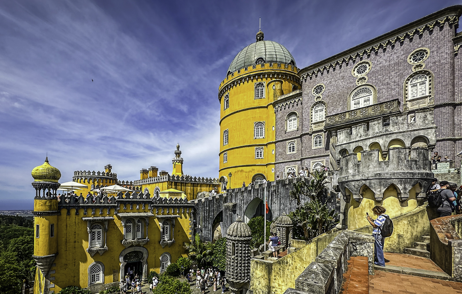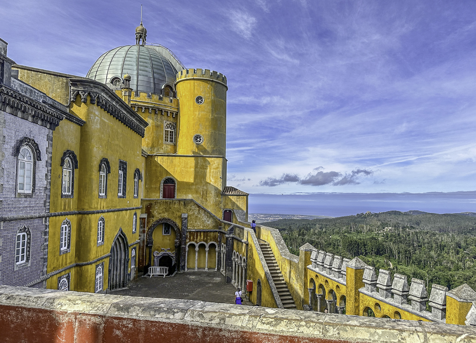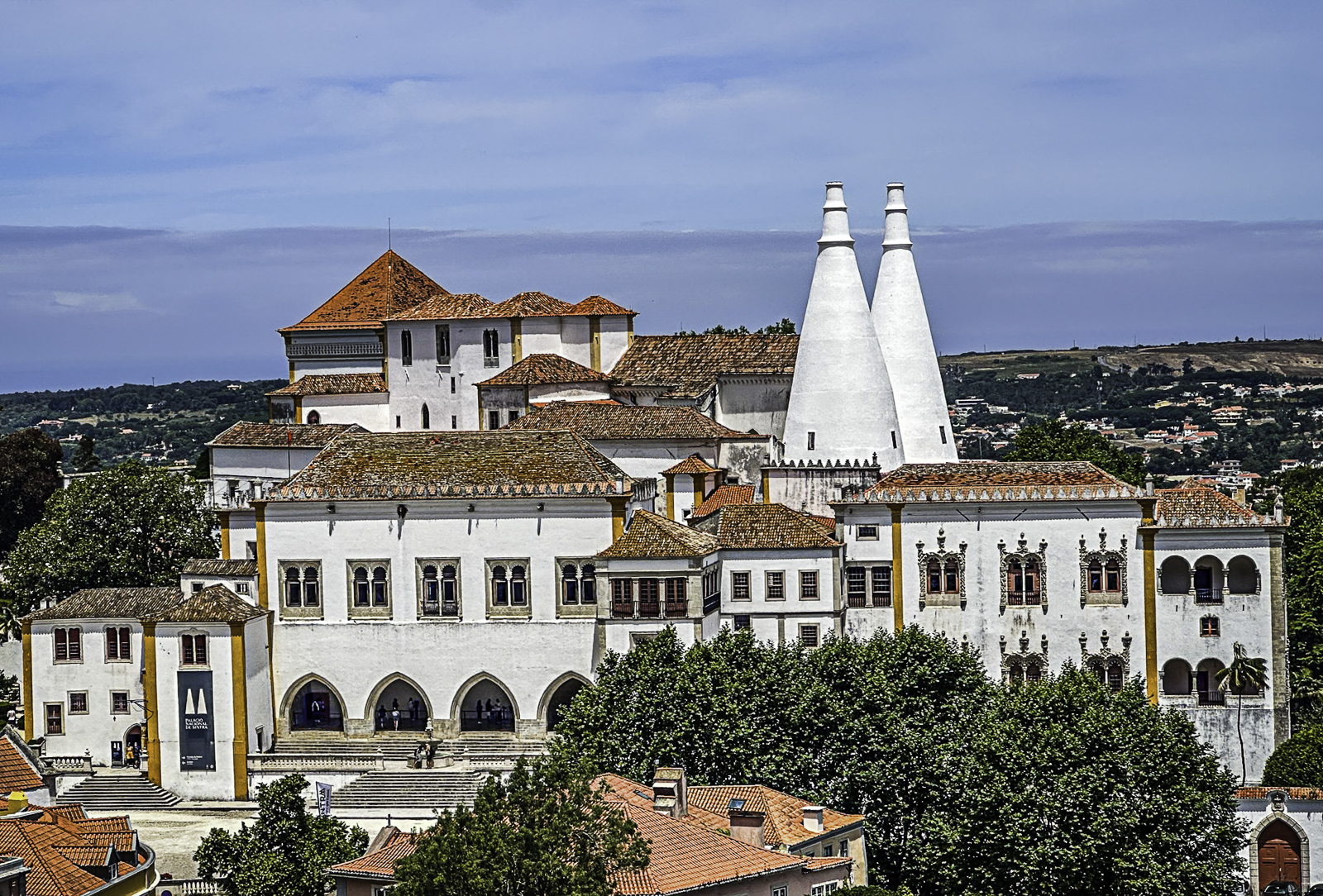 High above the town, the Moorish Castle offers sweeping views over the Atlantic and surrounding countryside. Nearby, the vivid Pena Palace—a 19th-century Romantic creation blending Gothic, Manueline, and Moorish styles—rises from dramatic mountaintop forests. In the valley below, the National Palace of Sintra, with its iconic conical chimneys, preserves centuries of royal life from the medieval through the Renaissance eras.