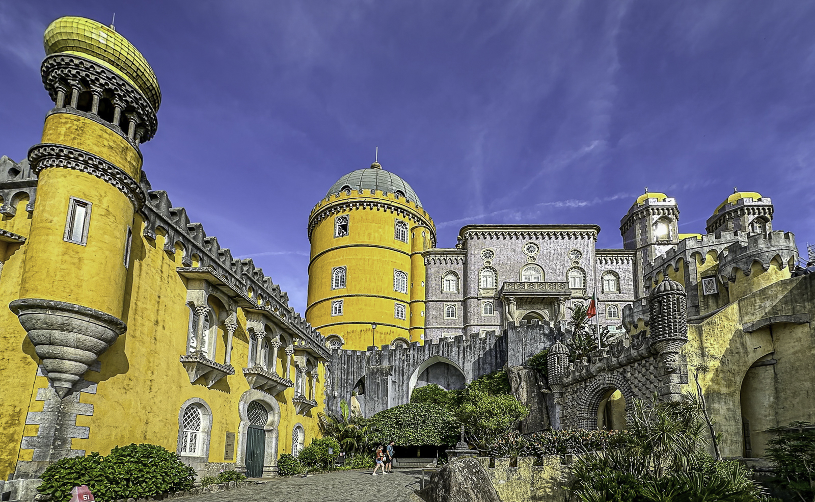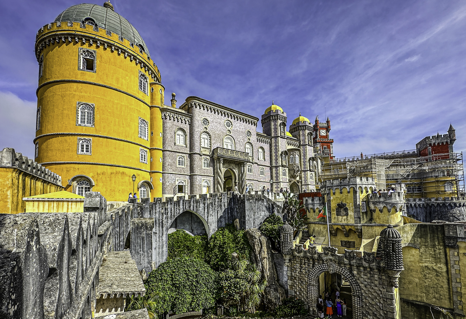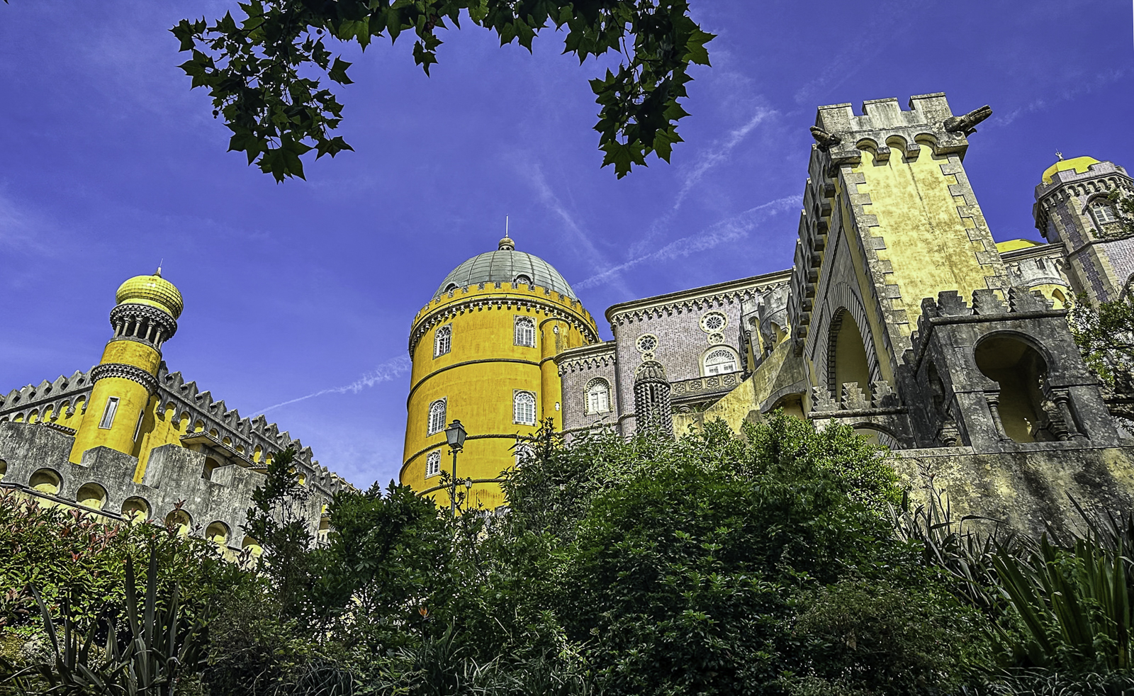 High above the town, the Moorish Castle offers sweeping views over the Atlantic and surrounding countryside. Nearby, the vivid Pena Palace—a 19th-century Romantic creation blending Gothic, Manueline, and Moorish styles—rises from dramatic mountaintop forests. In the valley below, the National Palace of Sintra, with its iconic conical chimneys, preserves centuries of royal life from the medieval through the Renaissance eras.