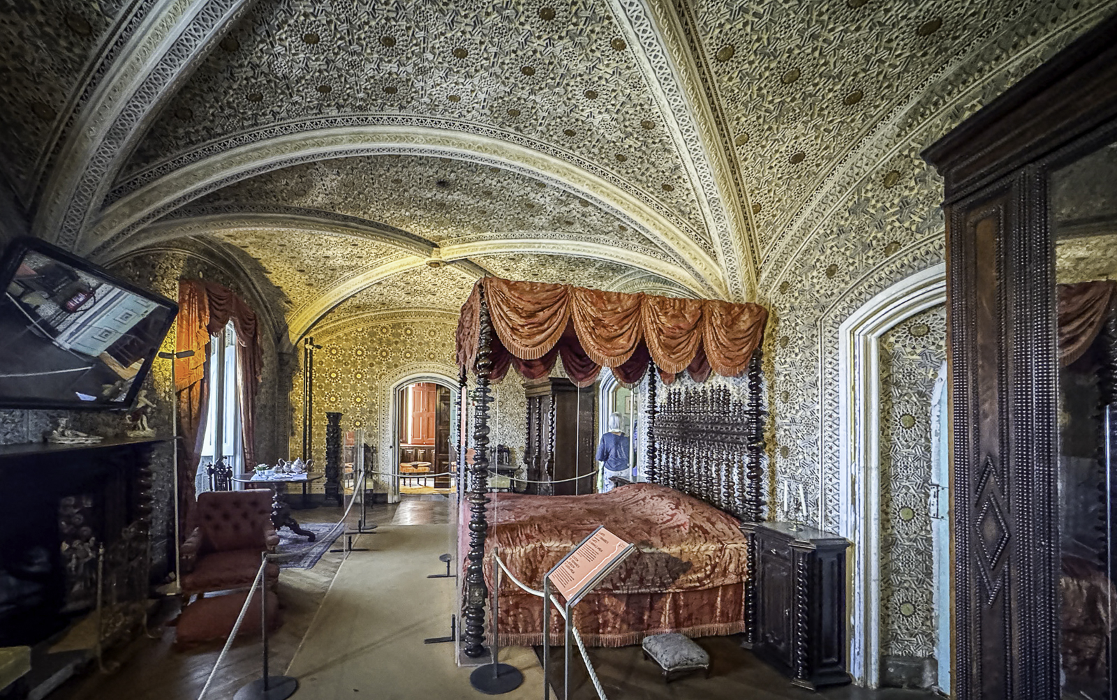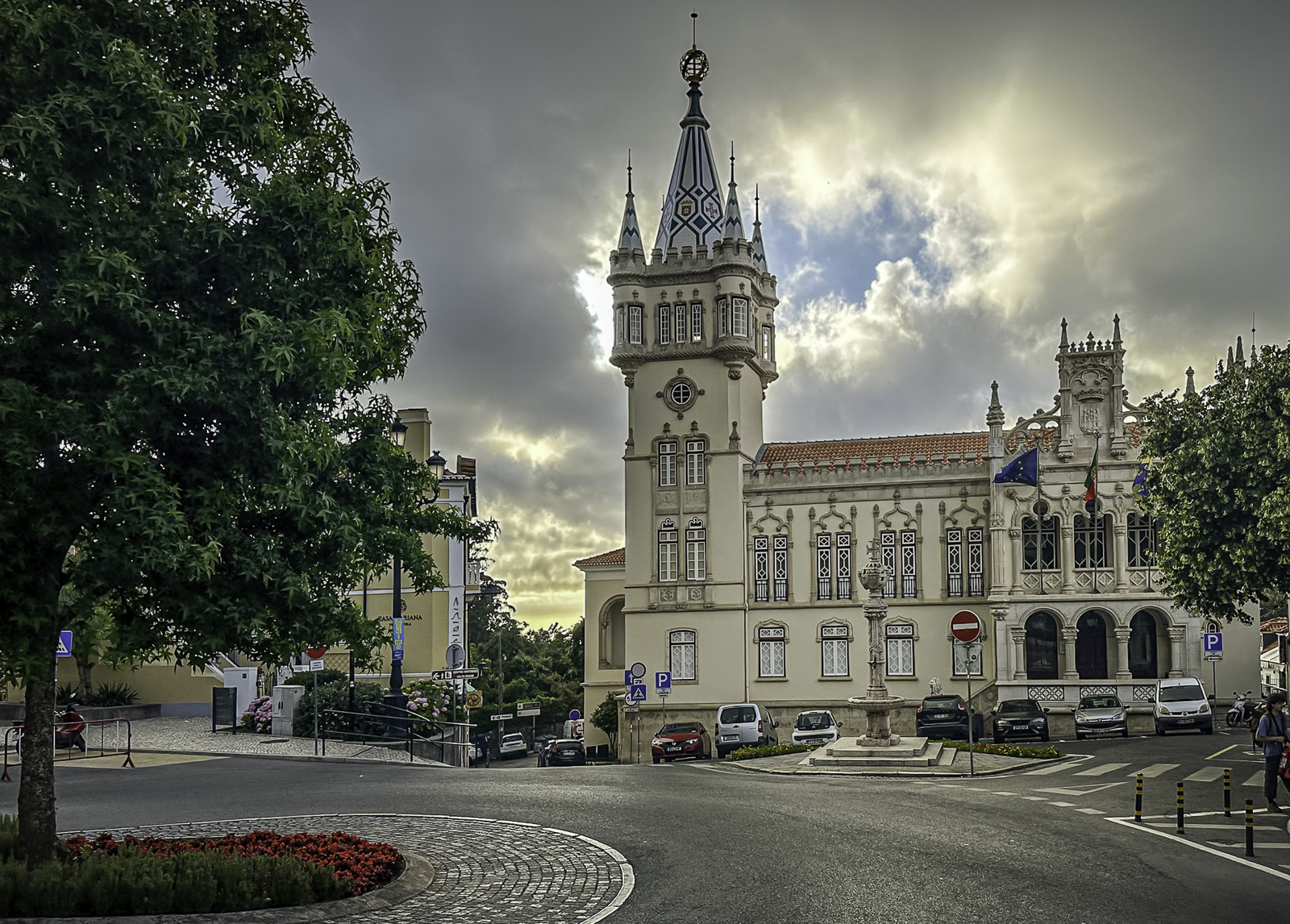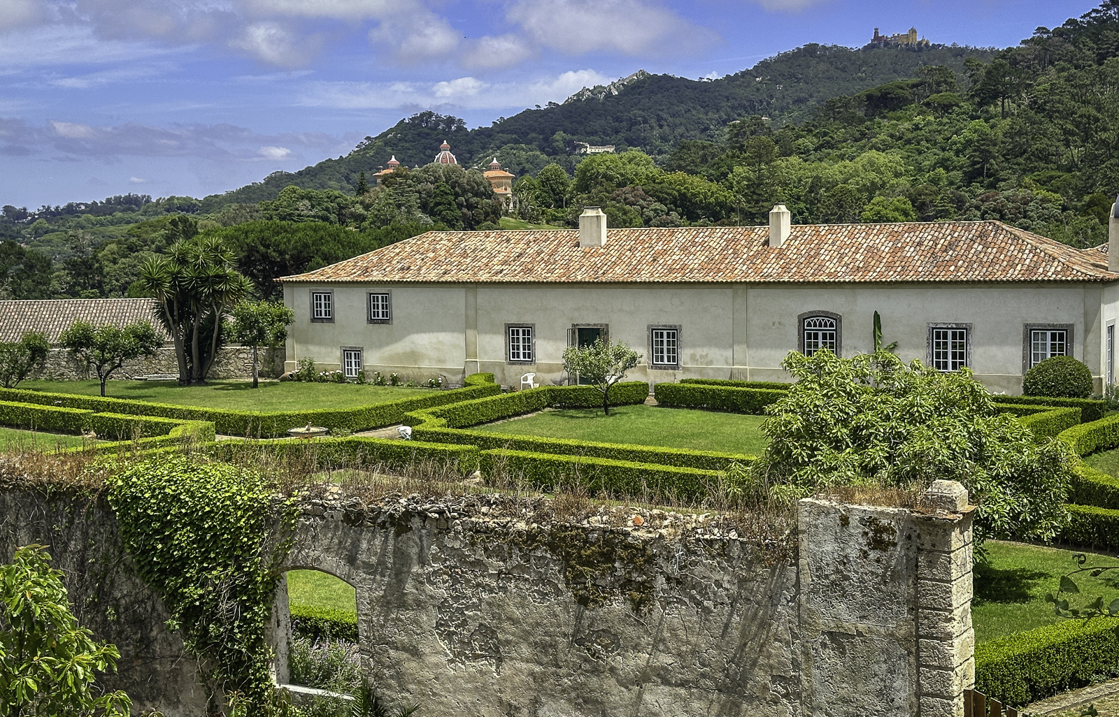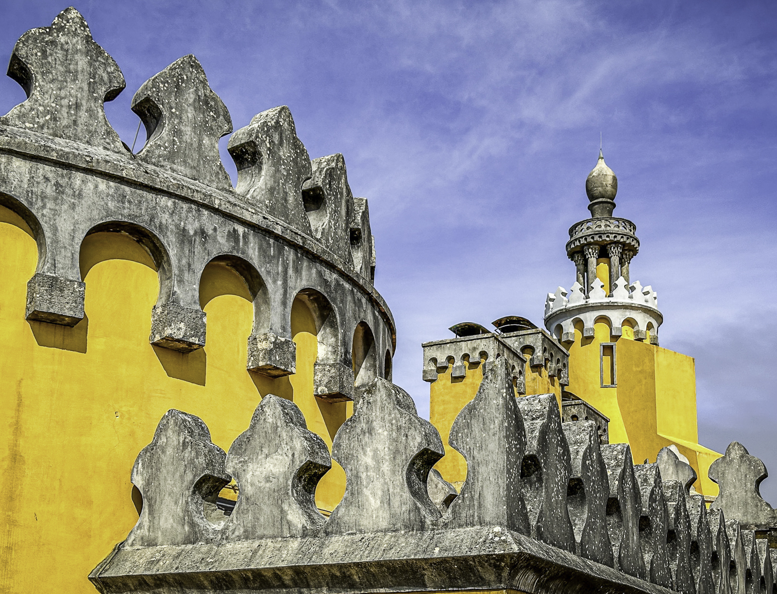 High above the town, the Moorish Castle offers sweeping views over the Atlantic and surrounding countryside. Nearby, the vivid Pena Palace—a 19th-century Romantic creation blending Gothic, Manueline, and Moorish styles—rises from dramatic mountaintop forests. In the valley below, the National Palace of Sintra, with its iconic conical chimneys, preserves centuries of royal life from the medieval through the Renaissance eras.