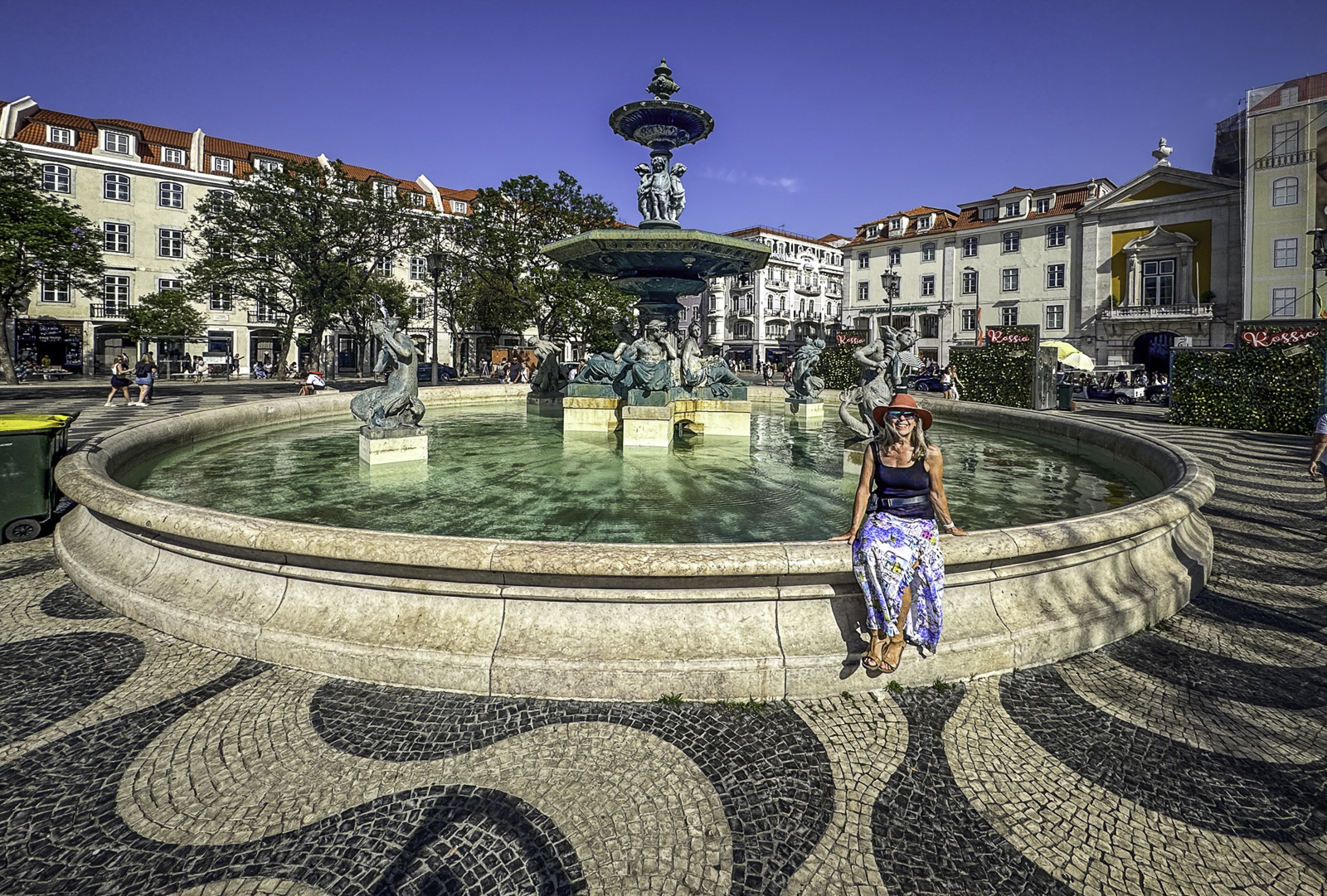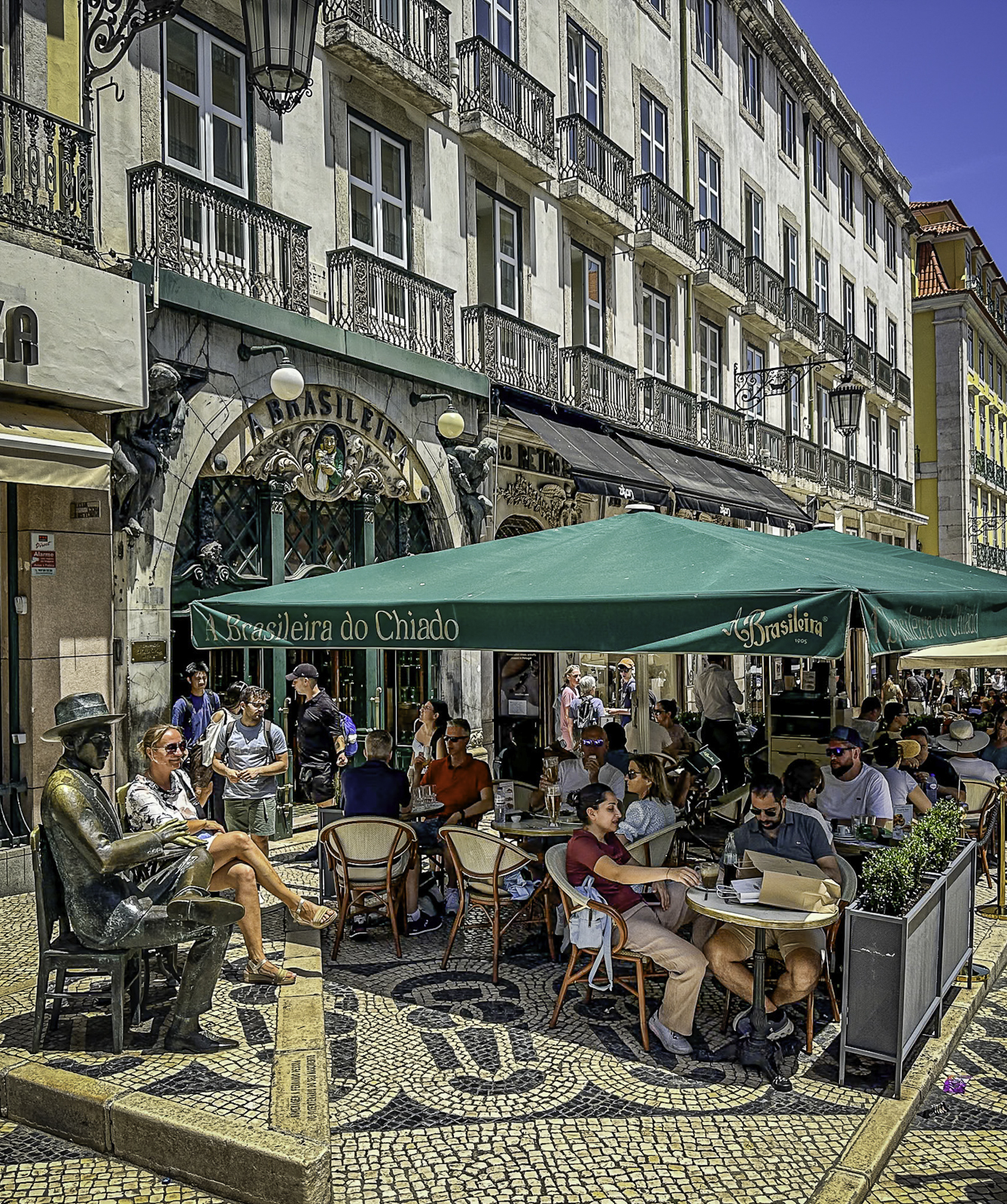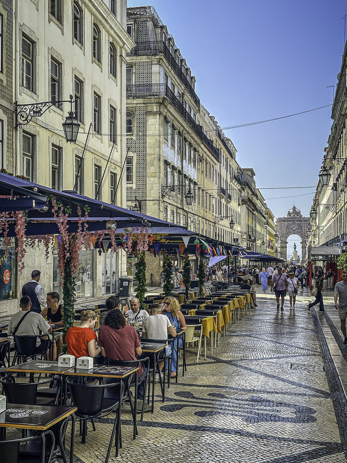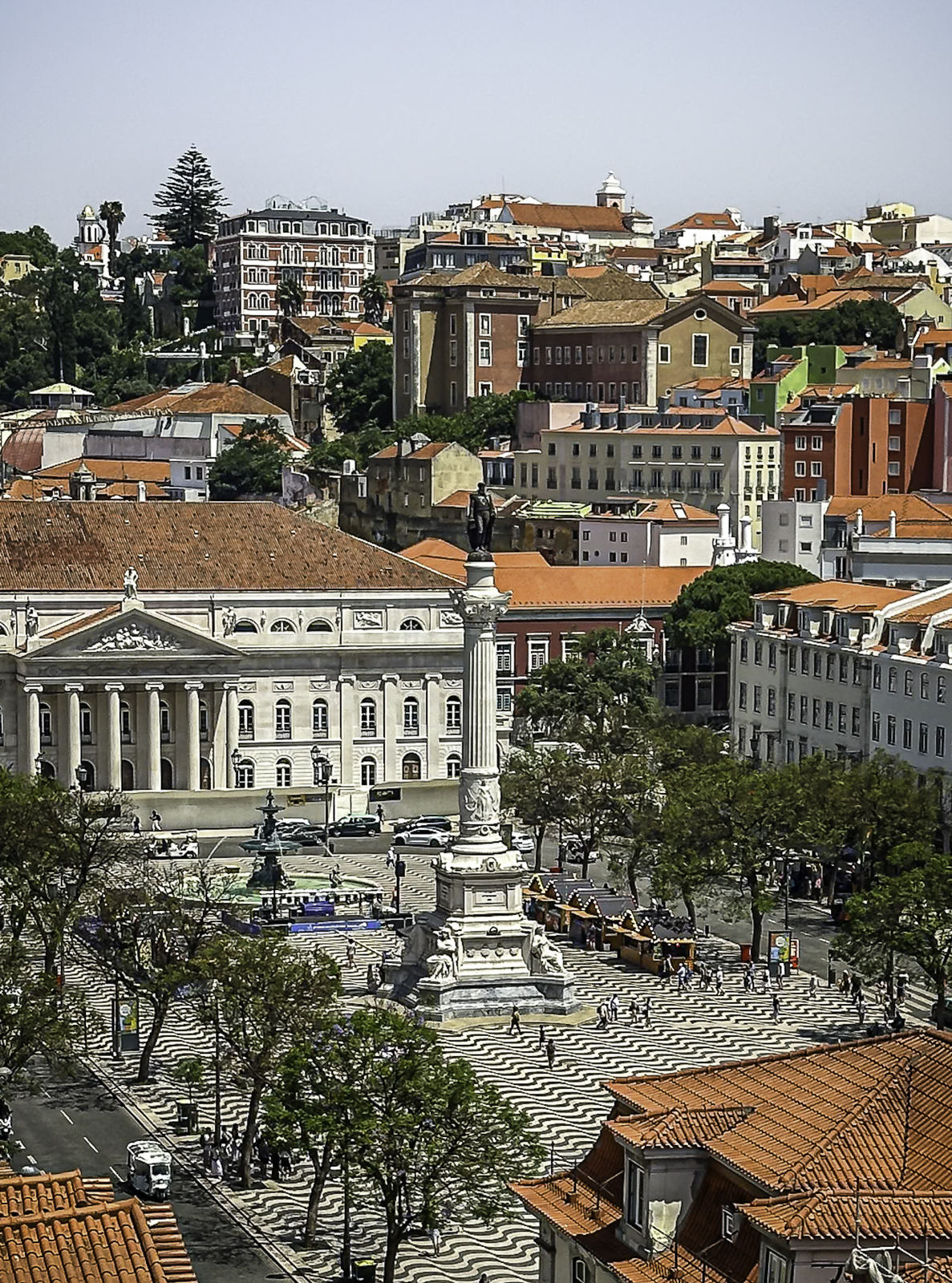 To the west lies Rossio Square, one of Lisbon’s most vibrant public spaces. Surrounded by cafés, theaters, and grand 19th-century buildings, the square is instantly recognizable for its striking black-and-white ceramic wave tiles—a pattern inspired by the movement of the sea. These undulating mosaics give the plaza a dynamic, almost optical quality as they ripple beneath the flow of daily life, symbolizing Lisbon’s deep connection to the ocean and its seafaring heritage.