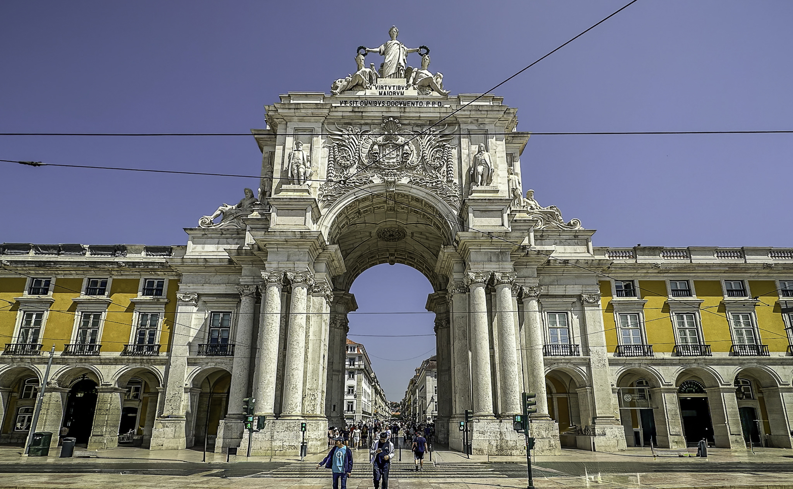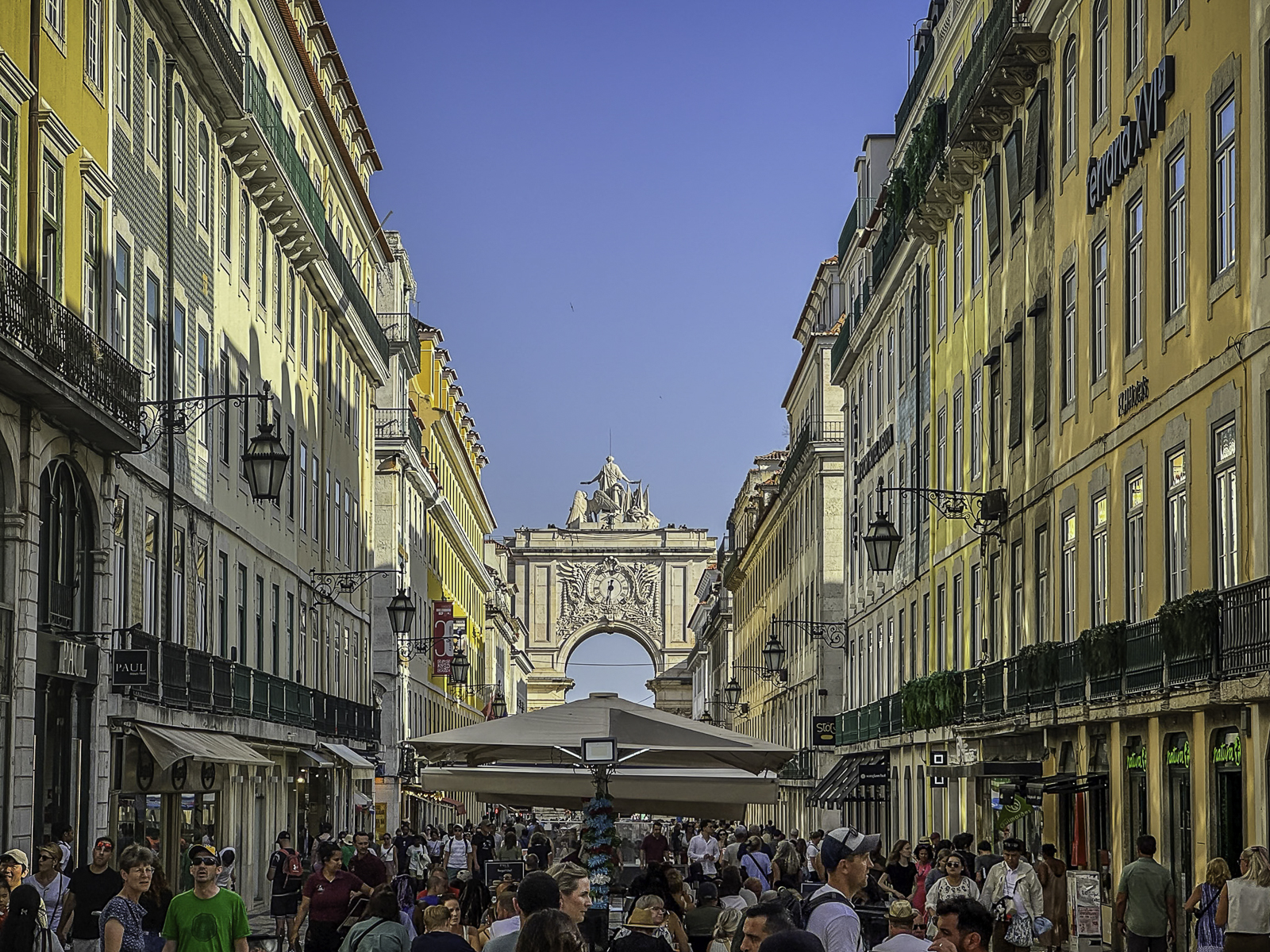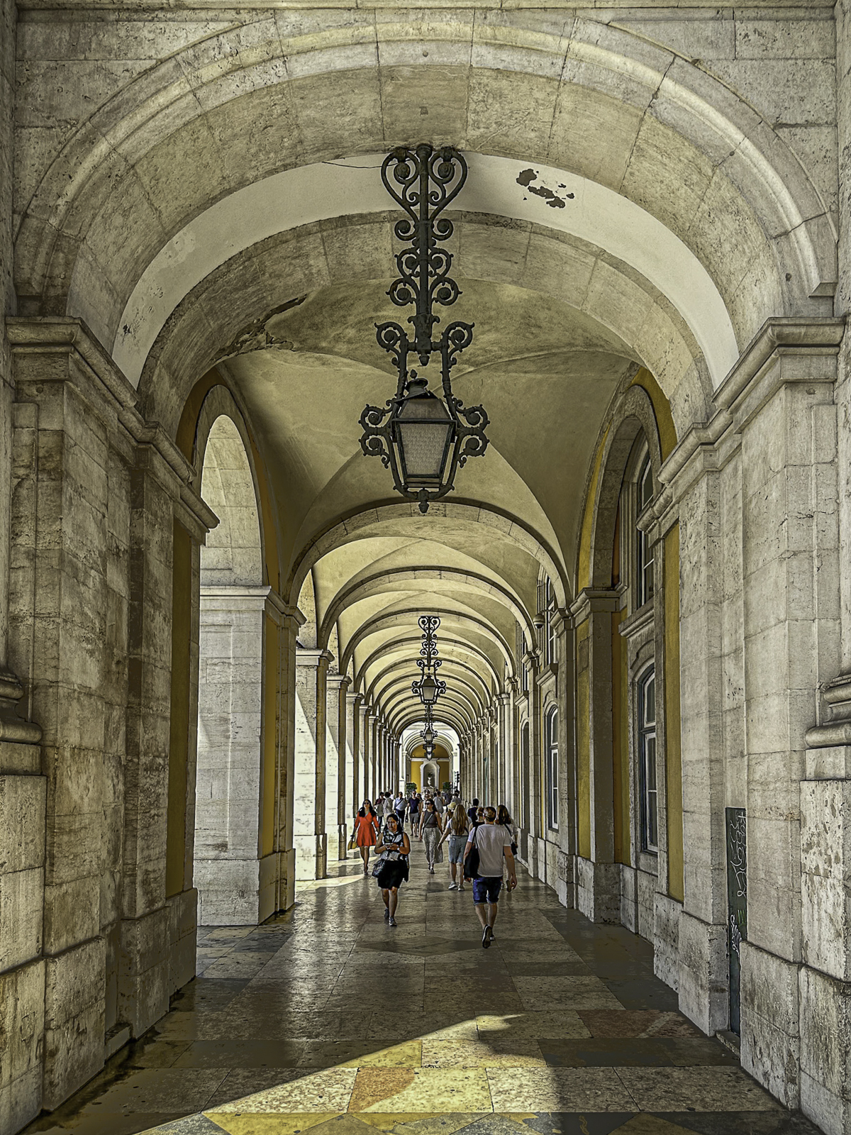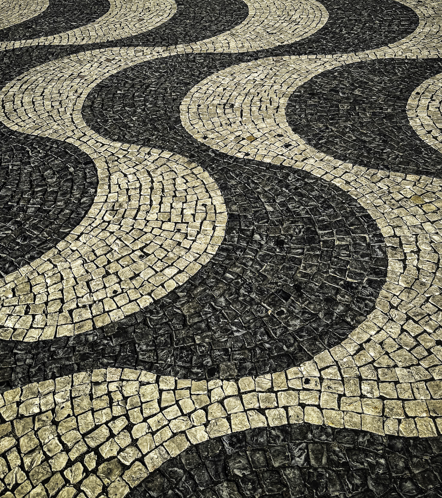 To the west lies Rossio Square, one of Lisbon’s most vibrant public spaces. Surrounded by cafés, theaters, and grand 19th-century buildings, the square is instantly recognizable for its striking black-and-white ceramic wave tiles—a pattern inspired by the movement of the sea. These undulating mosaics give the plaza a dynamic, almost optical quality as they ripple beneath the flow of daily life, symbolizing Lisbon’s deep connection to the ocean and its seafaring heritage.