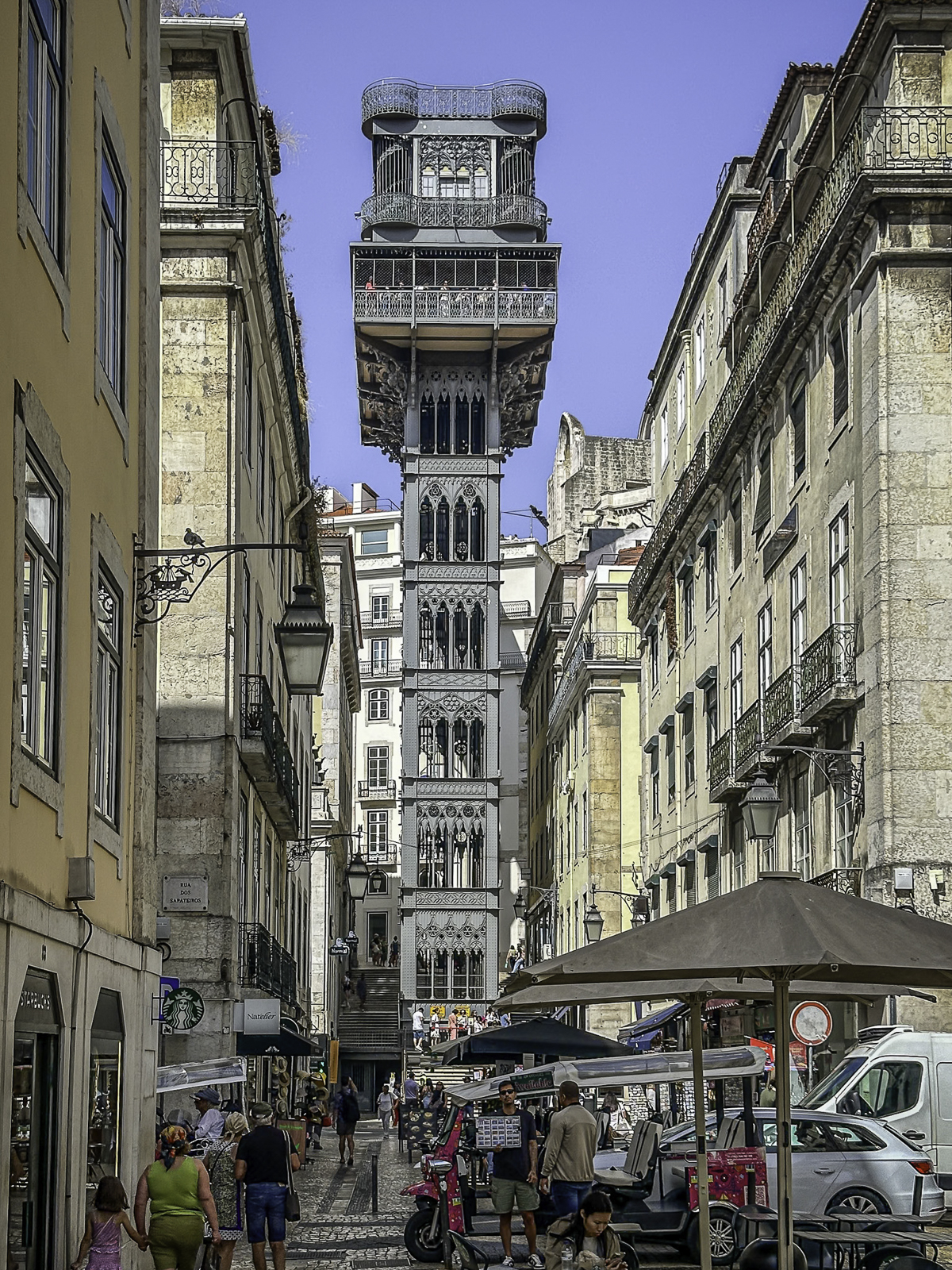 We took the Elevator Santa Justa, an elegant wrought-iron lift built in 1902, rises dramatically from the Baixa district, connecting the lower city to the Carmo Square above. Designed by Raoul Mesnier du Ponsard, a student of Eiffel’s circle, it offers sweeping views over Lisbon’s rooftops, the Tagus River, and the castle-topped hills that define the city’s skyline.