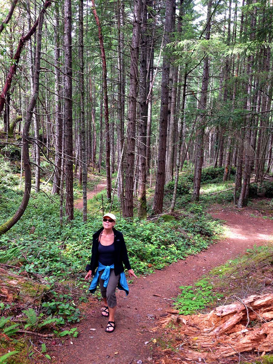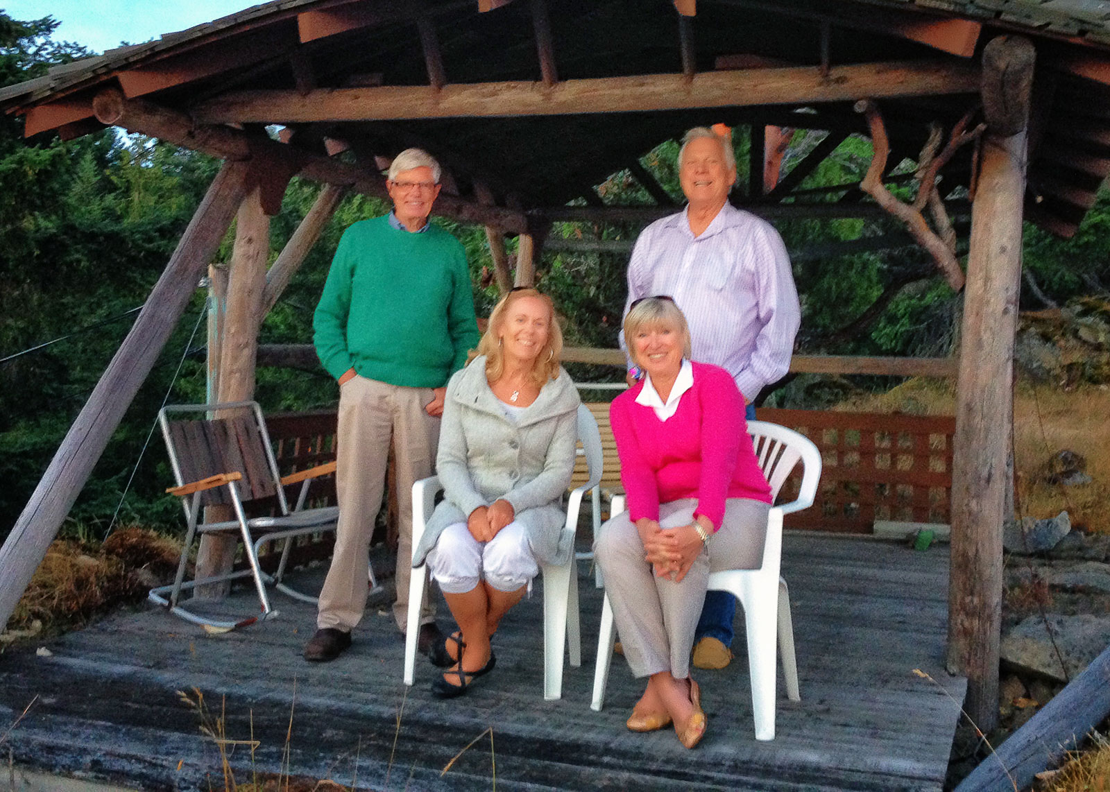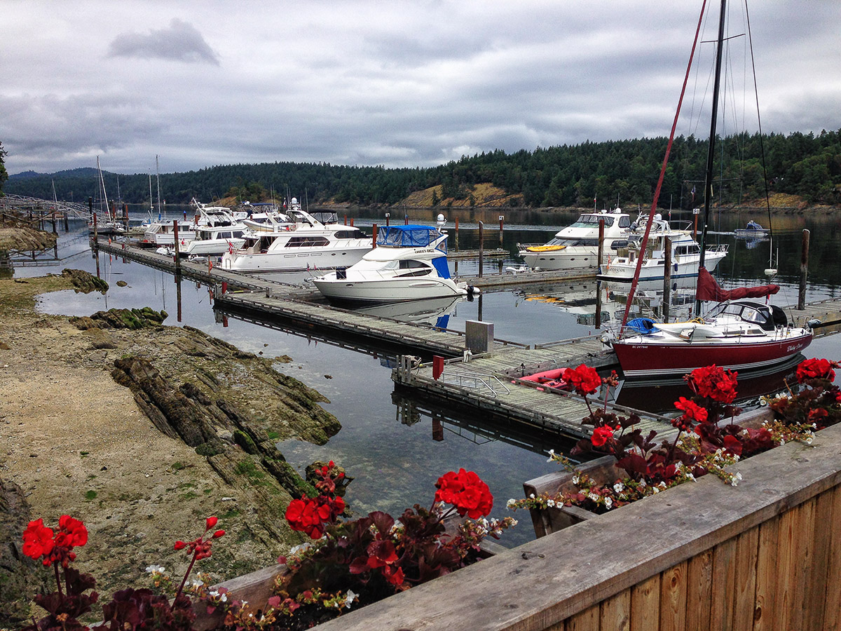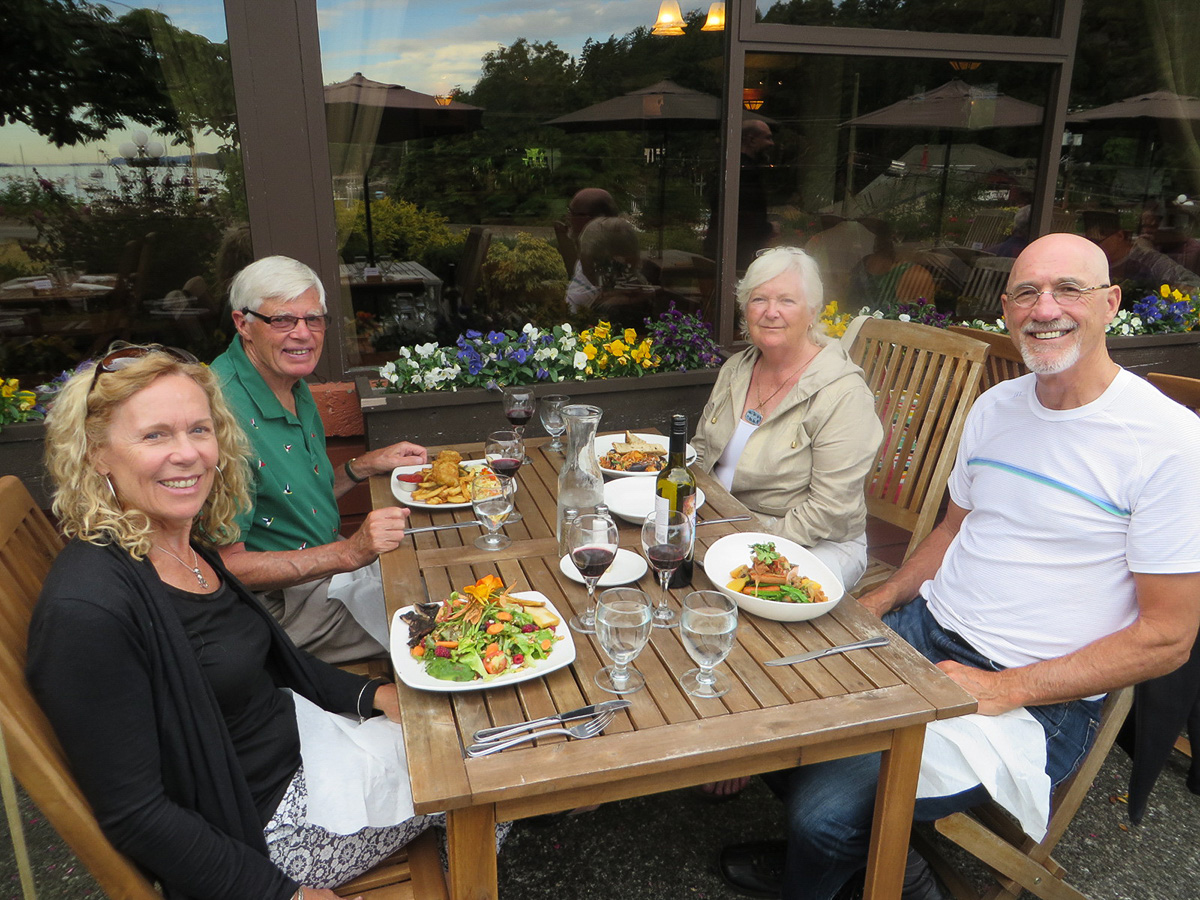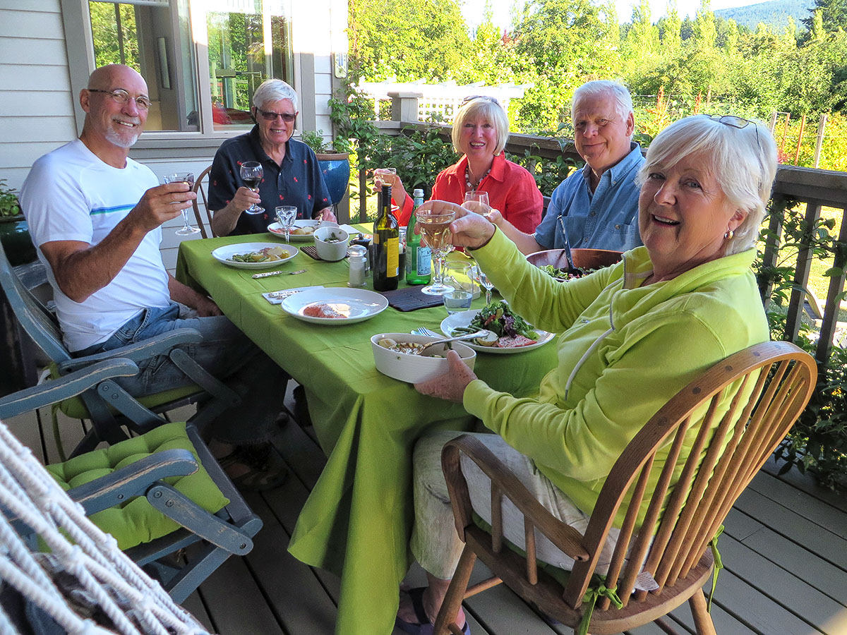 June 21st, Saturday, we left poor Sherpa at the Traveland in Langley to get repaired, and took the ferry over to Salt Spring Island to visit with my sister Sue and Denis at their charming place near Vesuvius on Salt Spring Island. It was like staying in a B&B for three weeks, eating fresh food from their garden, playing pickle ball four times a week and having great meals every day. The weather was hot and sunny most of the time so we went for long swims in the ocean before dinner. Fortunately we were able to watch all the World Cup Soccer games either with Sue and Denis or at a sports bar in Ganges called the Shipstones English Pub. We visited with Byron and Ellie Hender for lunch on their beautiful yacht, Winesk, at the Royal Vancouver Yacht Club on Salt Spring. Had a gourmet dinner evening at Michelle’s place, eating out on his deck perched on a rock outcropping overlooking the ocean. What a fabulous setting and great company. We hiked through the forest at Channel Ridge, and had great views looking out across the channel. One evening we enjoyed the beautiful voices of the African singers at the church in Ganges. We sadly had to leave Sue’s to continue our journey. We left Salt Spring on July 15th and drove back to Vancouver. What a great time we had together and we will definitely return next year.