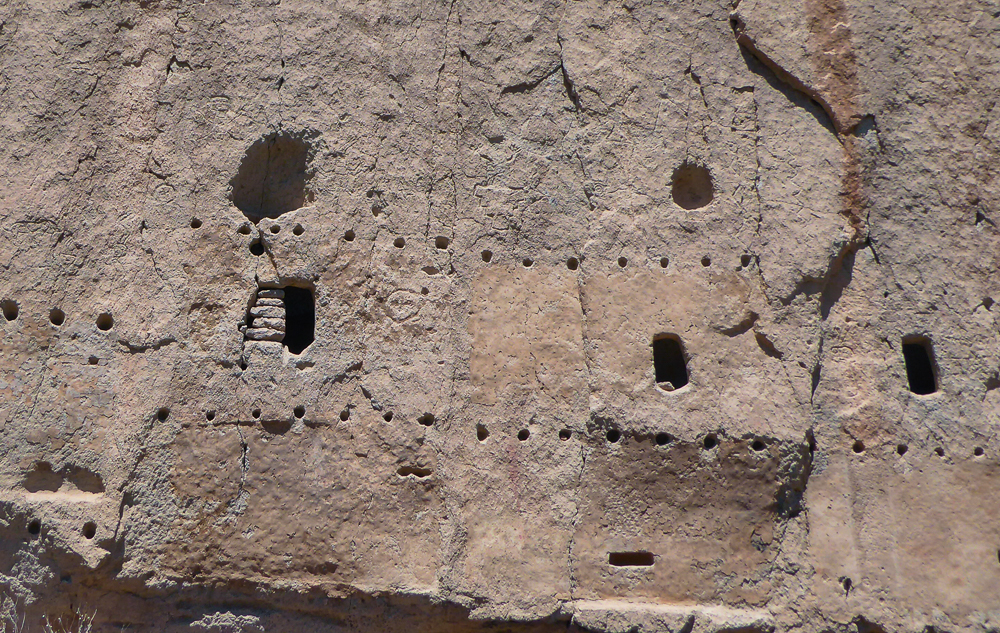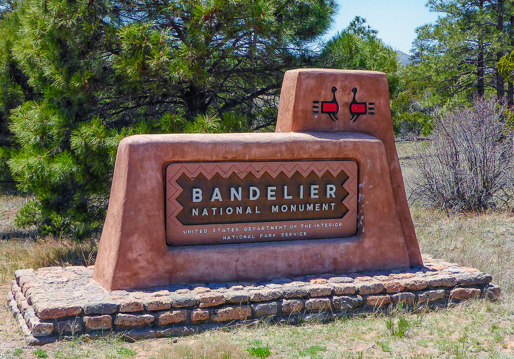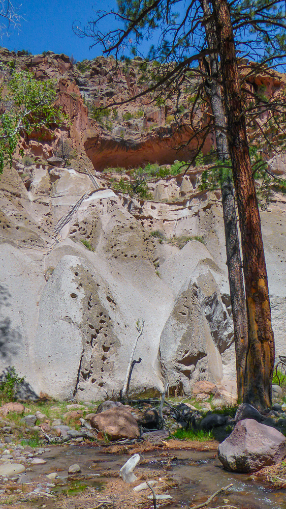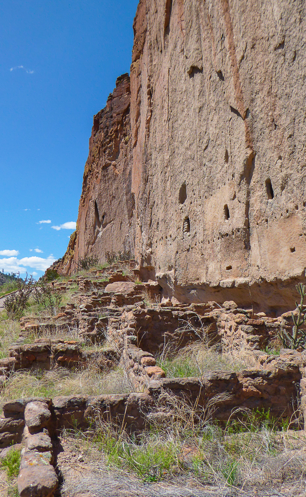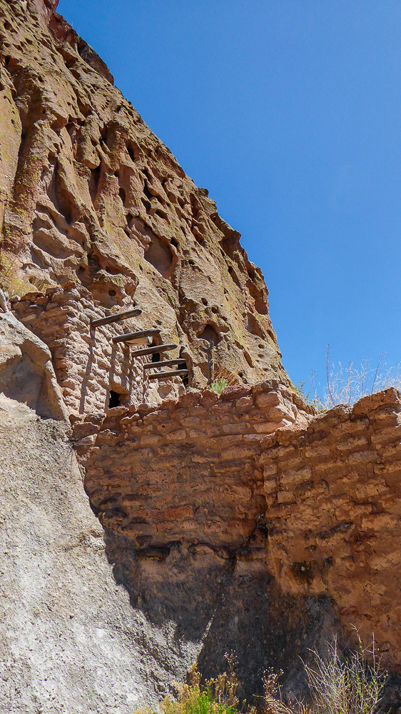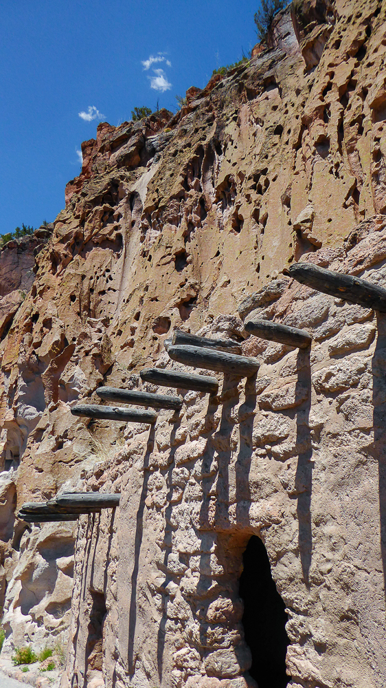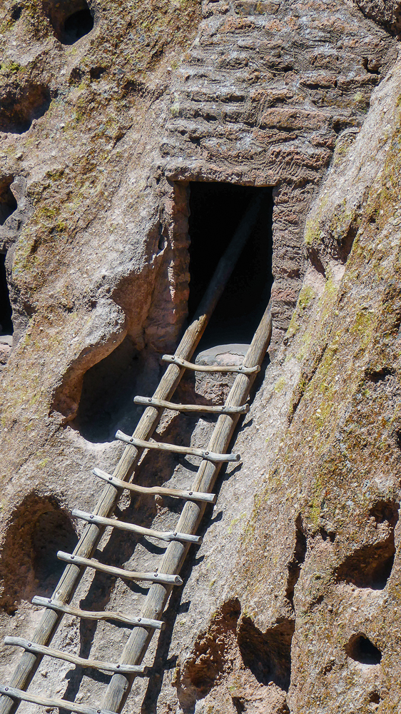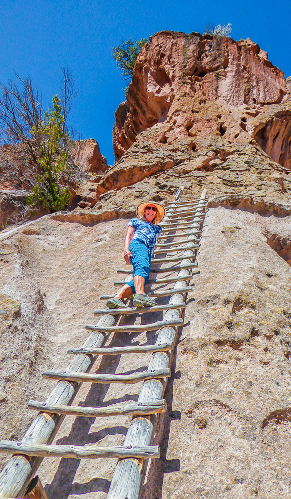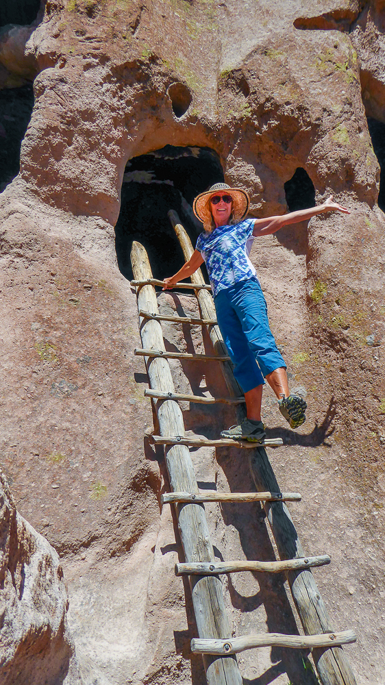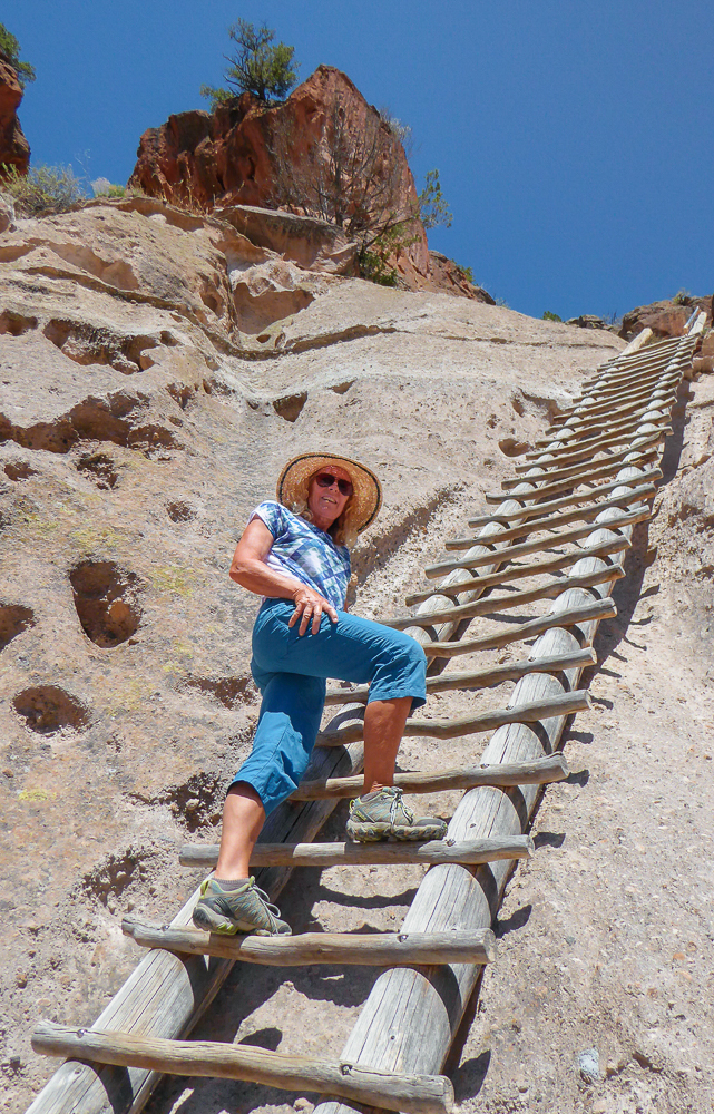 Then we headed north through Tesuque Village on the way to Bandelier National Monument. The Monument protects Ancestral Pueblo archeological sites and a diverse scenic landscape. Bandelier was designated by President Woodrow Wilson as a National Monument on Feb 11, 1916, and named for Adolph Bandelier, an anthropologist who researched and supported preservation of the sites. After leaving the Visitor Center we walked along the 1.2 mile “Main Loop Trail” through Frijoles Canyon stopping to view a number of ancestral pueblo homes, including Tyuonyi, a circular pueblo site that once stood 1-3 stories tall, kivas(ceremonial structures), rock paintings, and petroglyphs. Another trail took us to the Alcove House, a shelter cave produced by erosion of the soft rock and containing a small, reconstructed kiva, that was closed to visitors. We ascended into the cave by 4 wooden ladders that were very tall and steep,140 feet above the floor of Frijoles Canyon. We were disappointed that the kiva was closed because the last time we had visited here we went down into the kiva. Click on thumbnail to view images