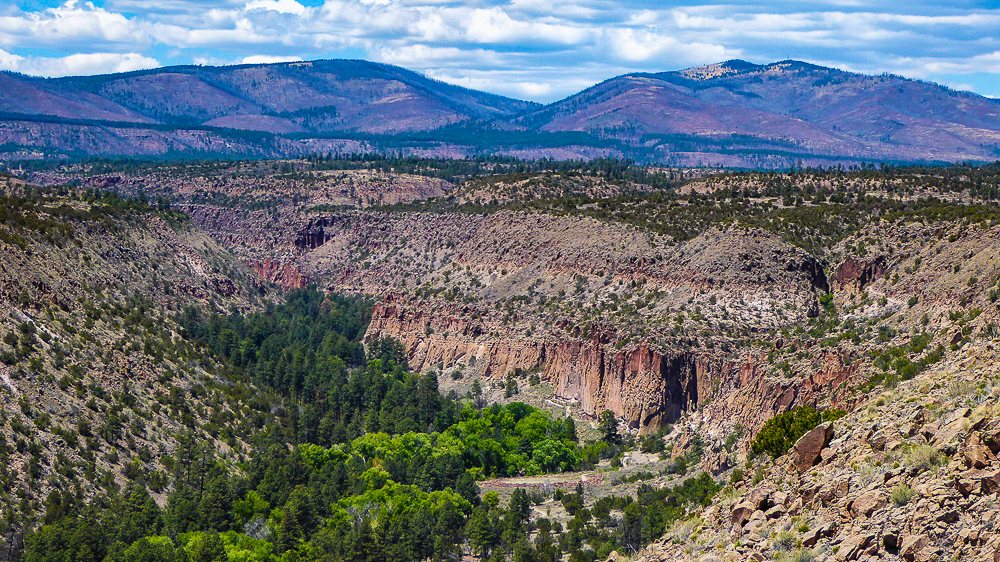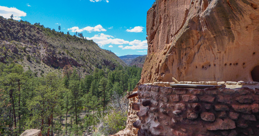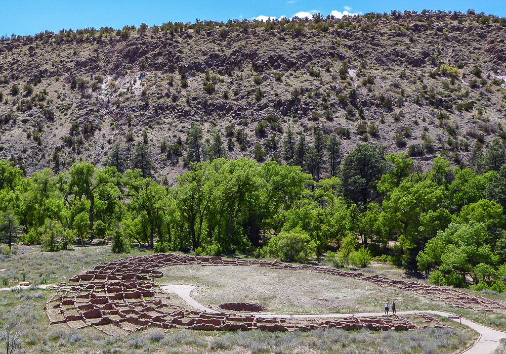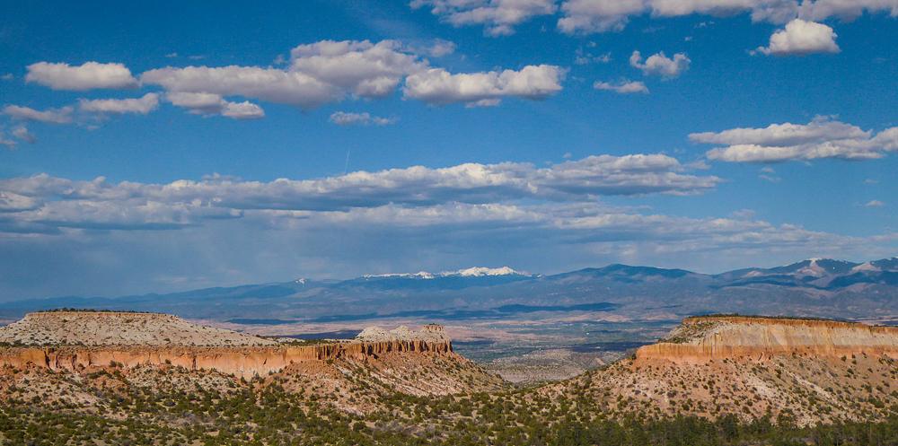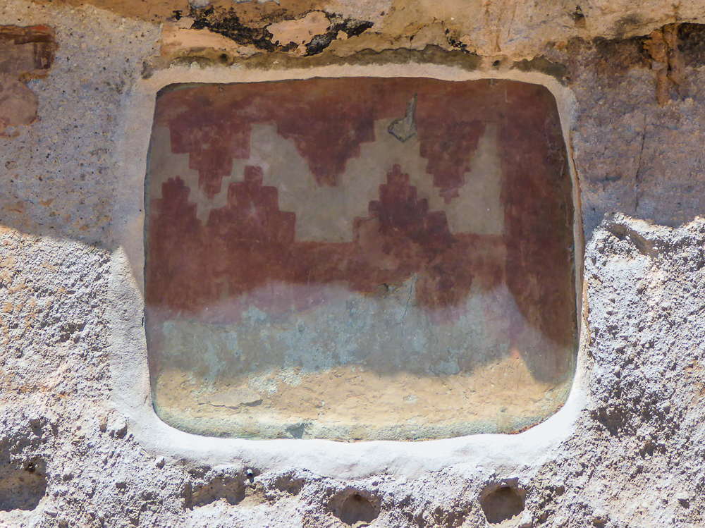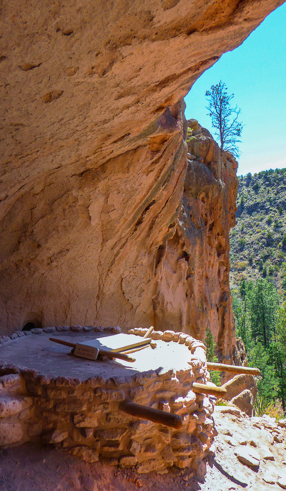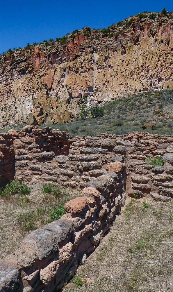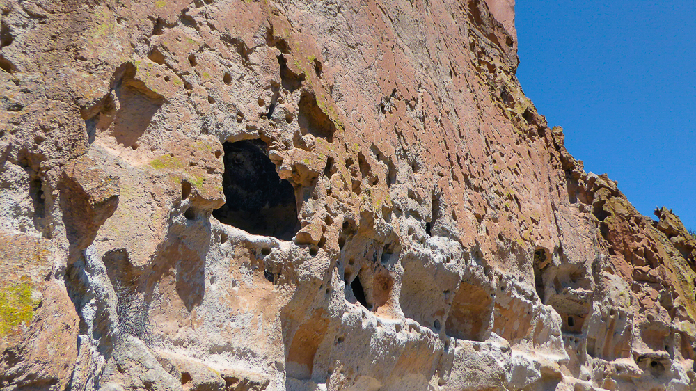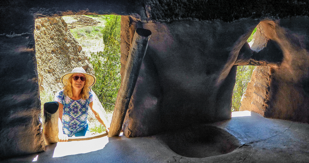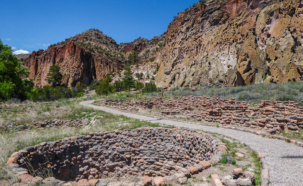 Then we headed north through Tesuque Village on the way to Bandelier National Monument. The Monument protects Ancestral Pueblo archeological sites and a diverse scenic landscape. Bandelier was designated by President Woodrow Wilson as a National Monument on Feb 11, 1916, and named for Adolph Bandelier, an anthropologist who researched and supported preservation of the sites. After leaving the Visitor Center we walked along the 1.2 mile “Main Loop Trail” through Frijoles Canyon stopping to view a number of ancestral pueblo homes, including Tyuonyi, a circular pueblo site that once stood 1-3 stories tall, kivas(ceremonial structures), rock paintings, and petroglyphs. Another trail took us to the Alcove House, a shelter cave produced by erosion of the soft rock and containing a small, reconstructed kiva, that was closed to visitors. We ascended into the cave by 4 wooden ladders that were very tall and steep,140 feet above the floor of Frijoles Canyon. We were disappointed that the kiva was closed because the last time we had visited here we went down into the kiva. Click on thumbnail to view images