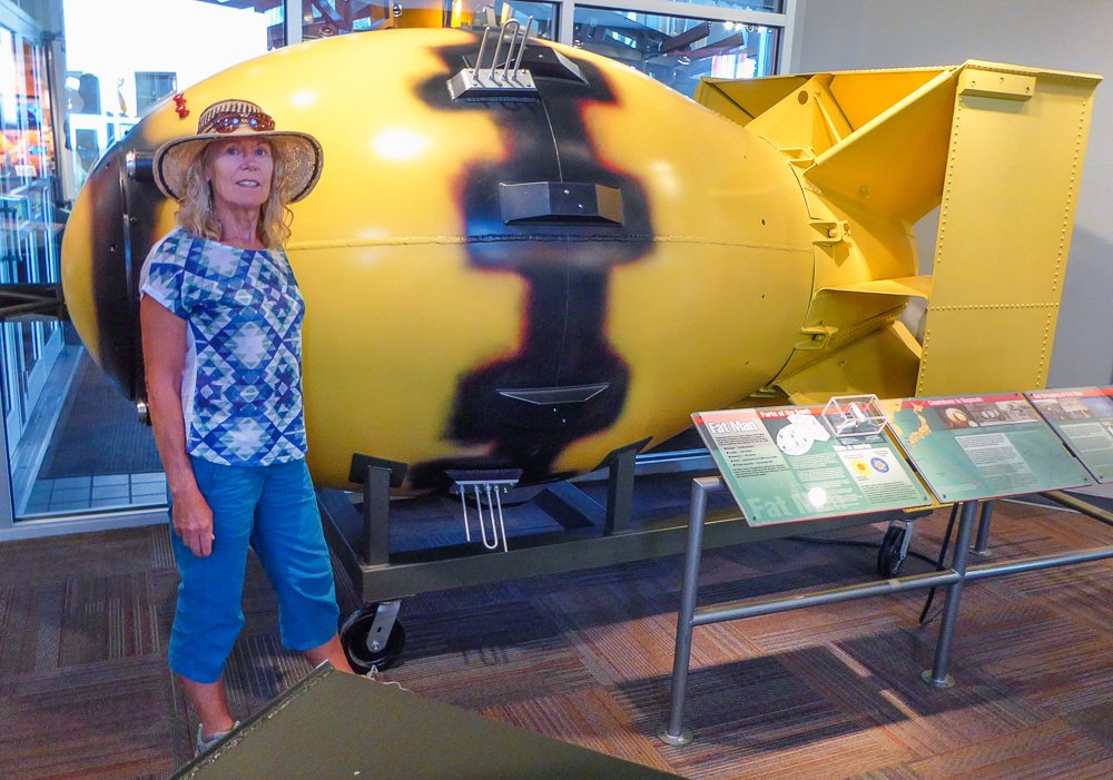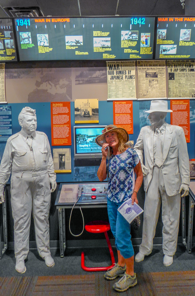 We left Bandelier National Monument and drove to Los Alamos, it is the home of the Los Alamos National Laboratory, established in 1943 for the Manhattan Project. Previously the site was occupied by the Los Alamos Ranch School, a private ranch school for boys, that offered a program modeled after the Boy Scouts of America, combining a college preparatory curriculum with a rigorous outdoor life. The school was closed when the government used its power of eminent domain to take over the Ranch School for the Manhattan Project, the building of the atomic bomb that ended WW ll. We learned all about the Manhattan Project at the Bradbury Science Museum, founded in 1953, and was named for the Laboratory’s second director Norris E Bradbury. We saw exhibits including artifacts and documents from the World War ll Manhattan Project and full size models of the Little Boy and Fat Man atomic bombs. What a fascinating place to visit, as I did not know that the atomic bomb that was dropped on Hiroshima to end WW ll was built here in Los Alamos. And the journey continues…… Click on thumbnail to view images