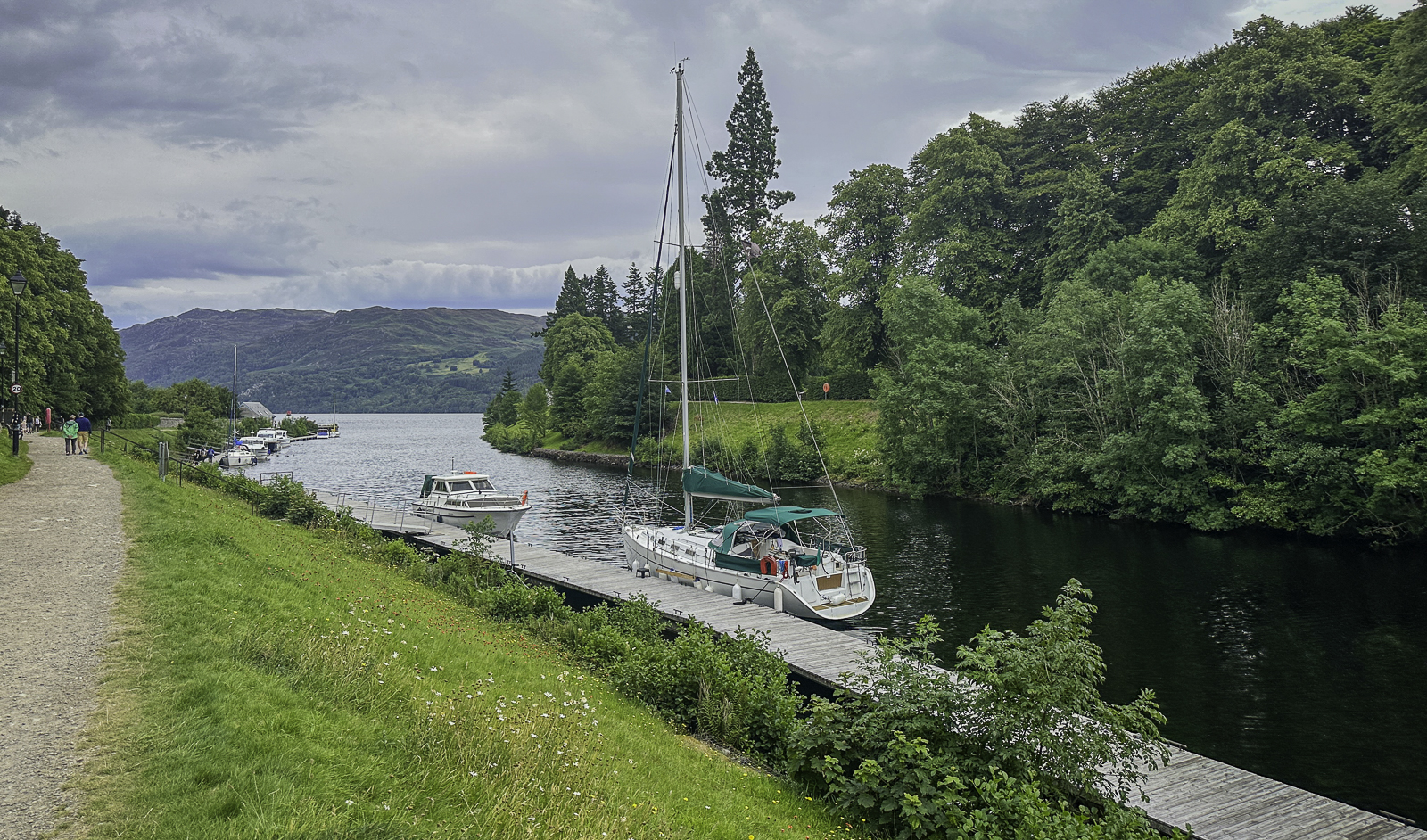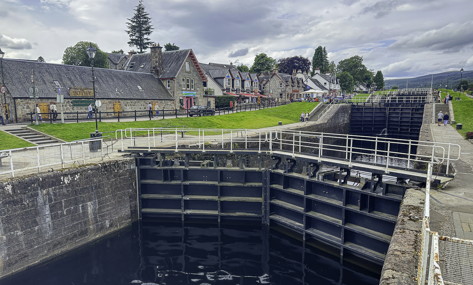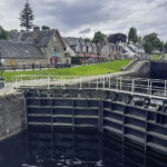 Fort Augustus also occupies an important position along the Caledonian Canal, the ambitious 19th-century engineering project designed by Thomas Telford to create a navigable route linking Scotland’s east and west coasts. The canal was built to provide a safer alternative to the treacherous journey around the northern coast and to stimulate economic development in the Highlands. In Fort Augustus, a dramatic series of locks steps down between Loch Ness and the canal’s inland waters, lifting and lowering boats through a carefully engineered sequence. Watching vessels slowly navigate this multi-level lock system—surrounded by hills, water, and historic buildings—has become one of the village’s signature experiences, offering a peaceful yet fascinating glimpse into Scotland’s industrial and maritime heritage.