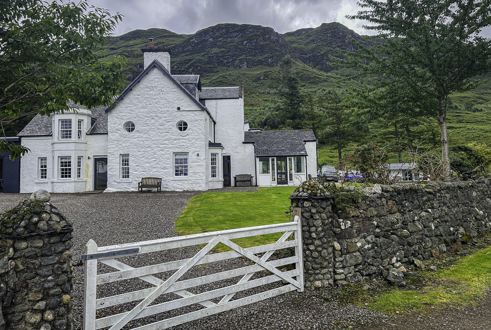 Continuing west, we arrived in Shiel Bridge, a small hamlet nestled at the foot of the magnificent Five Sisters of Kintail—a striking mountain ridge whose five peaks form one of the most recognizable silhouettes in the Highlands. Steeped in local legend, the Five Sisters are said to represent five daughters turned to stone while awaiting the return of their suitors. Today, the mountains attract hikers and photographers from around the world, framing Shiel Bridge with a dramatic and unmistakably Highland backdrop. We planned to stay several days and booked into the quaint and secluded Kintail Lodge Hotel which would be our base for exploring the Isle of Skye.