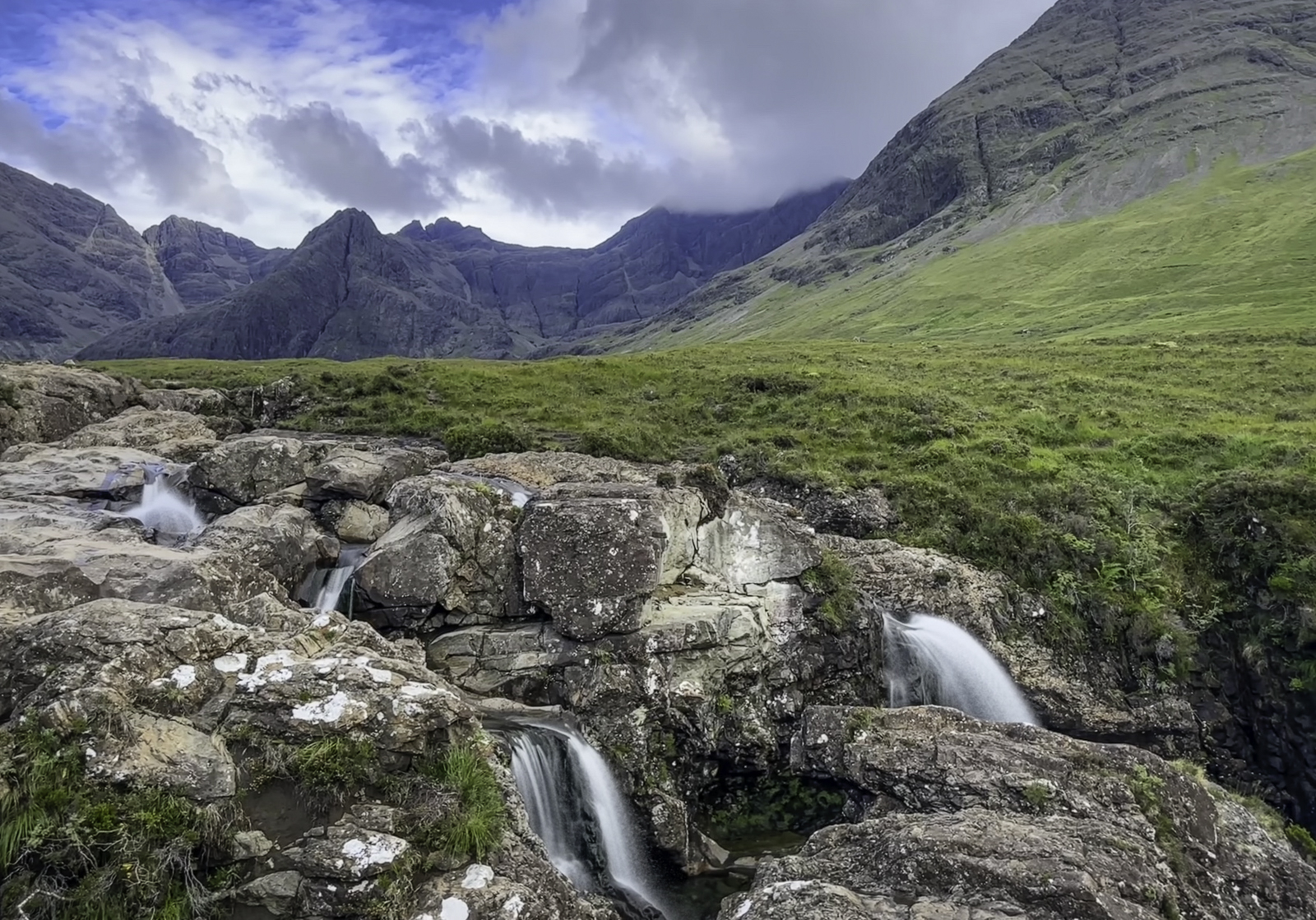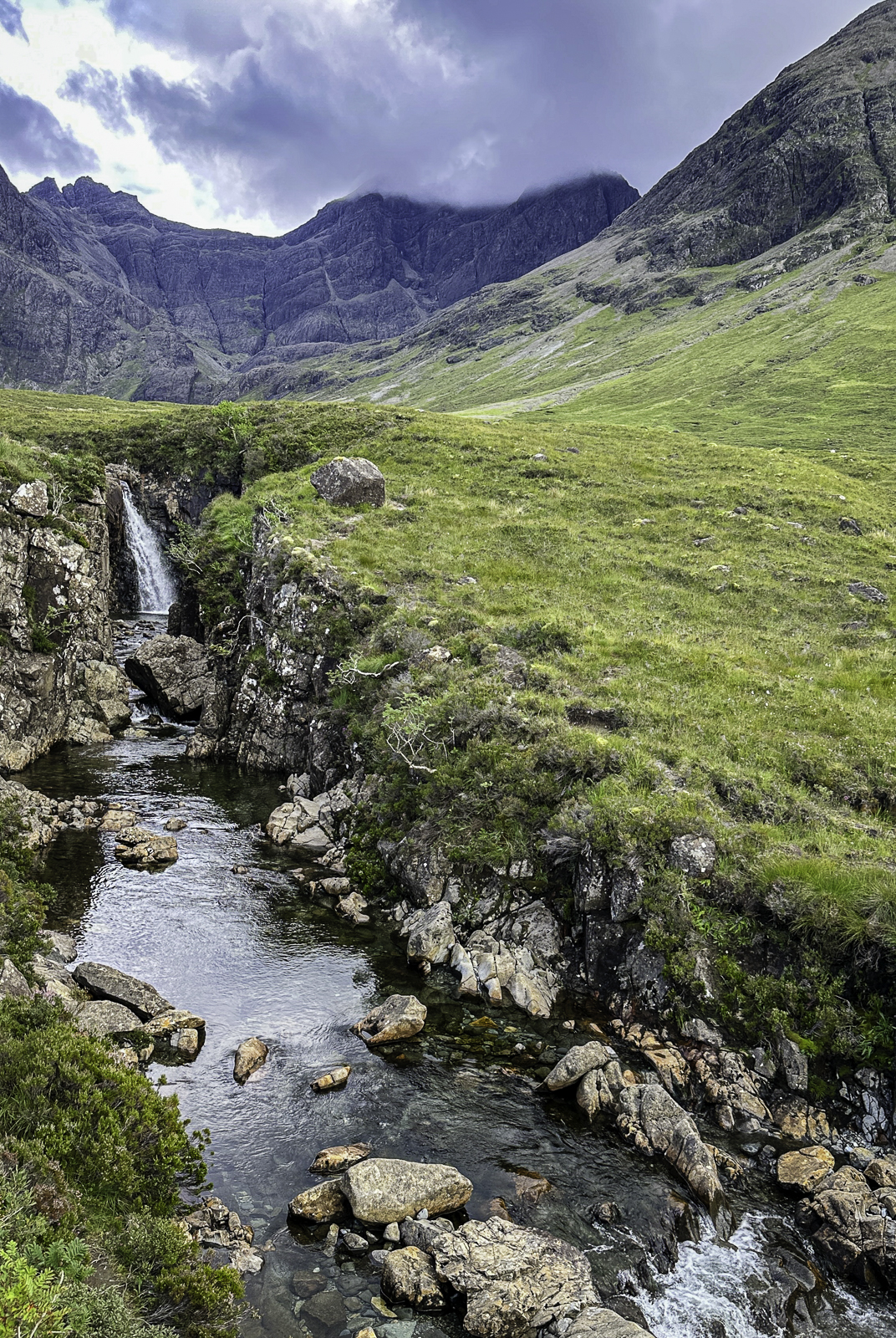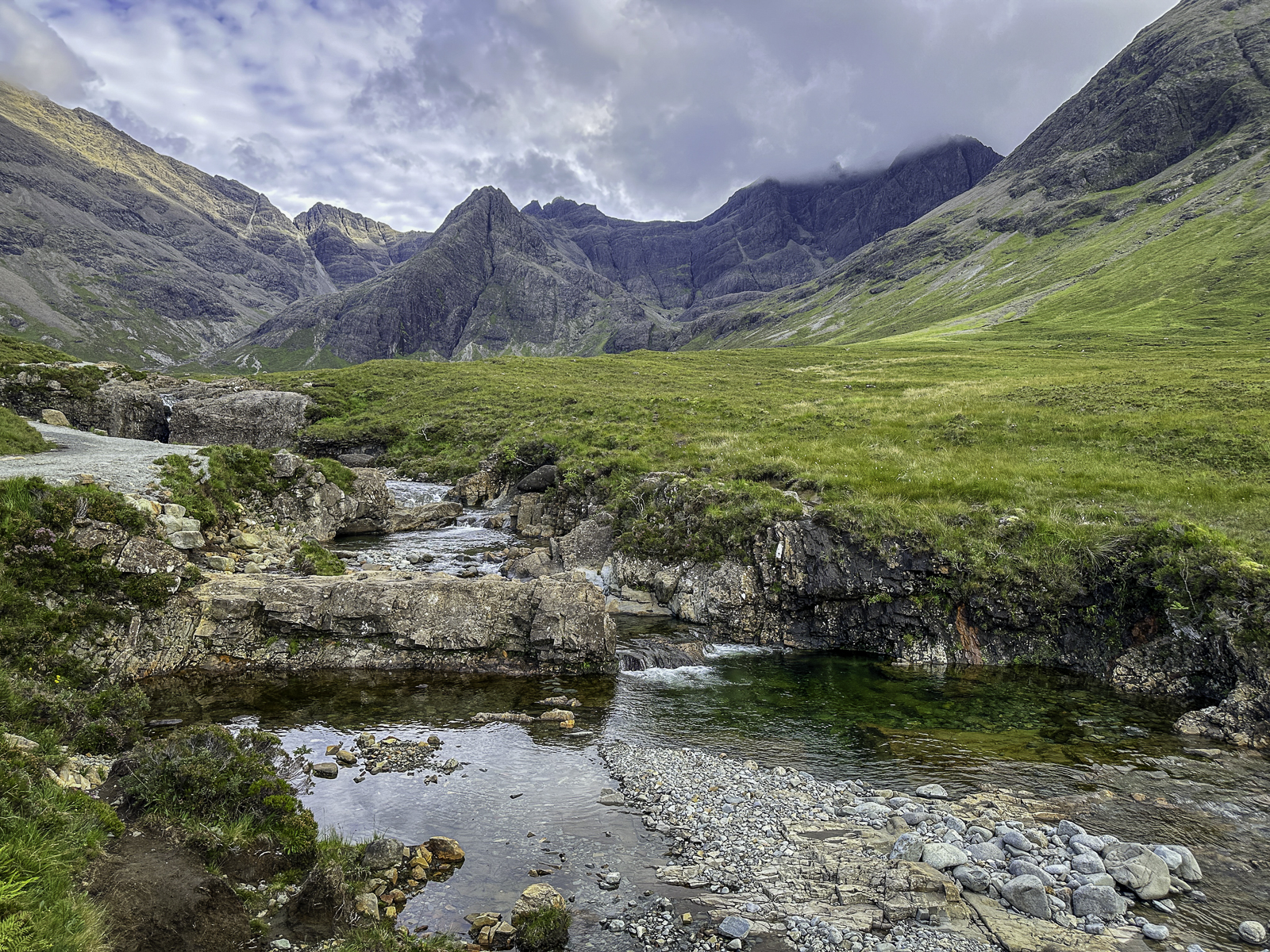 As we followed the stream upstream, each bend revealed another pool—some calm and glassy, others animated by rushing water spilling over smooth rock shelves. The setting felt almost otherworldly: rugged peaks rising sharply overhead, shifting clouds casting shadows across the hills, and the constant sound of water echoing through the valley. It was easy to understand how generations of Highland folklore grew from places like this.