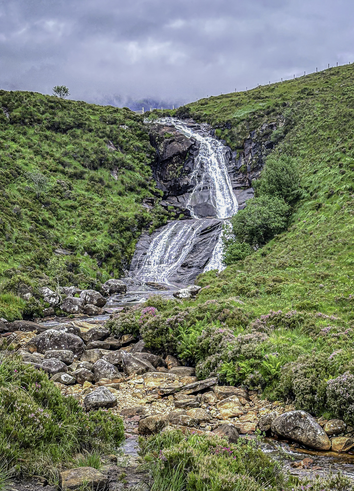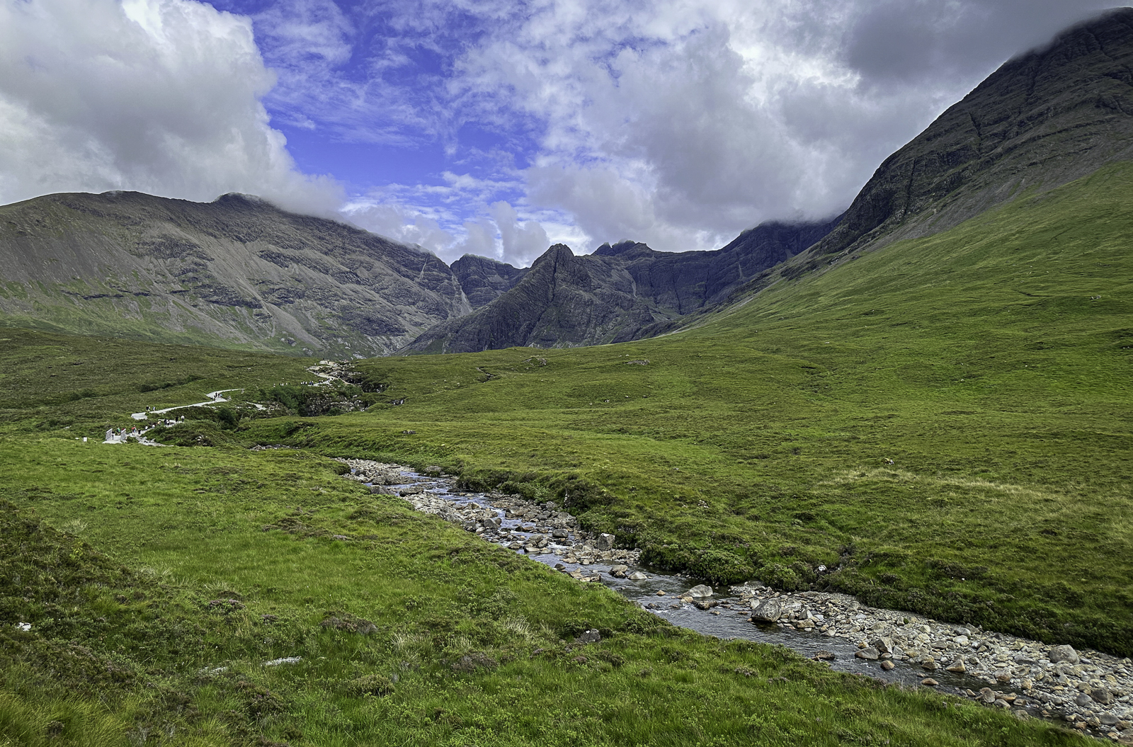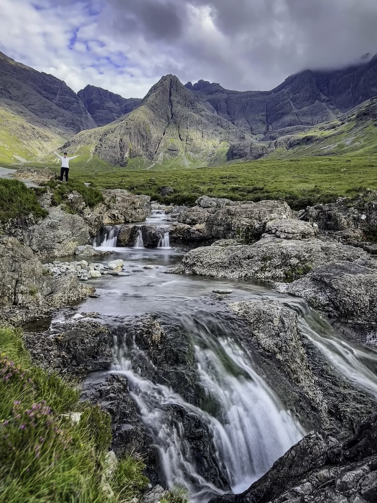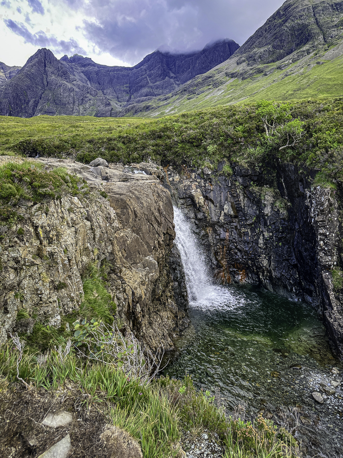 As we followed the stream upstream, each bend revealed another pool—some calm and glassy, others animated by rushing water spilling over smooth rock shelves. The setting felt almost otherworldly: rugged peaks rising sharply overhead, shifting clouds casting shadows across the hills, and the constant sound of water echoing through the valley. It was easy to understand how generations of Highland folklore grew from places like this.