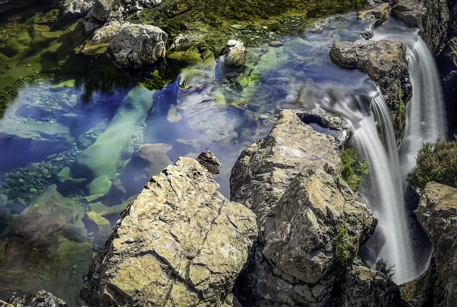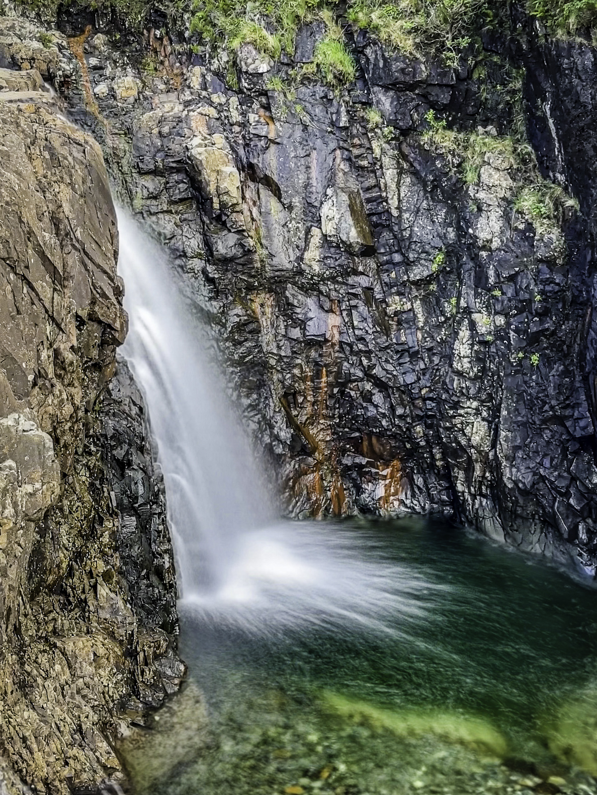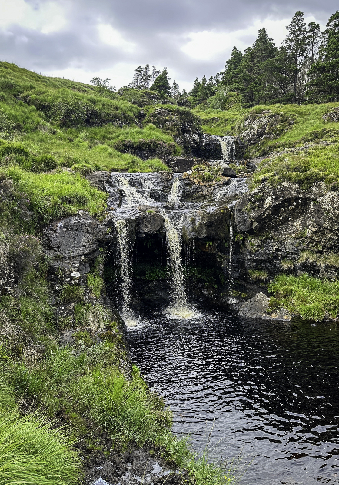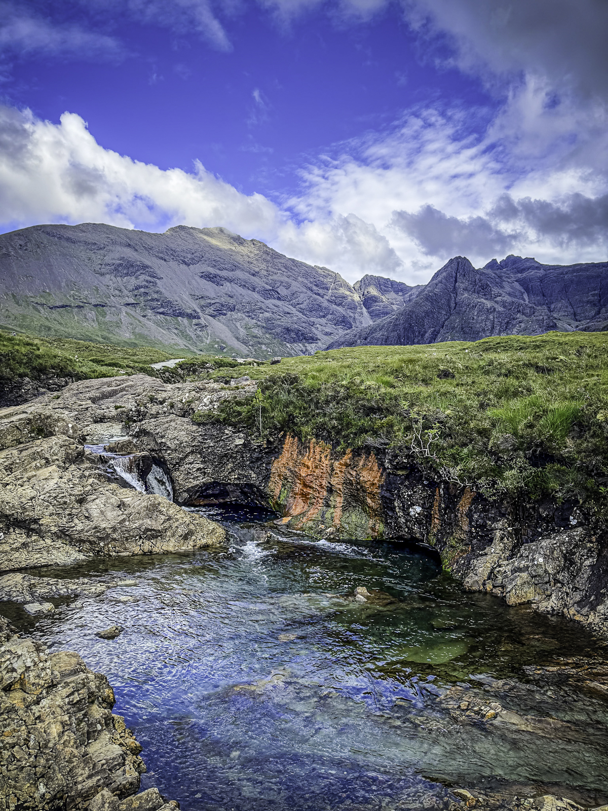 foot of the dramatic Cuillin Hills. A short walk from the roadside led us across open moorland to a series of crystal-clear pools connected by tumbling waterfalls. Fed by streams flowing directly from the Black Cuillin, the water glowed in striking shades of turquoise and blue-green, its clarity so sharp that every stone beneath the surface was visible.