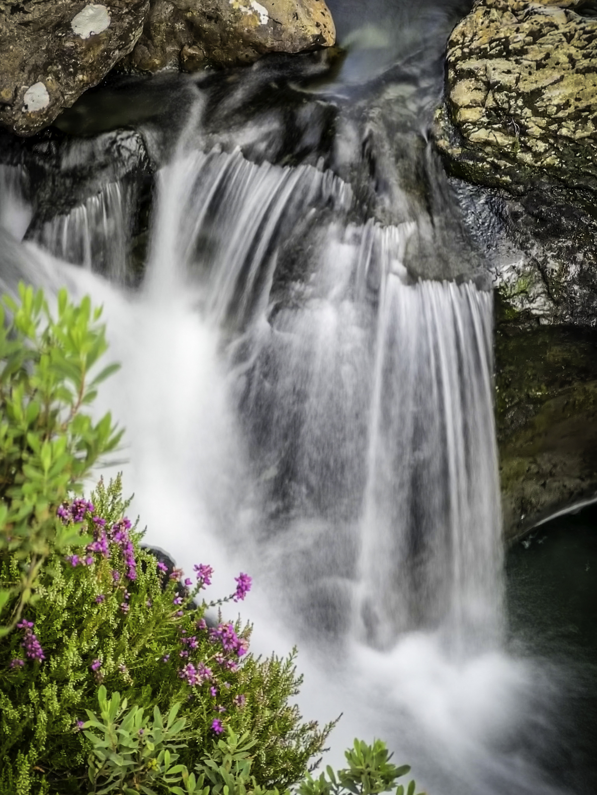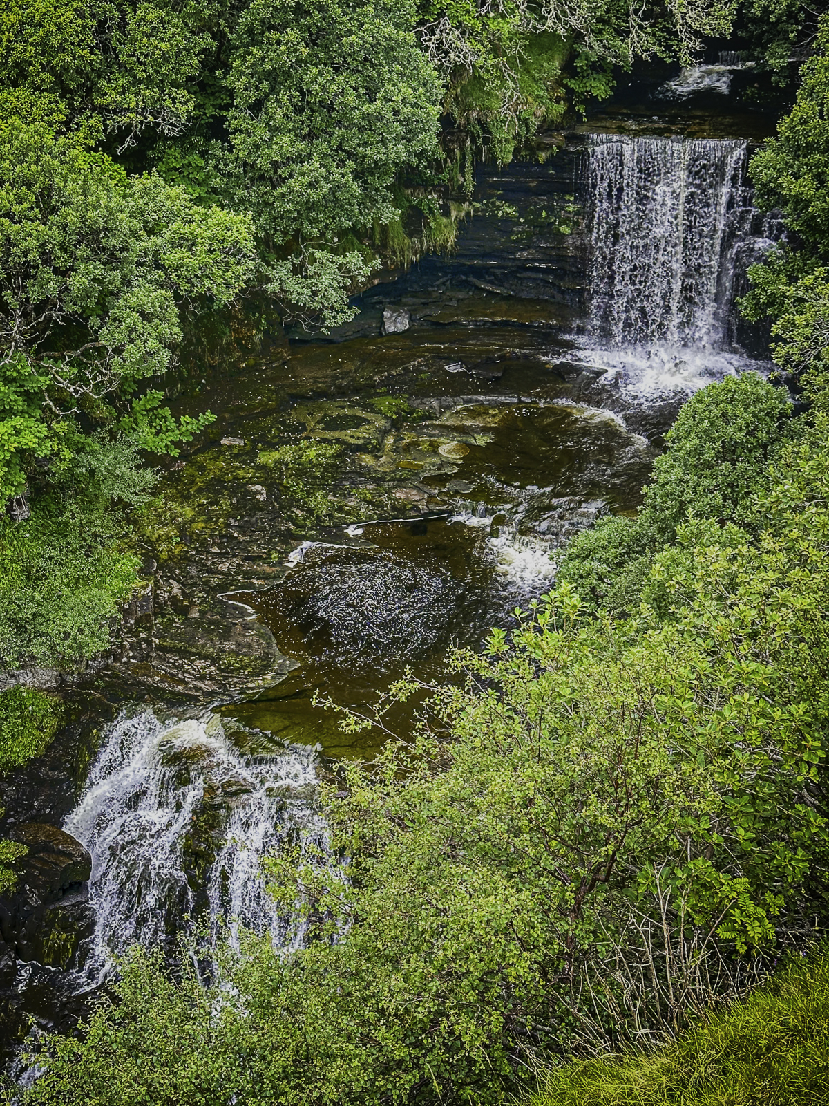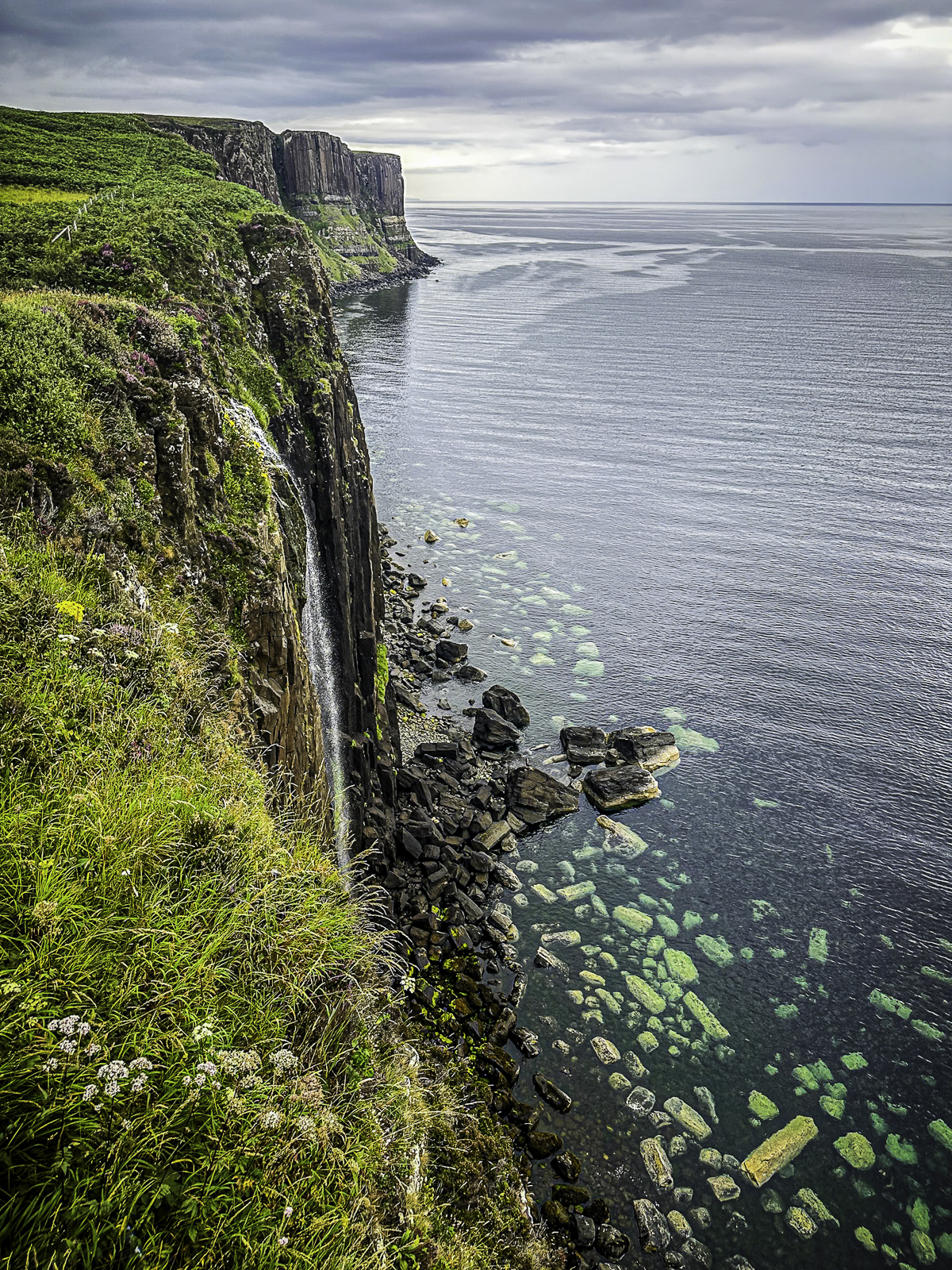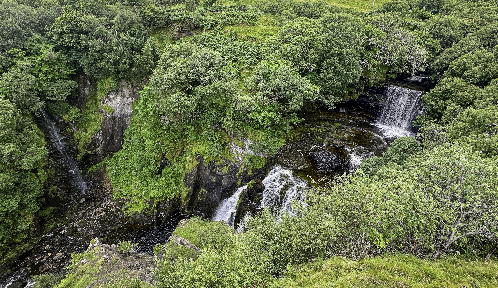 foot of the dramatic Cuillin Hills. A short walk from the roadside led us across open moorland to a series of crystal-clear pools connected by tumbling waterfalls. Fed by streams flowing directly from the Black Cuillin, the water glowed in striking shades of turquoise and blue-green, its clarity so sharp that every stone beneath the surface was visible.
