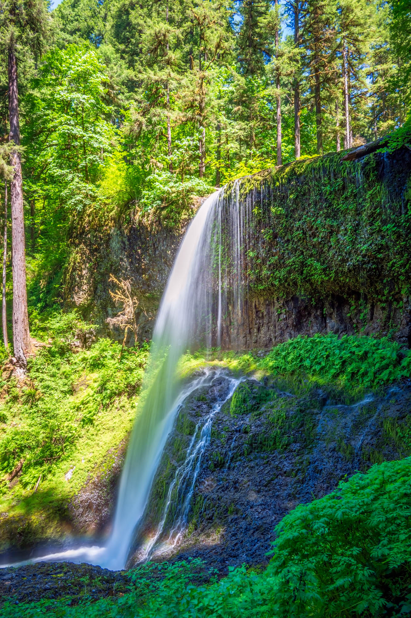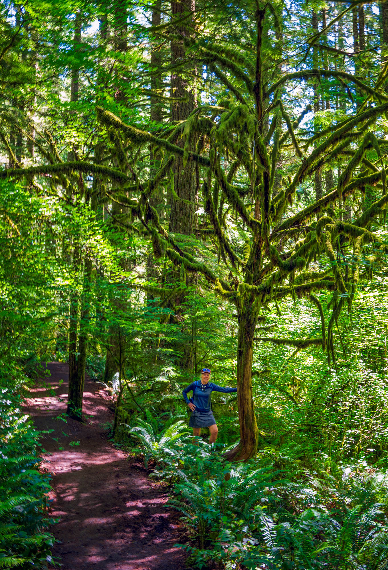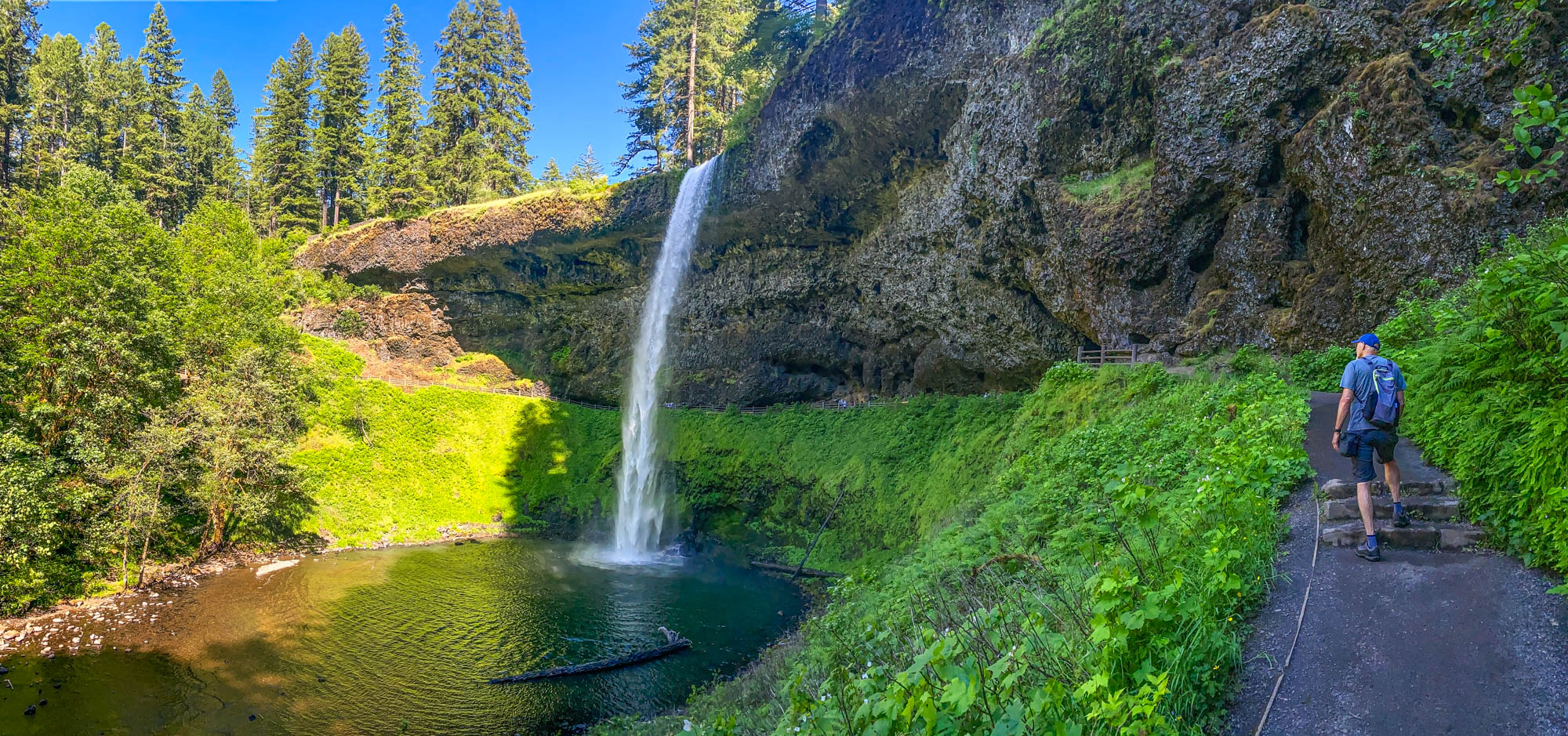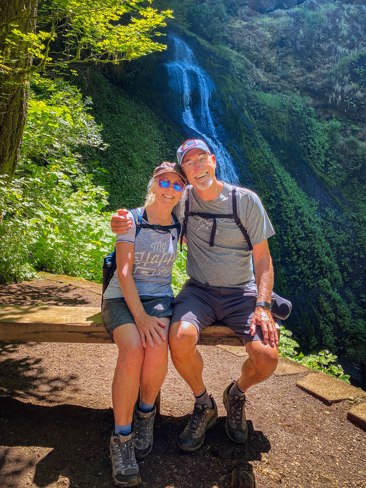 Today, June 16, we visited Silver Falls State Park, located 20 miles east-southeast of Salem and 1 1/2 hour drive from Eugene. The Park is the crown jewel of the Oregon State Parks system, being both Oregon’s largest State Park and boasting one of America’s most impressive waterfall day-hikes, the Trail of Ten Falls, a 7.8 mile loop trail that runs along the banks of Silver Creek and passes by 10 waterfalls. Four of the ten falls have an amphitheater-like surrounding that allows the trail to pass behind the flow of the falls. We started this hike going in a counterclockwise direction from the Silver Falls Lodge along the rim of the canyon. We entered a magnificent cathedral-like old-growth forest of towering Douglas firs and hemlocks on a beautiful maintained trail. The first waterfall we came to was the Upper North Falls, 65 feet tall, cascading off a basalt cliff formed by ancient lava flows. We’ve got nine more to go, so we continued along the trail descending a lot of stairs to view the North Falls. At 136 feet tall it is one of the tallest falls in the park, and the huge grotto behind the falls was amazing to walk under. Another mile down the trail we came to a side view of the 31-foot Twin Falls. Then we took another side trail to view the 134-foot Winter Falls which had a good flow of water still. We stopped on a bench to capture our photo in front of the falls. Returning to the main loop, we headed down the Canyon Trail to pass near the top of Middle North Falls and down the side trail that goes behind the 106-foot high falls and further along the slope to an overhang to get a dramatic view looking back at Middle North Fork Falls framed by mossy maples. So far of all the falls we have seen, this one is our favorite because the cascading water is so close to the trail when you walk behind it. The next waterfall we saw was the view from the wooden platform of the single 27-foot drop Drake Falls, named after the man who helped make this place a State Park. We took the side trail to view the two-tiered Double Falls, the tallest waterfall in the park at 178 feet.