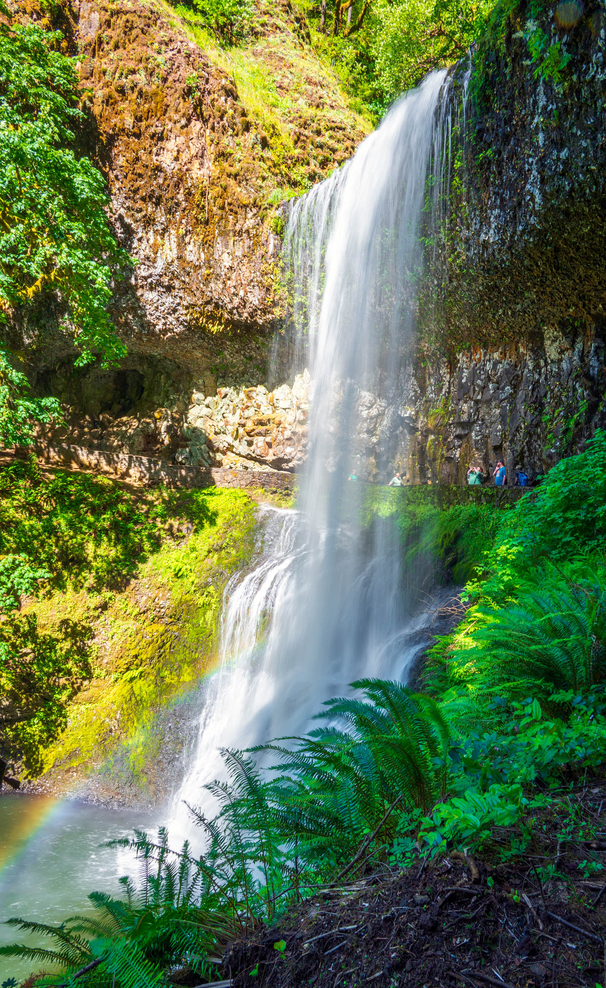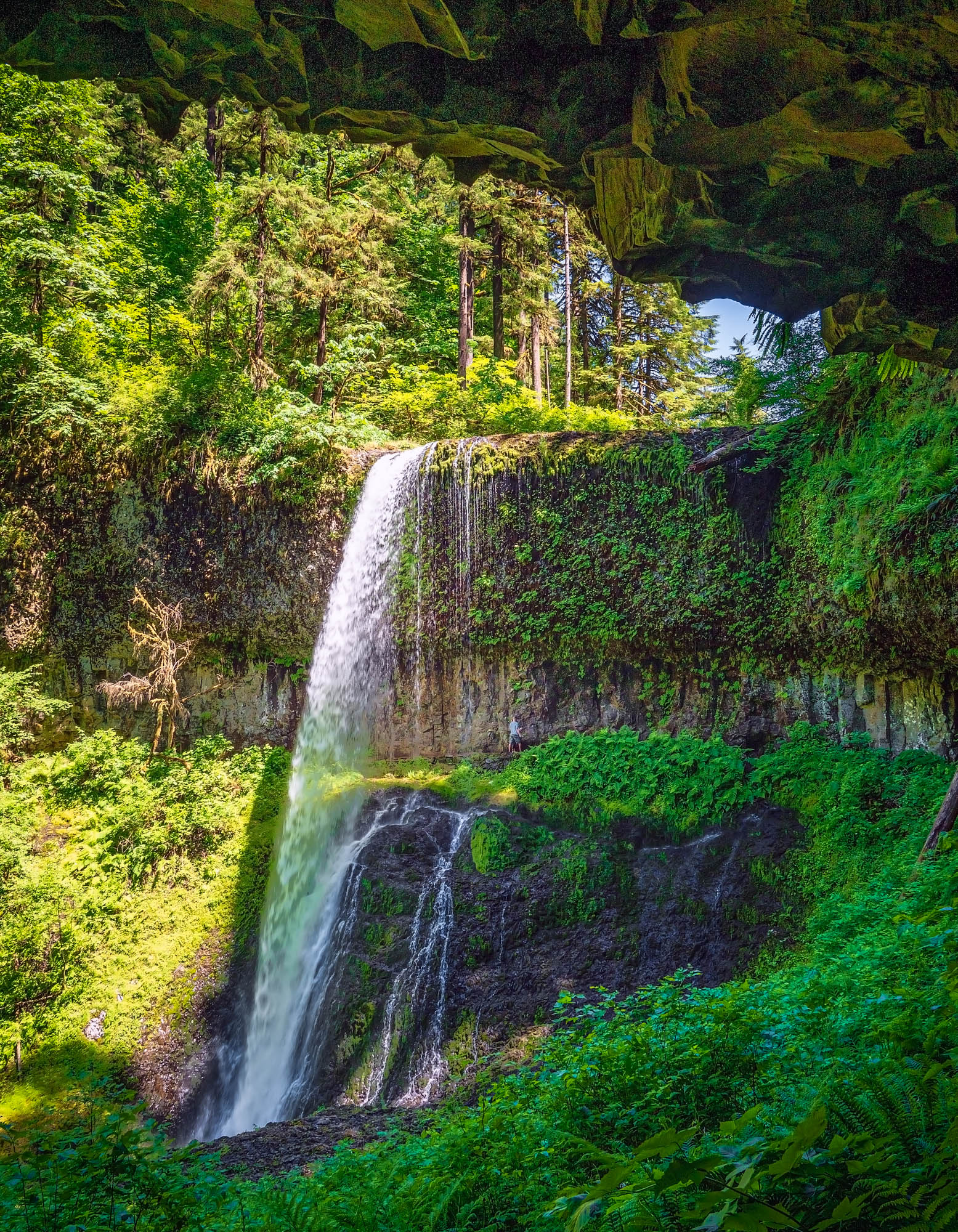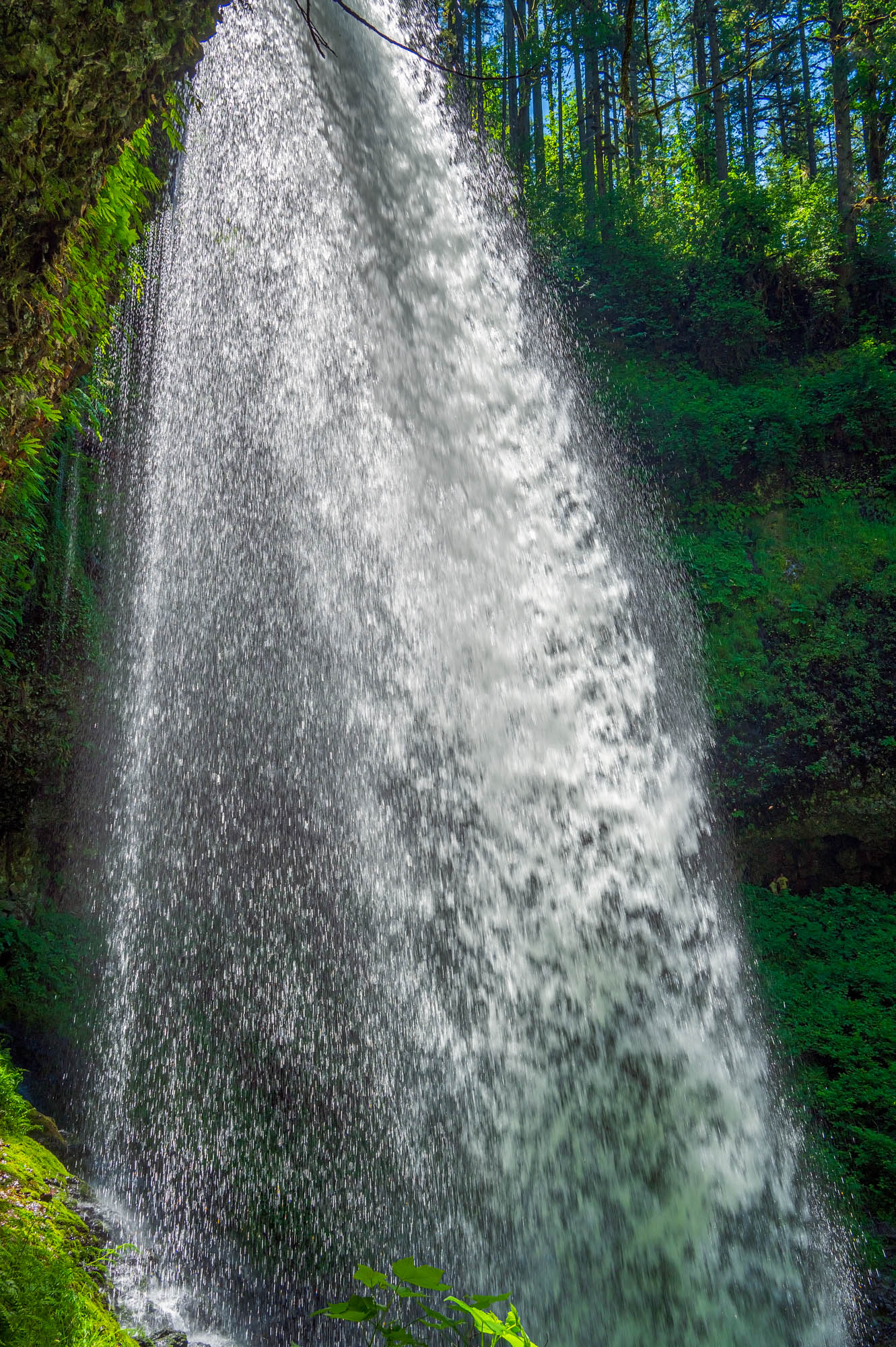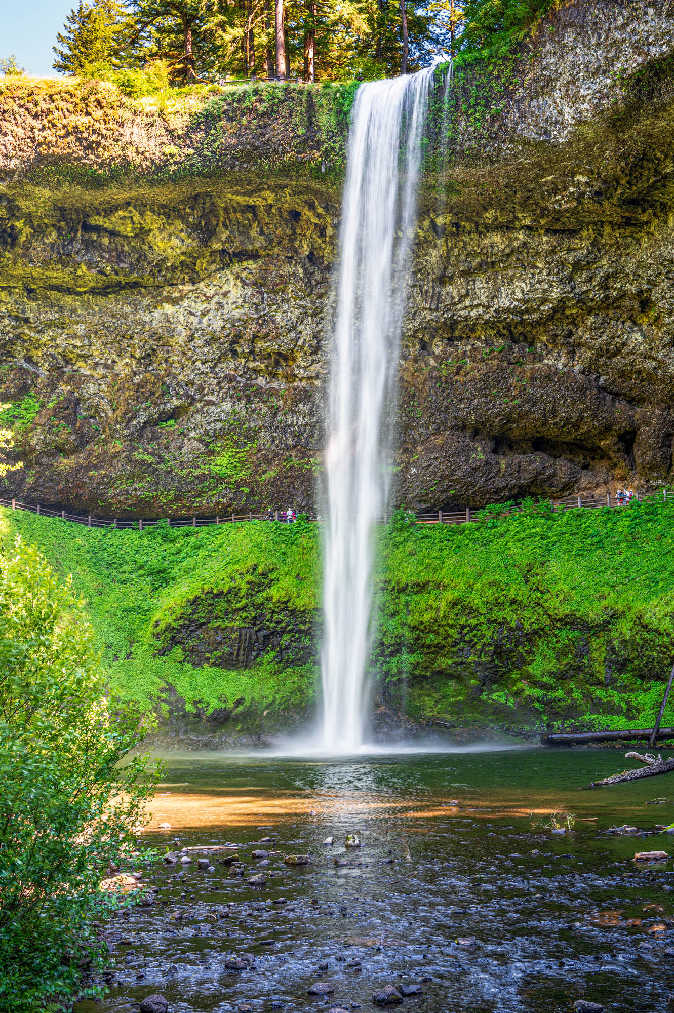 Today, June 16, we visited Silver Falls State Park, located 20 miles east-southeast of Salem and 1 1/2 hour drive from Eugene. The Park is the crown jewel of the Oregon State Parks system, being both Oregon’s largest State Park and boasting one of America’s most impressive waterfall day-hikes, the Trail of Ten Falls, a 7.8 mile loop trail that runs along the banks of Silver Creek and passes by 10 waterfalls. Four of the ten falls have an amphitheater-like surrounding that allows the trail to pass behind the flow of the falls. We started this hike going in a counterclockwise direction from the Silver Falls Lodge along the rim of the canyon. We entered a magnificent cathedral-like old-growth forest of towering Douglas firs and hemlocks on a beautiful maintained trail. The first waterfall we came to was the Upper North Falls, 65 feet tall, cascading off a basalt cliff formed by ancient lava flows. We’ve got nine more to go, so we continued along the trail descending a lot of stairs to view the North Falls. At 136 feet tall it is one of the tallest falls in the park, and the huge grotto behind the falls was amazing to walk under. Another mile down the trail we came to a side view of the 31-foot Twin Falls. Then we took another side trail to view the 134-foot Winter Falls which had a good flow of water still. We stopped on a bench to capture our photo in front of the falls. Returning to the main loop, we headed down the Canyon Trail to pass near the top of Middle North Falls and down the side trail that goes behind the 106-foot high falls and further along the slope to an overhang to get a dramatic view looking back at Middle North Fork Falls framed by mossy maples. So far of all the falls we have seen, this one is our favorite because the cascading water is so close to the trail when you walk behind it. The next waterfall we saw was the view from the wooden platform of the single 27-foot drop Drake Falls, named after the man who helped make this place a State Park. We took the side trail to view the two-tiered Double Falls, the tallest waterfall in the park at 178 feet.