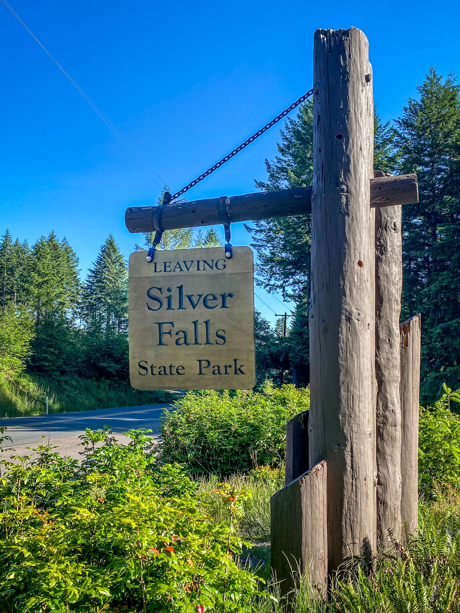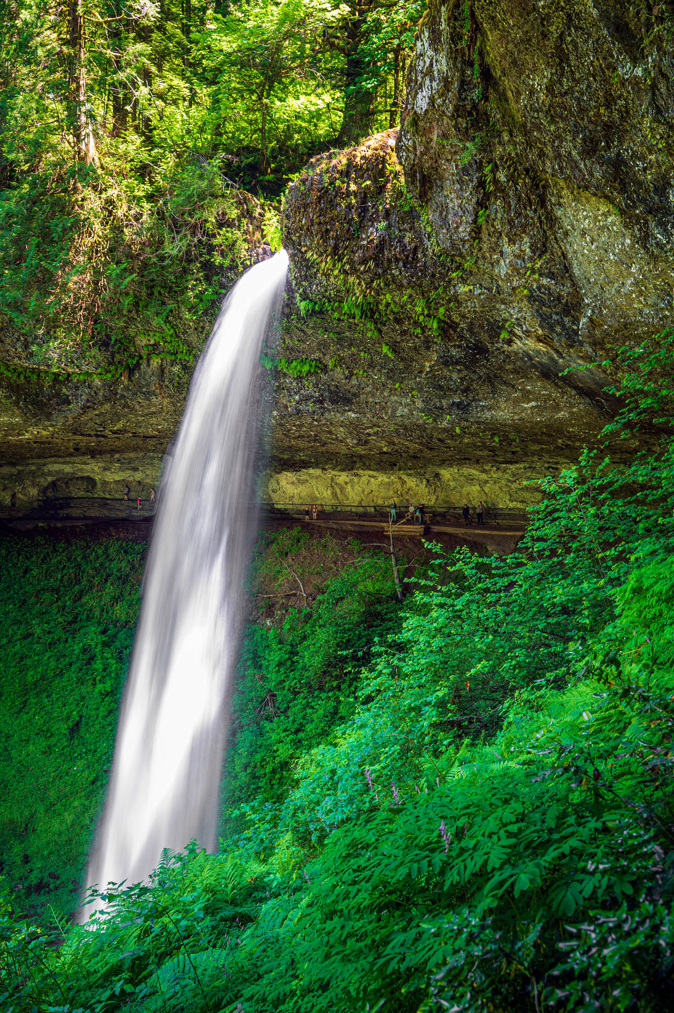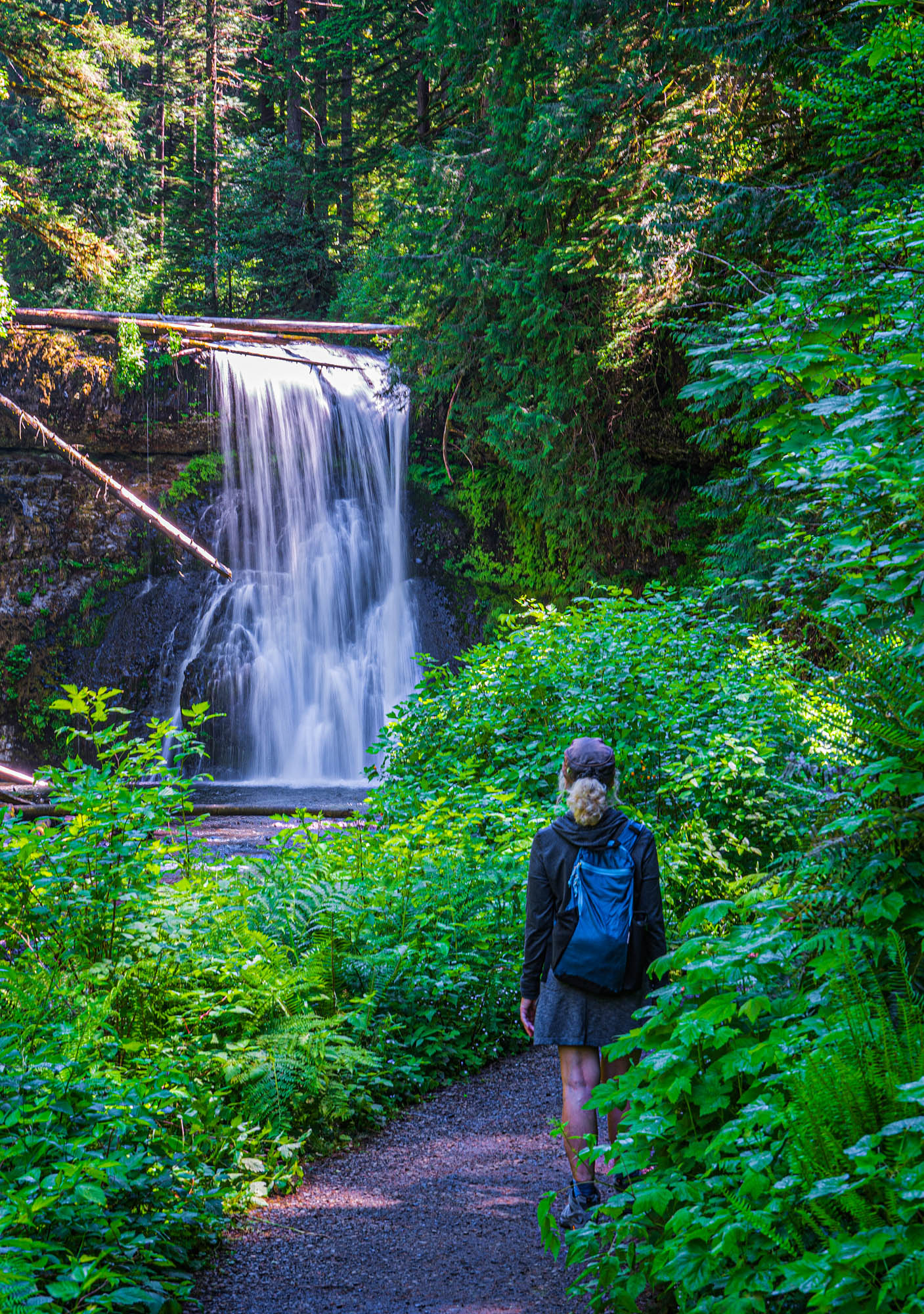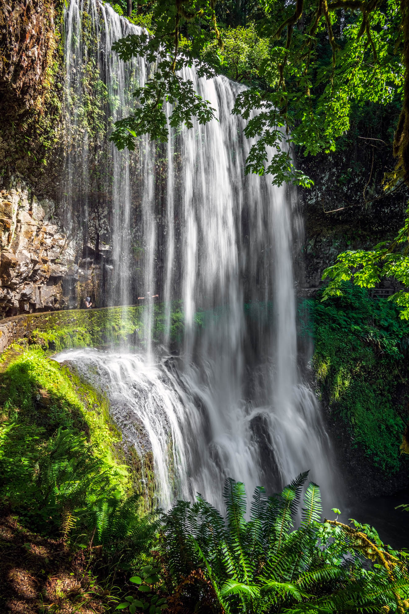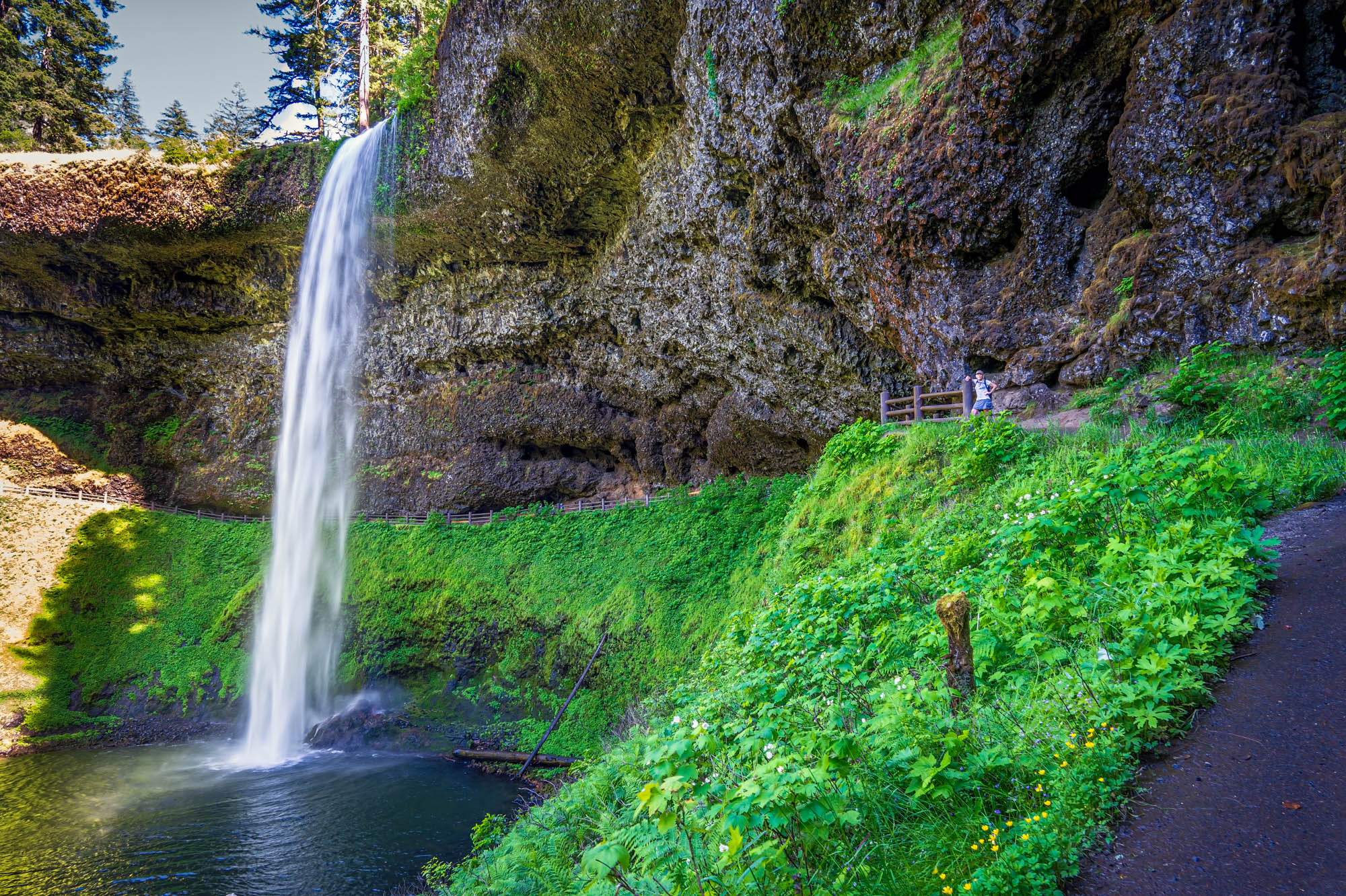 Today, June 16, we visited Silver Falls State Park, located 20 miles east-southeast of Salem and 1 1/2 hour drive from Eugene. The Park is the crown jewel of the Oregon State Parks system, being both Oregon’s largest State Park and boasting one of America’s most impressive waterfall day-hikes, the Trail of Ten Falls, a 7.8 mile loop trail that runs along the banks of Silver Creek and passes by 10 waterfalls. Four of the ten falls have an amphitheater-like surrounding that allows the trail to pass behind the flow of the falls. We started this hike going in a counterclockwise direction from the Silver Falls Lodge along the rim of the canyon. We entered a magnificent cathedral-like old-growth forest of towering Douglas firs and hemlocks on a beautiful maintained trail. The first waterfall we came to was the Upper North Falls, 65 feet tall, cascading off a basalt cliff formed by ancient lava flows. We’ve got nine more to go, so we continued along the trail descending a lot of stairs to view the North Falls. At 136 feet tall it is one of the tallest falls in the park, and the huge grotto behind the falls was amazing to walk under. Another mile down the trail we came to a side view of the 31-foot Twin Falls. Then we took another side trail to view the 134-foot Winter Falls which had a good flow of water still. We stopped on a bench to capture our photo in front of the falls. Returning to the main loop, we headed down the Canyon Trail to pass near the top of Middle North Falls and down the side trail that goes behind the 106-foot high falls and further along the slope to an overhang to get a dramatic view looking back at Middle North Fork Falls framed by mossy maples. So far of all the falls we have seen, this one is our favorite because the cascading water is so close to the trail when you walk behind it. The next waterfall we saw was the view from the wooden platform of the single 27-foot drop Drake Falls, named after the man who helped make this place a State Park. We took the side trail to view the two-tiered Double Falls, the tallest waterfall in the park at 178 feet.