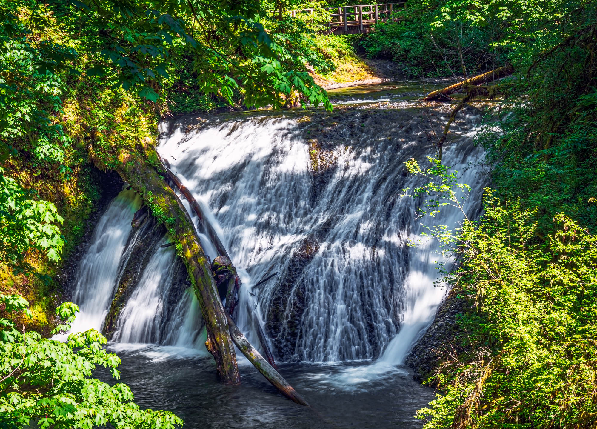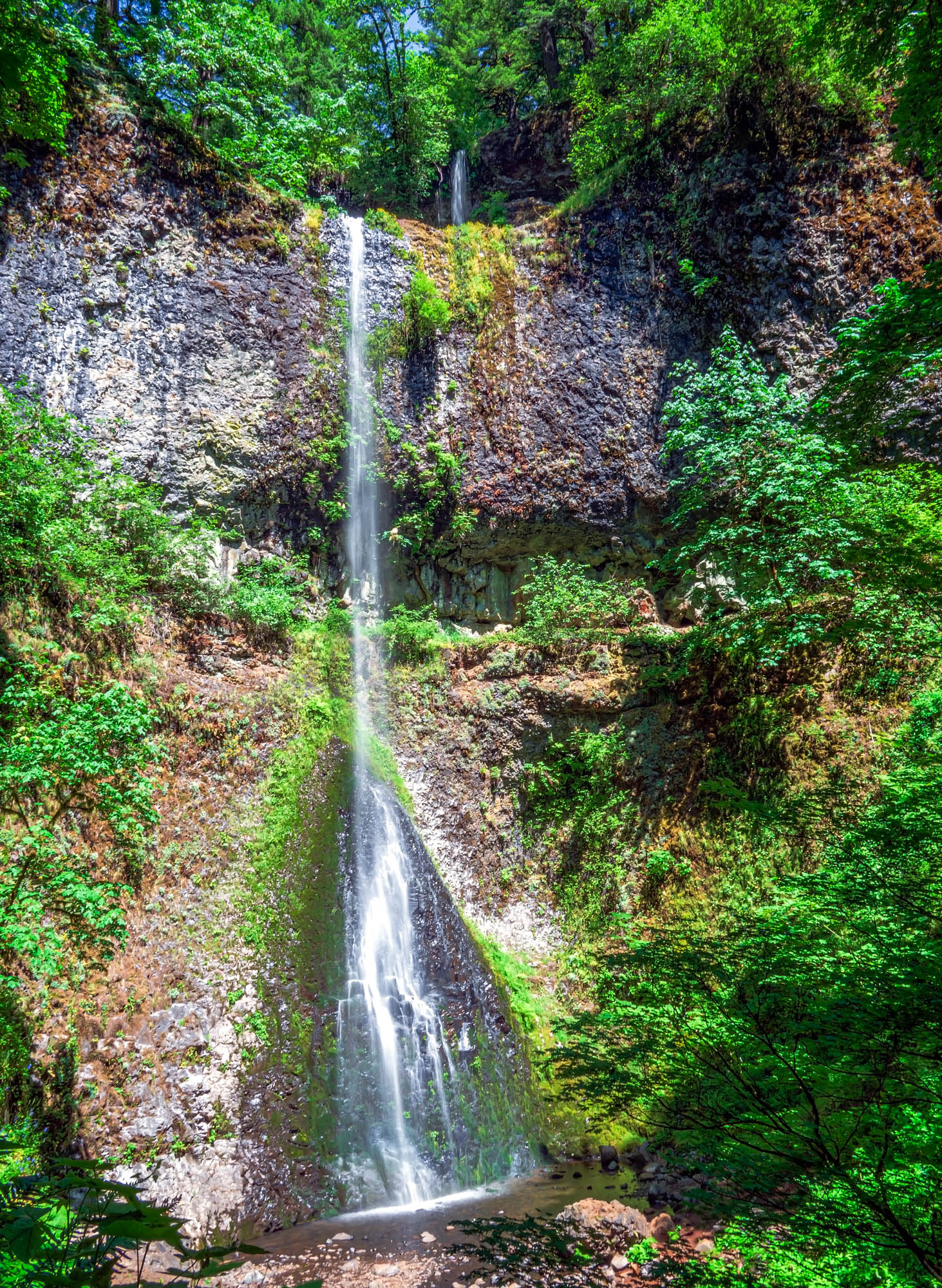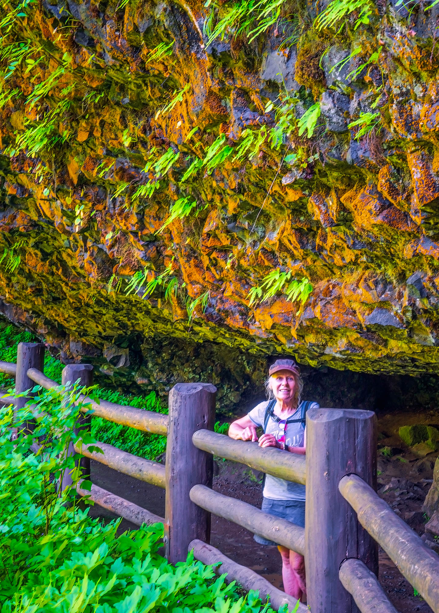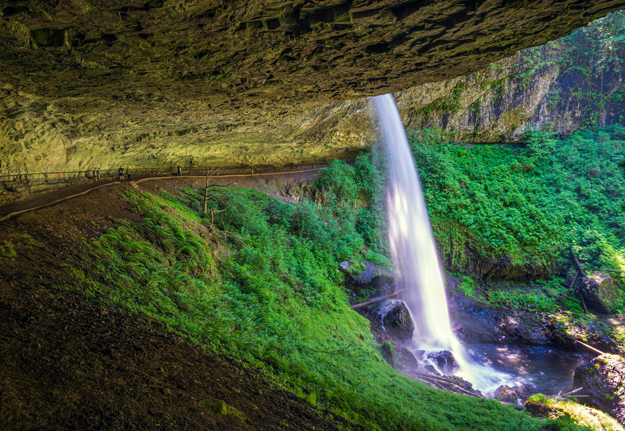Today, June 16, we visited Silver Falls State Park, located 20 miles east-southeast of Salem and 1 1/2 hour drive from Eugene. The Park is the crown jewel of the Oregon State Parks system, being both Oregon’s largest State Park and boasting one of America’s most impressive waterfall day-hikes, the Trail of Ten Falls, a 7.8 mile loop trail that runs along the banks of Silver Creek and passes by 10 waterfalls. Four of the ten falls have an amphitheater-like surrounding that allows the trail to pass behind the flow of the falls. We started this hike going in a counterclockwise direction from the Silver Falls Lodge along the rim of the canyon. We entered a magnificent cathedral-like old-growth forest of towering Douglas firs and hemlocks on a beautiful maintained trail. The first waterfall we came to was the Upper North Falls, 65 feet tall, cascading off a basalt cliff formed by ancient lava flows. We’ve got nine more to go, so we continued along the trail descending a lot of stairs to view the North Falls. At 136 feet tall it is one of the tallest falls in the park, and the huge grotto behind the falls was amazing to walk under. Another mile down the trail we came to a side view of the 31-foot Twin Falls. Then we took another side trail to view the 134-foot Winter Falls which had a good flow of water still. We stopped on a bench to capture our photo in front of the falls. Returning to the main loop, we headed down the Canyon Trail to pass near the top of Middle North Falls and down the side trail that goes behind the 106-foot high falls and further along the slope to an overhang to get a dramatic view looking back at Middle North Fork Falls framed by mossy maples. So far of all the falls we have seen, this one is our favorite because the cascading water is so close to the trail when you walk behind it. The next waterfall we saw was the view from the wooden platform of the single 27-foot drop Drake Falls, named after the man who helped make this place a State Park. We took the side trail to view the two-tiered Double Falls, the tallest waterfall in the park at 178 feet.
