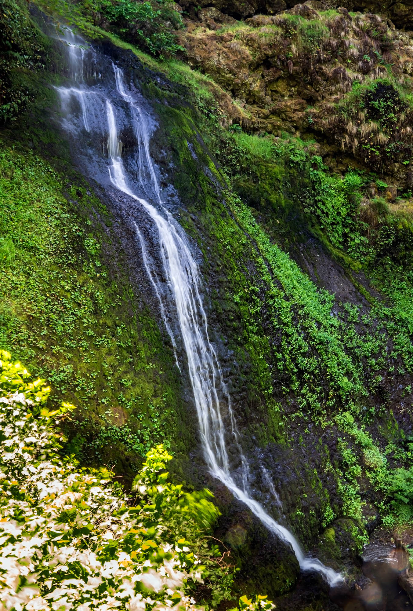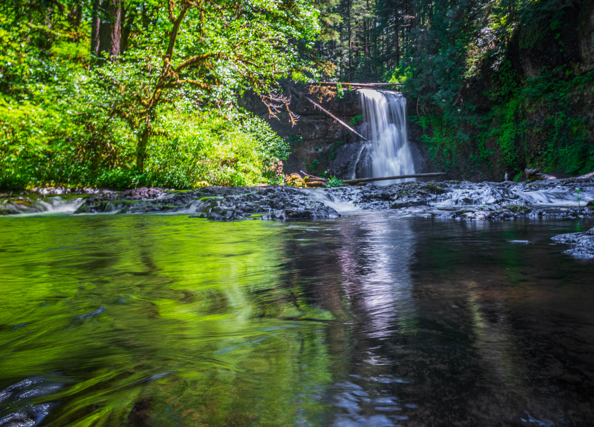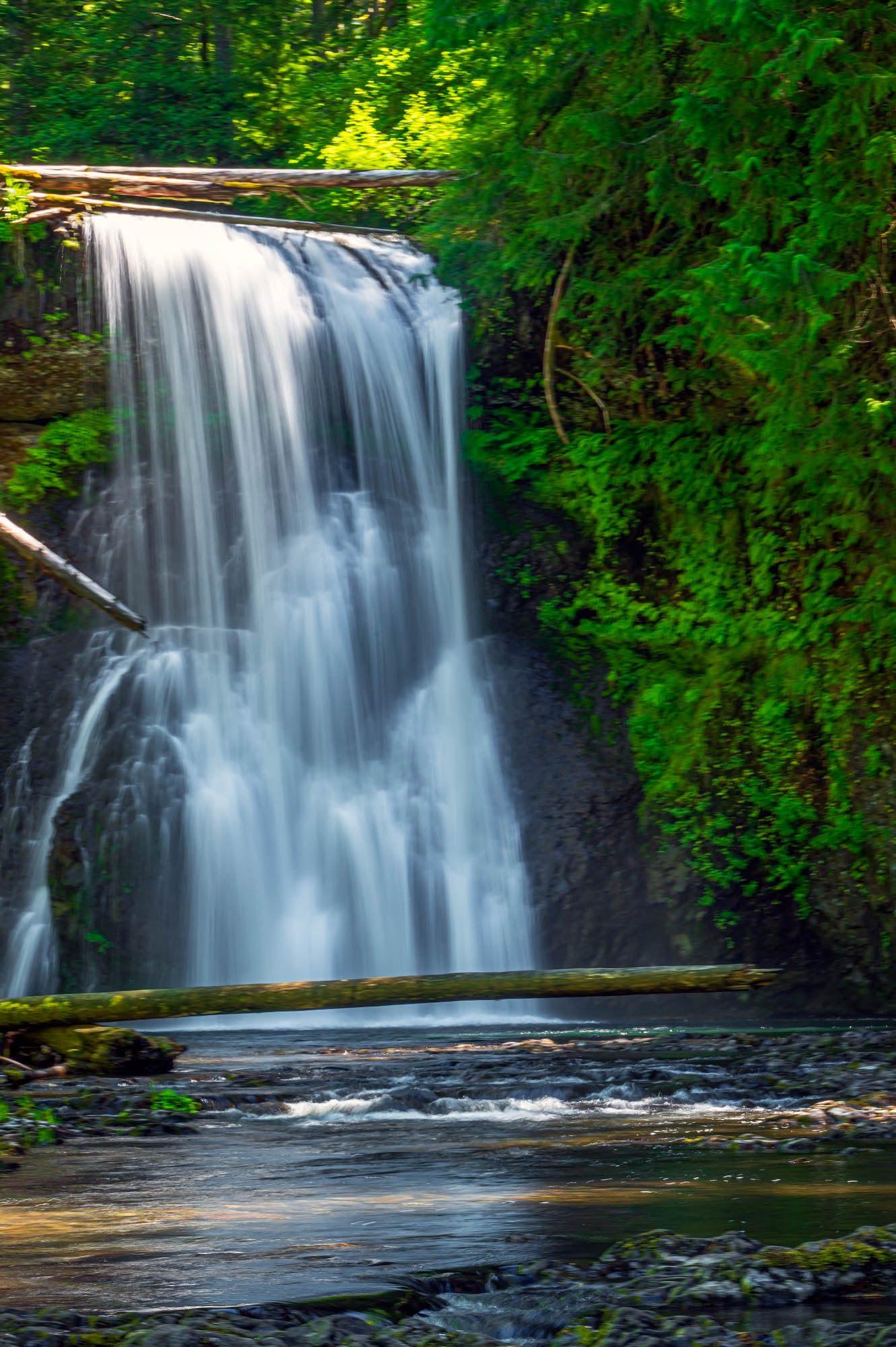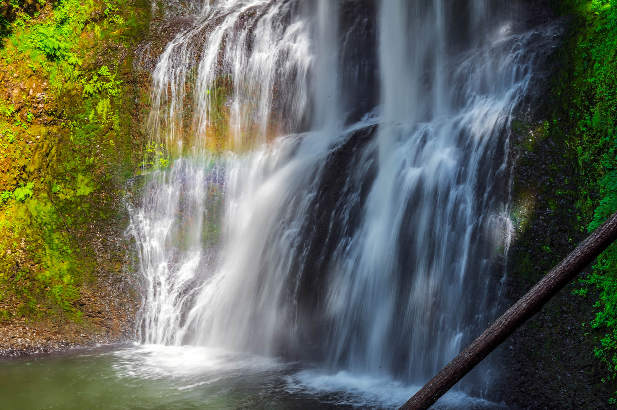 Today, June 16, we visited Silver Falls State Park, located 20 miles east-southeast of Salem and 1 1/2 hour drive from Eugene. The Park is the crown jewel of the Oregon State Parks system, being both Oregon’s largest State Park and boasting one of America’s most impressive waterfall day-hikes, the Trail of Ten Falls, a 7.8 mile loop trail that runs along the banks of Silver Creek and passes by 10 waterfalls. Four of the ten falls have an amphitheater-like surrounding that allows the trail to pass behind the flow of the falls. We started this hike going in a counterclockwise direction from the Silver Falls Lodge along the rim of the canyon. We entered a magnificent cathedral-like old-growth forest of towering Douglas firs and hemlocks on a beautiful maintained trail. The first waterfall we came to was the Upper North Falls, 65 feet tall, cascading off a basalt cliff formed by ancient lava flows. We’ve got nine more to go, so we continued along the trail descending a lot of stairs to view the North Falls. At 136 feet tall it is one of the tallest falls in the park, and the huge grotto behind the falls was amazing to walk under. Another mile down the trail we came to a side view of the 31-foot Twin Falls. Then we took another side trail to view the 134-foot Winter Falls which had a good flow of water still. We stopped on a bench to capture our photo in front of the falls. Returning to the main loop, we headed down the Canyon Trail to pass near the top of Middle North Falls and down the side trail that goes behind the 106-foot high falls and further along the slope to an overhang to get a dramatic view looking back at Middle North Fork Falls framed by mossy maples. So far of all the falls we have seen, this one is our favorite because the cascading water is so close to the trail when you walk behind it. The next waterfall we saw was the view from the wooden platform of the single 27-foot drop Drake Falls, named after the man who helped make this place a State Park. We took the side trail to view the two-tiered Double Falls, the tallest waterfall in the park at 178 feet.