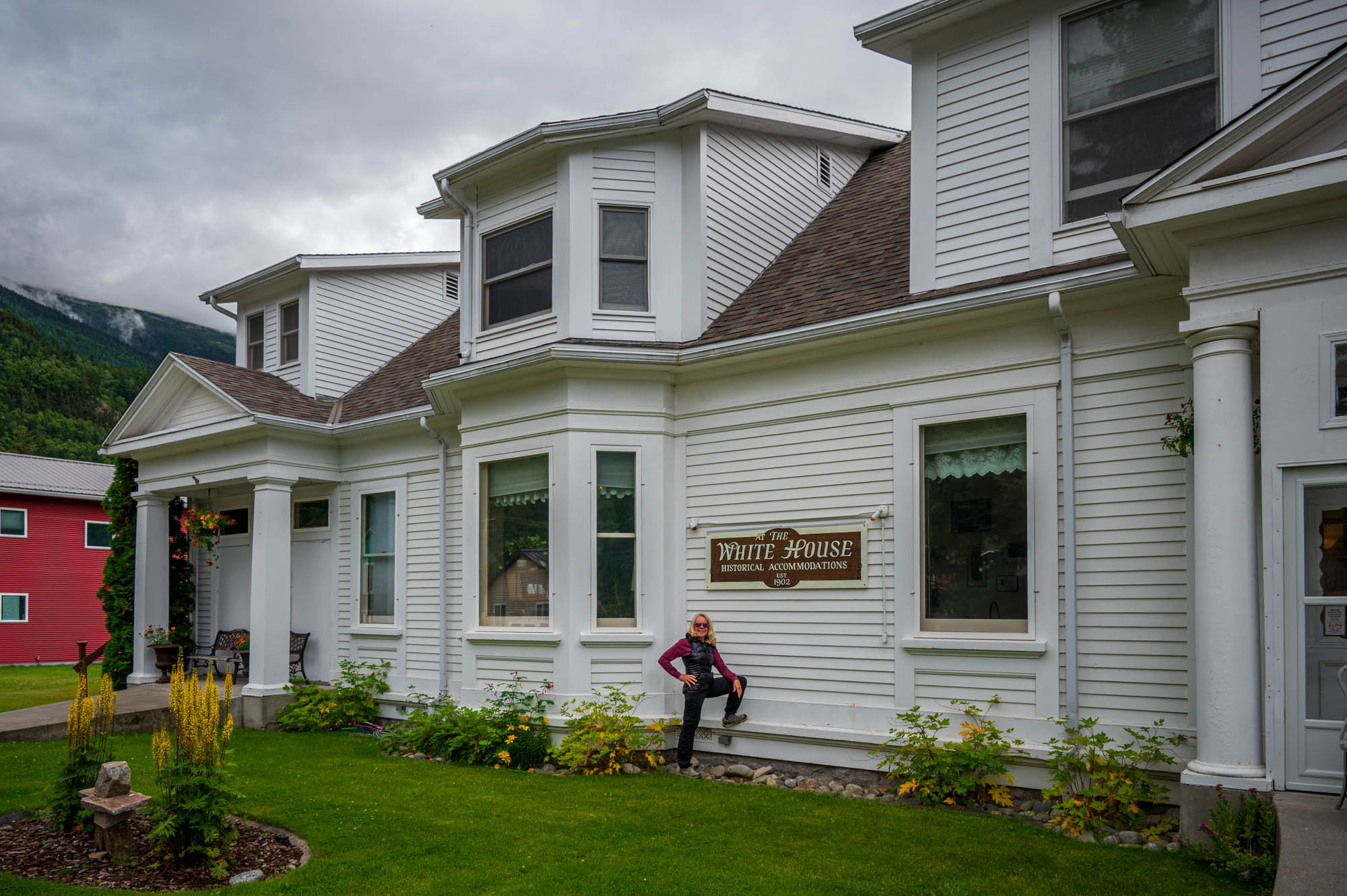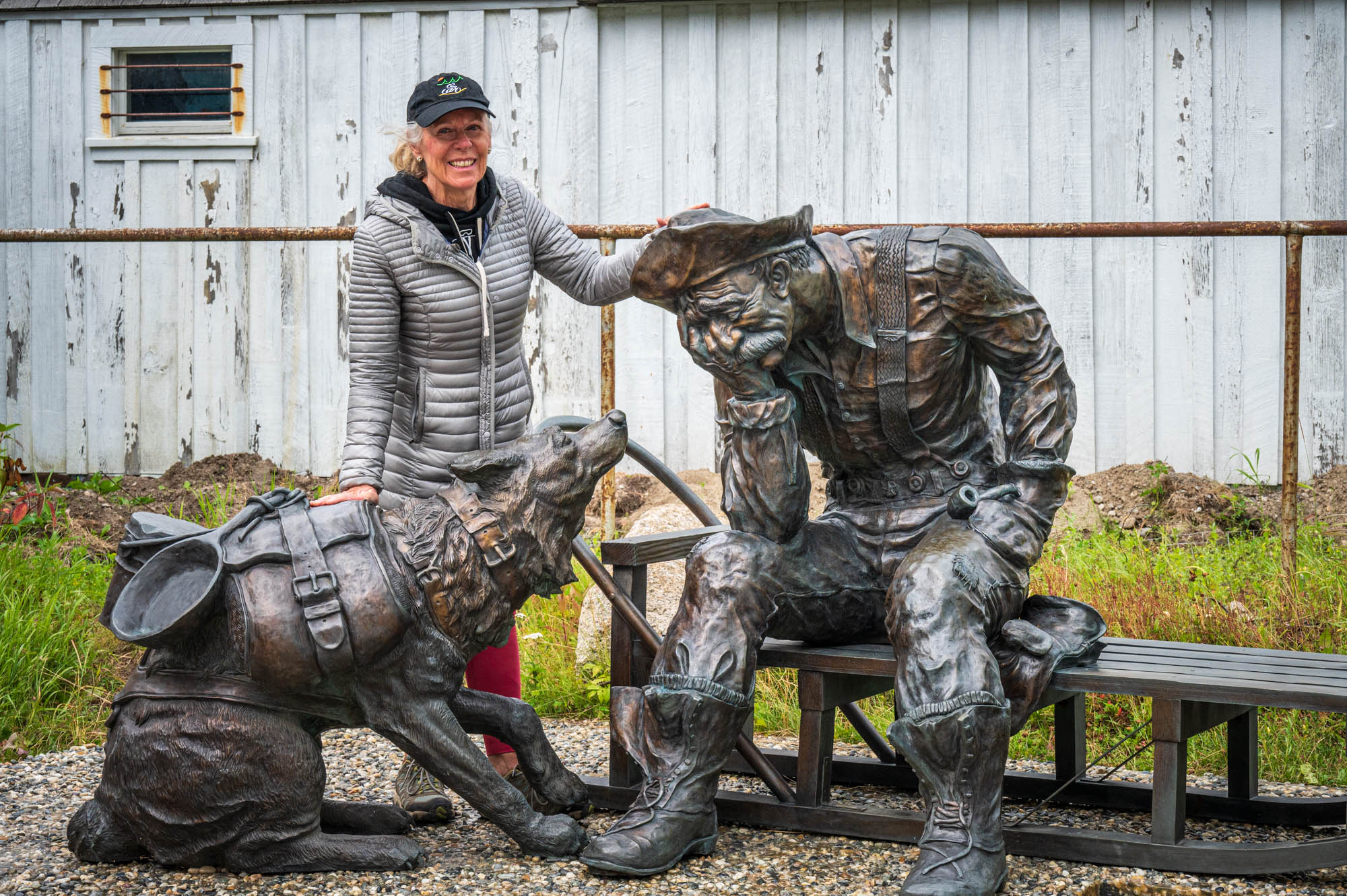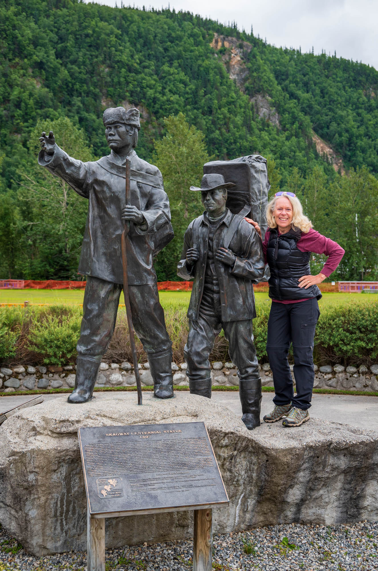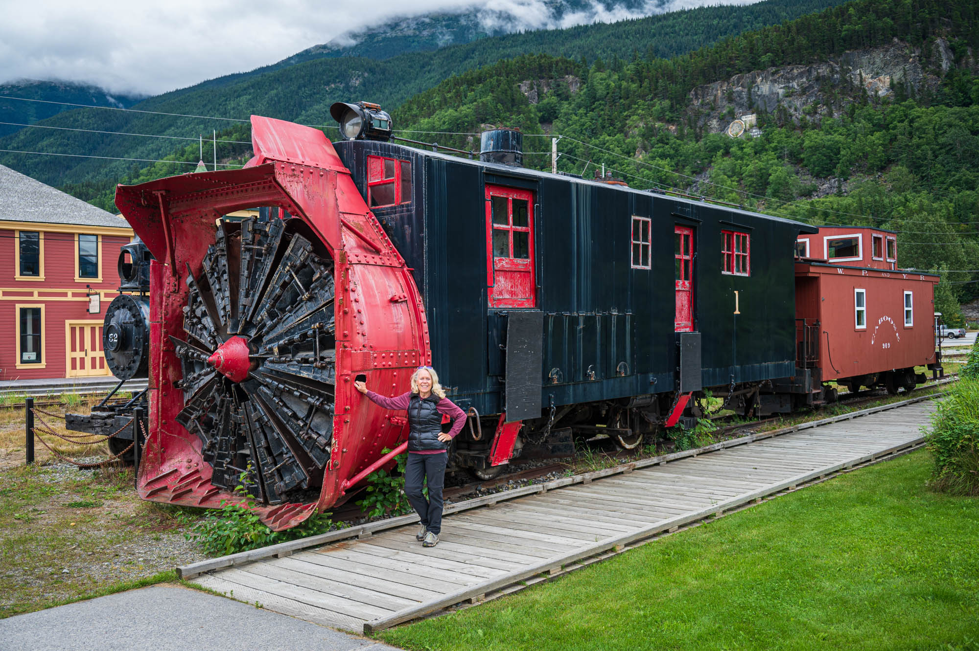 Skagway was originally spelled S-K-A-G-U-A, a Tlinglit word for “windy place”. The first people in this area were Tlinglits from the Chilkoot village in the Haines area. The windy Skagway valley was good for hunting mountain goats and bear, but no one settled here until 1887. After arriving in Skagway we checked into the White House Inn, built in 1902 by gambler Lee Guthrie. It was the finest home in Skagway, and we had a beautiful, large room on the first floor with picture windows. Our first stop in Skagway was to the Red Onion Saloon for pizza and beer. It was built in 1897 during the height of the Gold Rush, the Red Onion Saloon operated as one of the finest Bordellos in town, and you can visit the brothel museum for a link to the past. Racey, old-timey portraits of alluring women still adorn the walls of the Red Onion Saloon and the ghost of Lydia, a former Madame, still haunts the place. Then we explored Skagway and saw beautiful bronze statues. The Skagway Centennial Statue honors the Tlingit packers made famous during the Klondike Gold Rush of 1897-1898, located in a small park at the end of Broadway Avenue. This sculpture represents a typical scene at the start of Chilkoot Trail or White Pass trails in August 1897. The Tlinglit packer wears traditional clothing, made of moosehide and bear fur, and carries a pack from the skin of a mountain goat. He leads a young stampeder, just off a ship, who is determined to reach the gold fields. His pack is a wood-frame box, and outside are strapped his hunting knife, shovel and gold pan. Another bronze sculpture we saw was of a prospector and his dog outside the Alaska Geographic Museum. In the Centennial Park we saw the historic Rotary Snowplow, this is the retired snow plow used by the White Pass & Yukon Railroad: Rotary Snow Plow Number 11. The plow spins its huge blades and throws snow to the side. It was built in 1898 and cleared the tracks until 1964. It was restored in 1995 and displayed for all to see. Click on thumbnail to view images