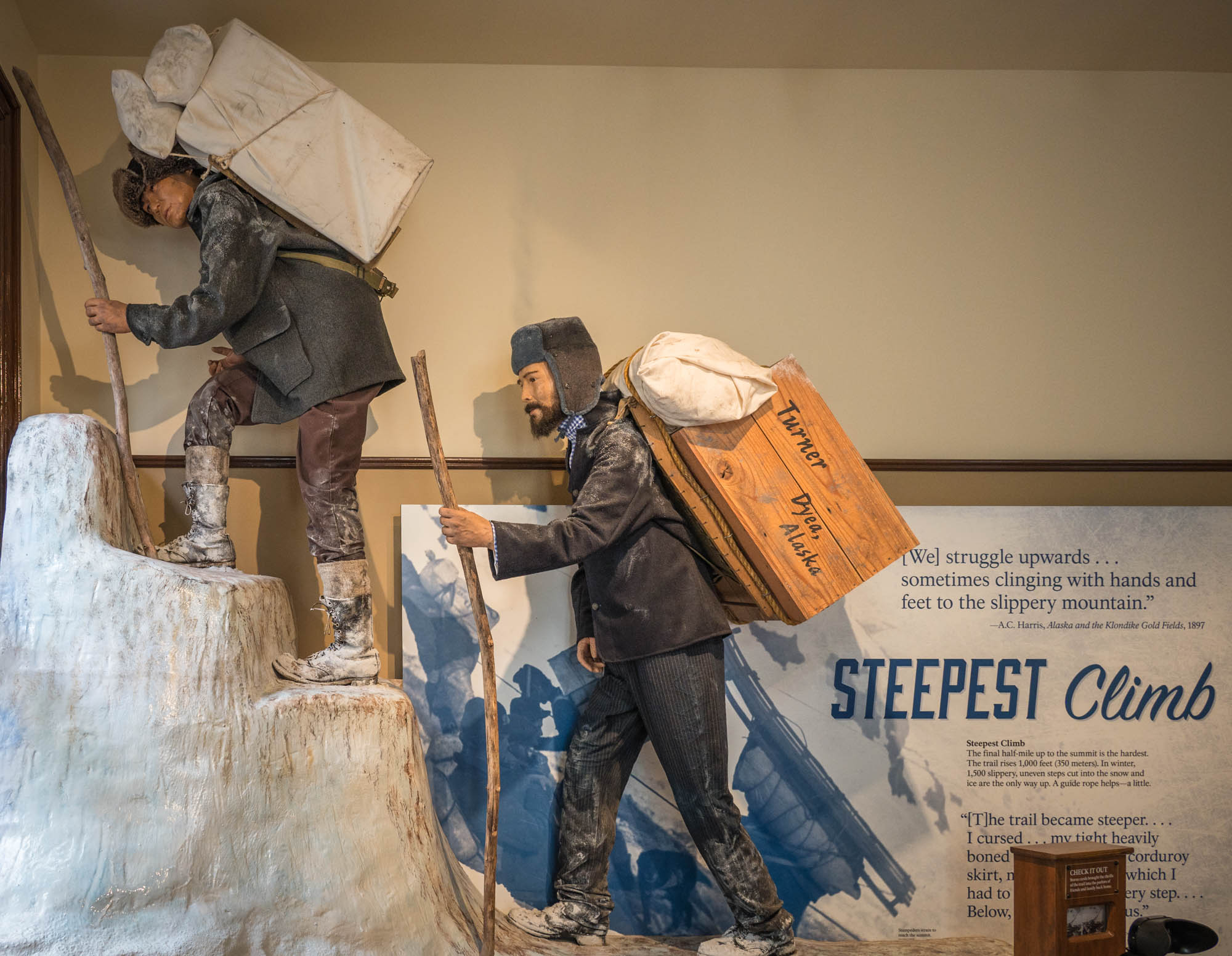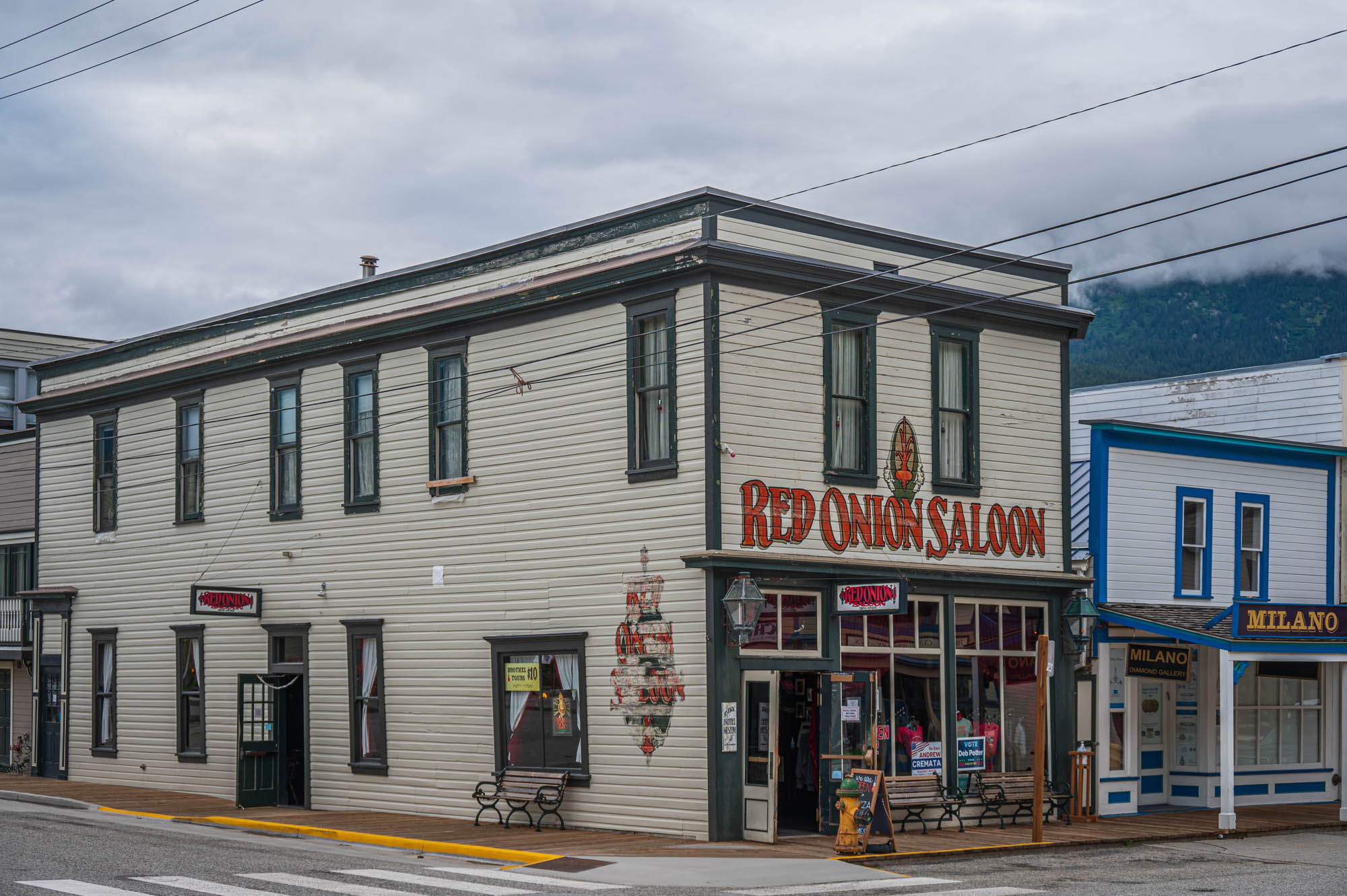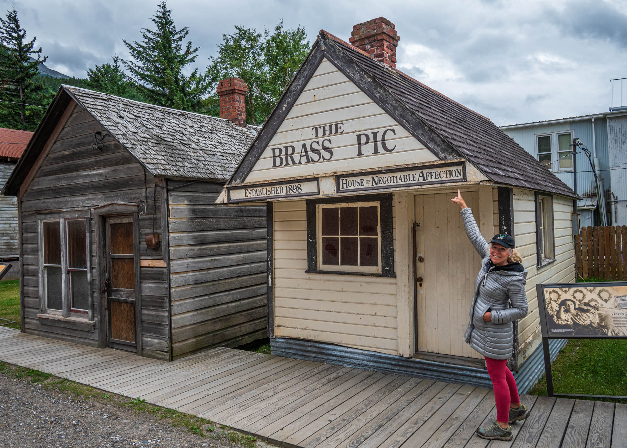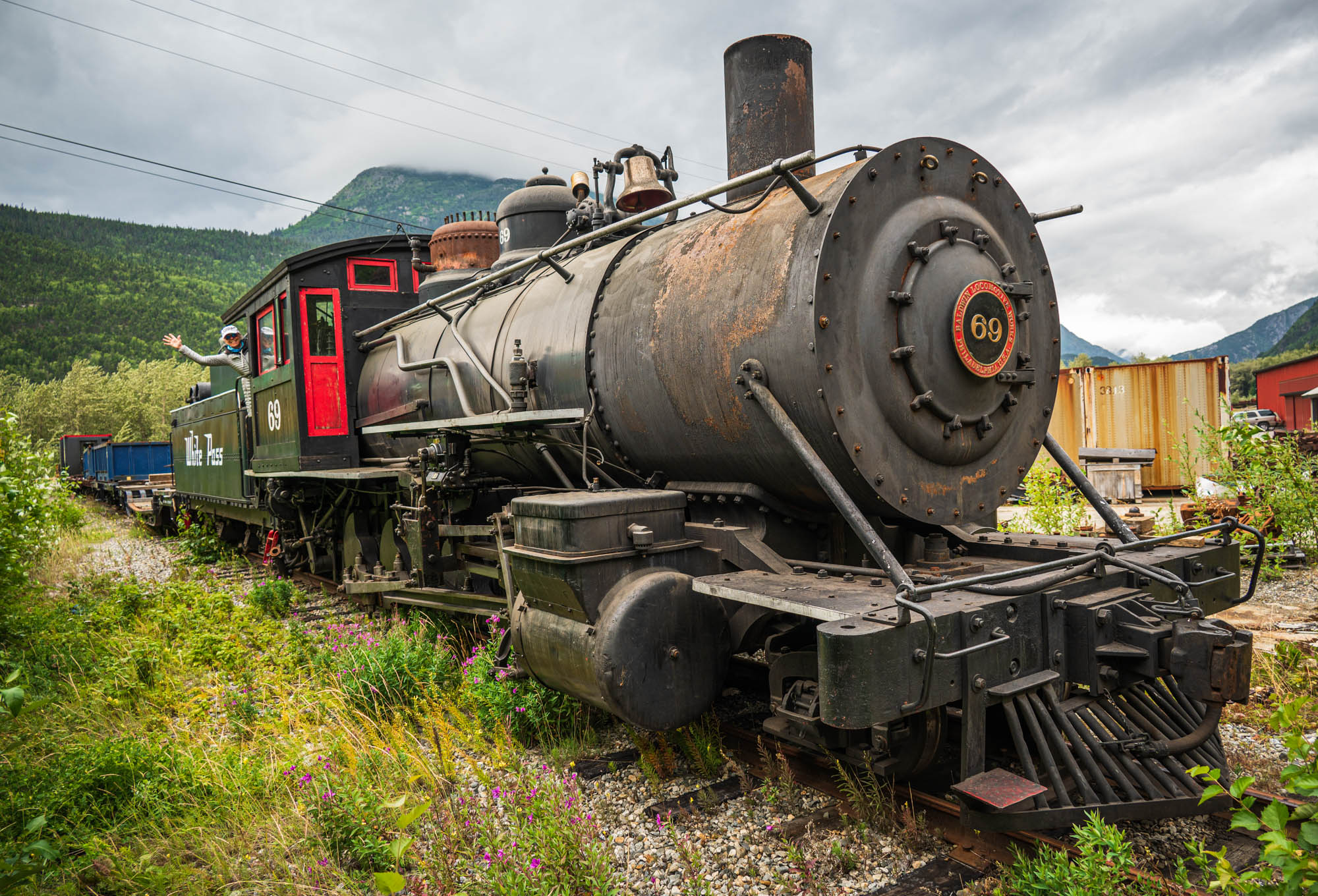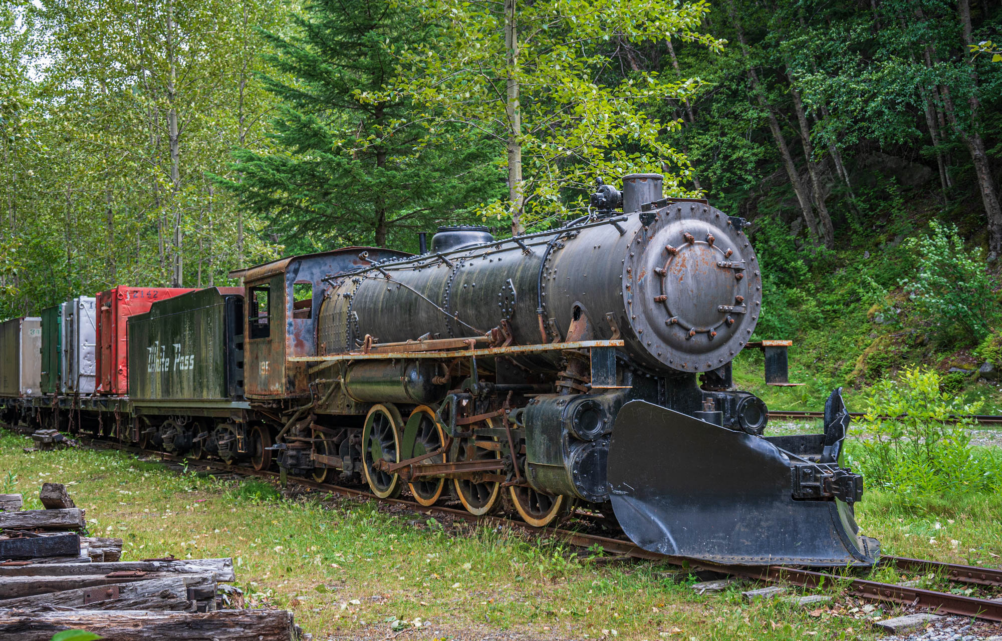 Skagway was originally spelled S-K-A-G-U-A, a Tlinglit word for “windy place”. The first people in this area were Tlinglits from the Chilkoot village in the Haines area. The windy Skagway valley was good for hunting mountain goats and bear, but no one settled here until 1887. After arriving in Skagway we checked into the White House Inn, built in 1902 by gambler Lee Guthrie. It was the finest home in Skagway, and we had a beautiful, large room on the first floor with picture windows. Our first stop in Skagway was to the Red Onion Saloon for pizza and beer. It was built in 1897 during the height of the Gold Rush, the Red Onion Saloon operated as one of the finest Bordellos in town, and you can visit the brothel museum for a link to the past. Racey, old-timey portraits of alluring women still adorn the walls of the Red Onion Saloon and the ghost of Lydia, a former Madame, still haunts the place. Then we explored Skagway and saw beautiful bronze statues. The Skagway Centennial Statue honors the Tlingit packers made famous during the Klondike Gold Rush of 1897-1898, located in a small park at the end of Broadway Avenue. This sculpture represents a typical scene at the start of Chilkoot Trail or White Pass trails in August 1897. The Tlinglit packer wears traditional clothing, made of moosehide and bear fur, and carries a pack from the skin of a mountain goat. He leads a young stampeder, just off a ship, who is determined to reach the gold fields. His pack is a wood-frame box, and outside are strapped his hunting knife, shovel and gold pan. Another bronze sculpture we saw was of a prospector and his dog outside the Alaska Geographic Museum. In the Centennial Park we saw the historic Rotary Snowplow, this is the retired snow plow used by the White Pass & Yukon Railroad: Rotary Snow Plow Number 11. The plow spins its huge blades and throws snow to the side. It was built in 1898 and cleared the tracks until 1964. It was restored in 1995 and displayed for all to see. Click on thumbnail to view images