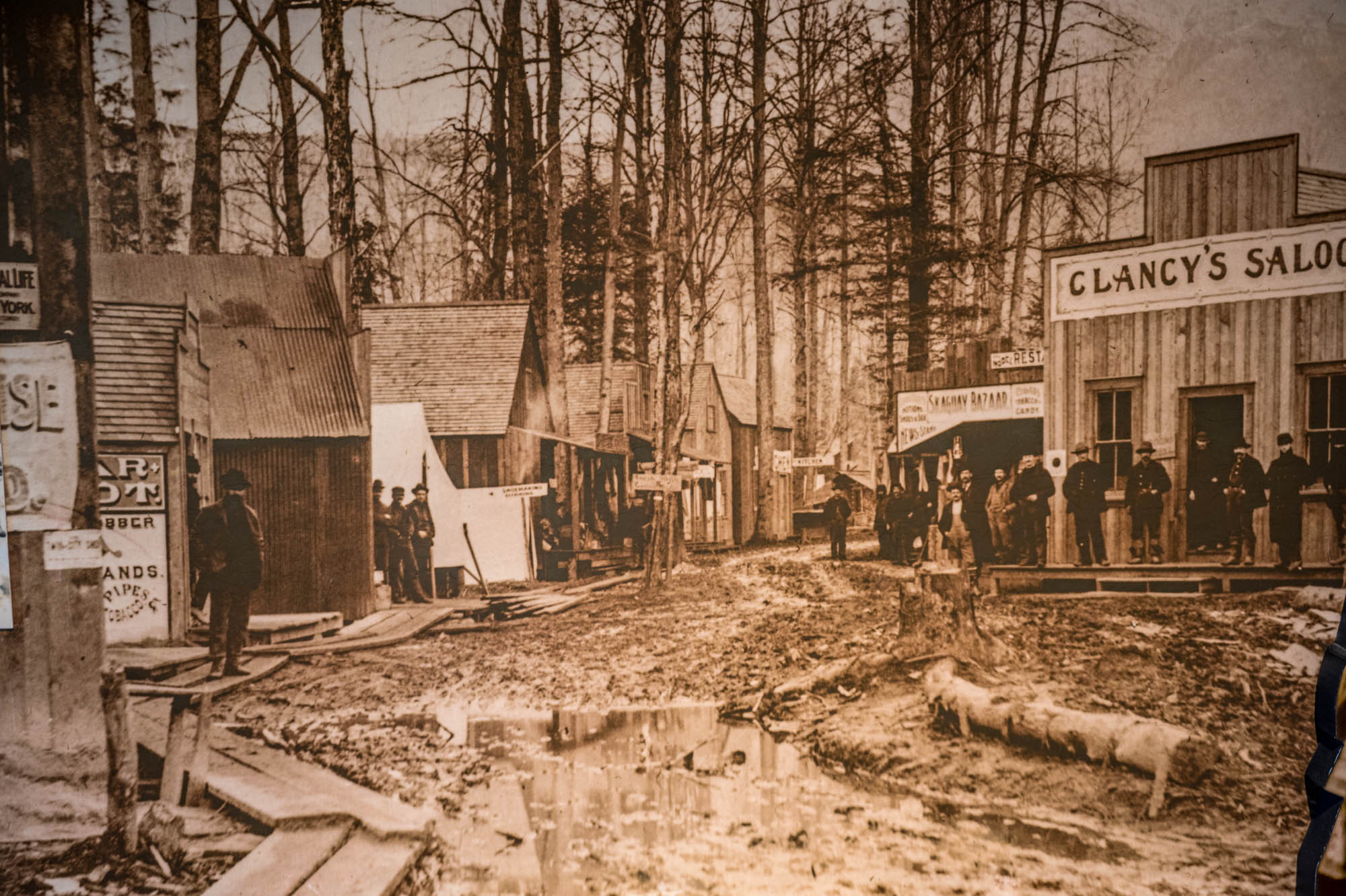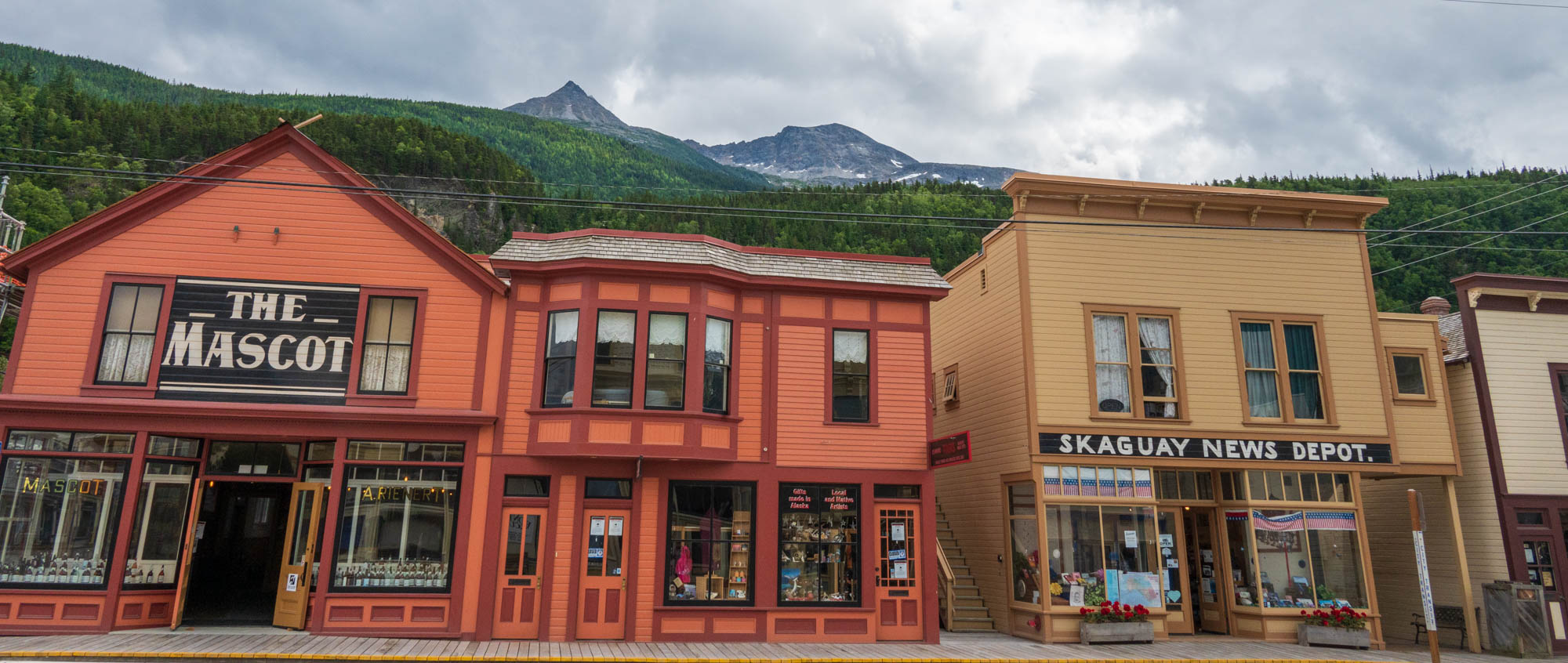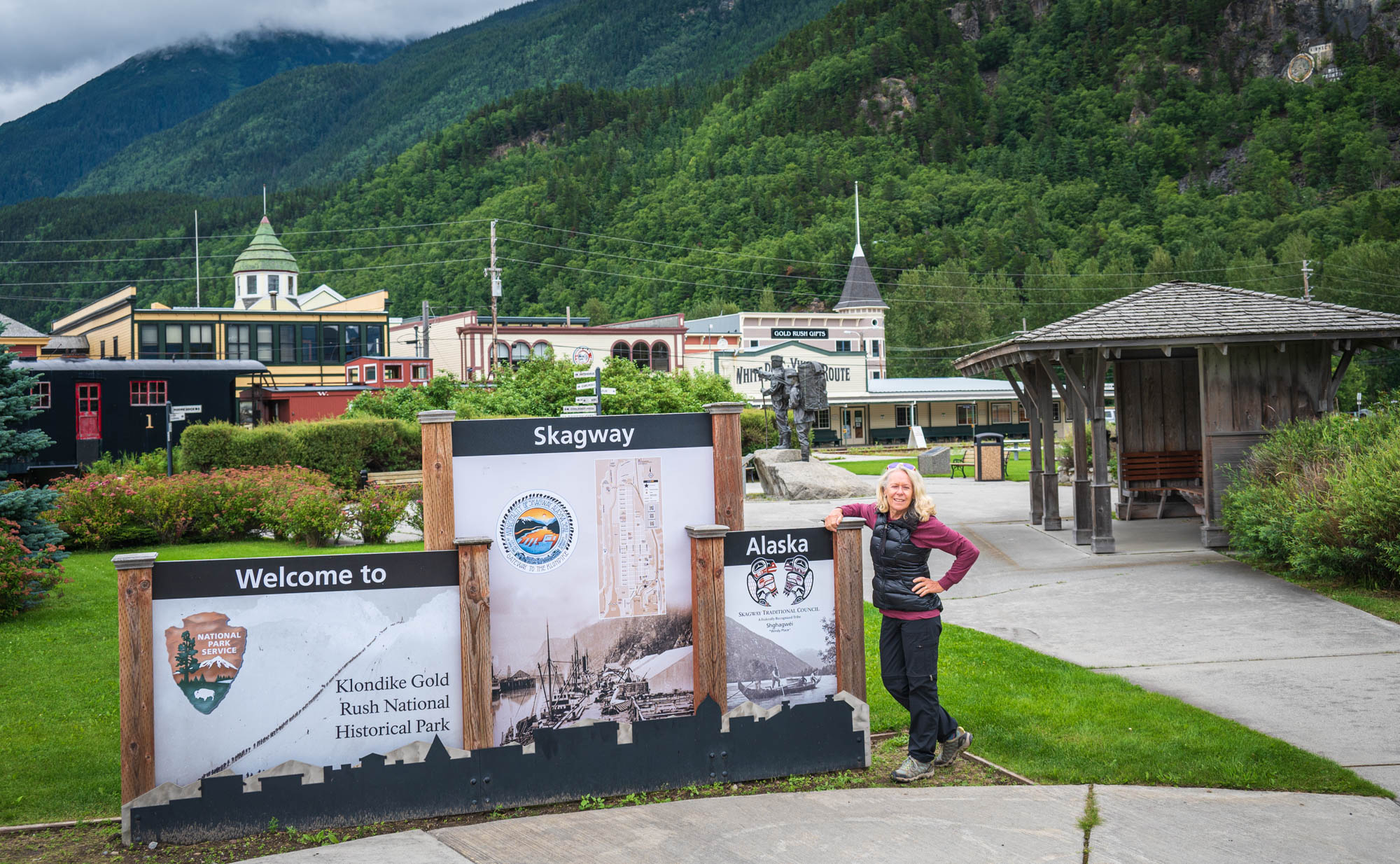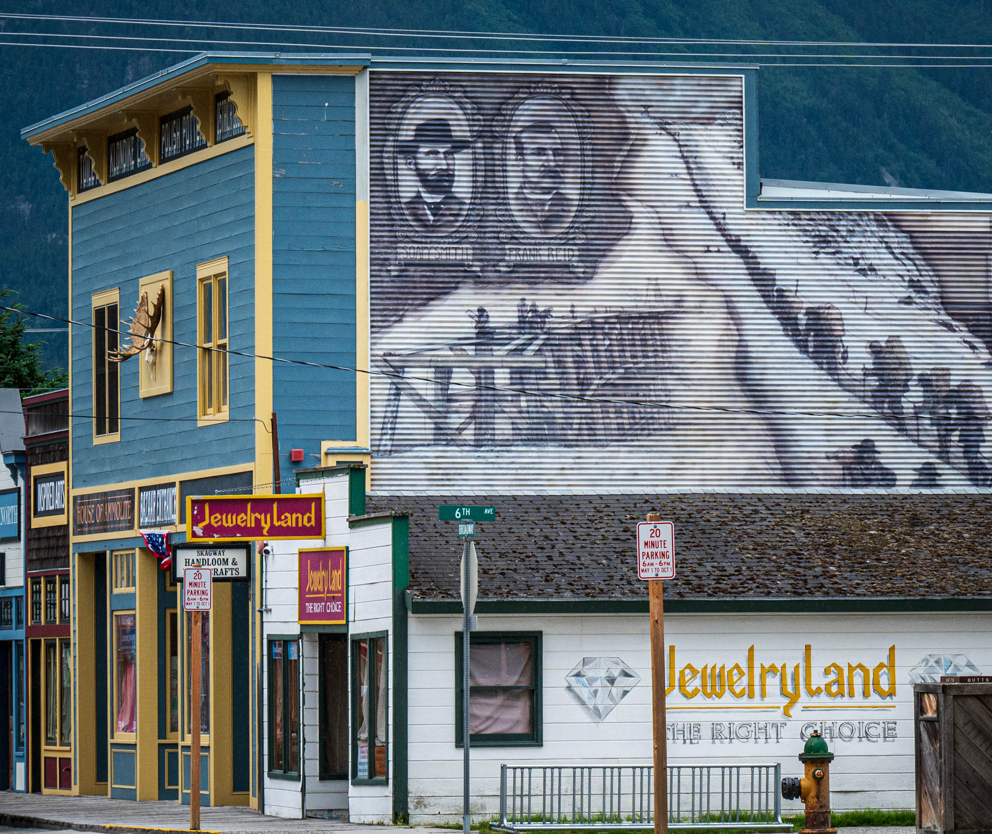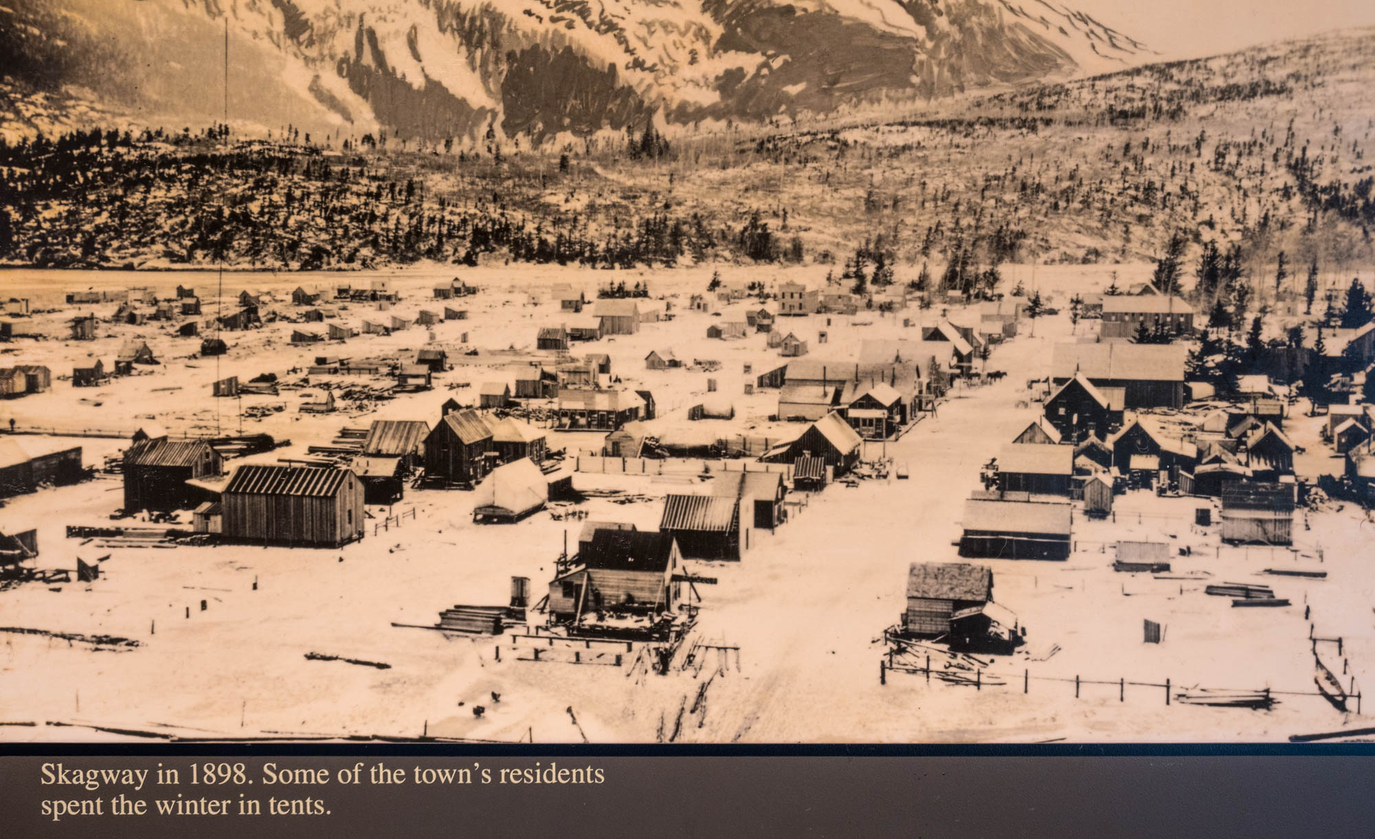 Skagway has an interesting history because of the Klondike Gold Rush from 1897-1898, and we decided to explore more of its history. We drove out to the site where Dyea on the Taiya River Inlet, was once a thriving town with over 5,000 people, but now a ghost town. During the Gold Rush days the Stampeders began their trek from here on the Chilkoot Trail to the gold fields 500 miles away. We visited the Museum in Skagway depicting the town during the Gold Rush days and took several pictures from that era. The founder of Skagway was Captain William Moore who came to the Skagway valley with a Canadian survey team in the spring of 1887. He was impressed by what he saw that he returned in October that year with his son, Ben, to stake a 160-acre homestead in the Skagway valley, and laid a foundation for a cabin and began building a wharf. He believed that gold in large quantities would be found, and had a vision that Skagway, with its deep-water harbor and trail through the White Pass, would become the gateway to those gold fields, the “Gateway to the Klondike Gold Rush”. Our final visit was to explore the Gold Rush Cemetery where the old tombstones are still standing. Click on thumbnail to view images