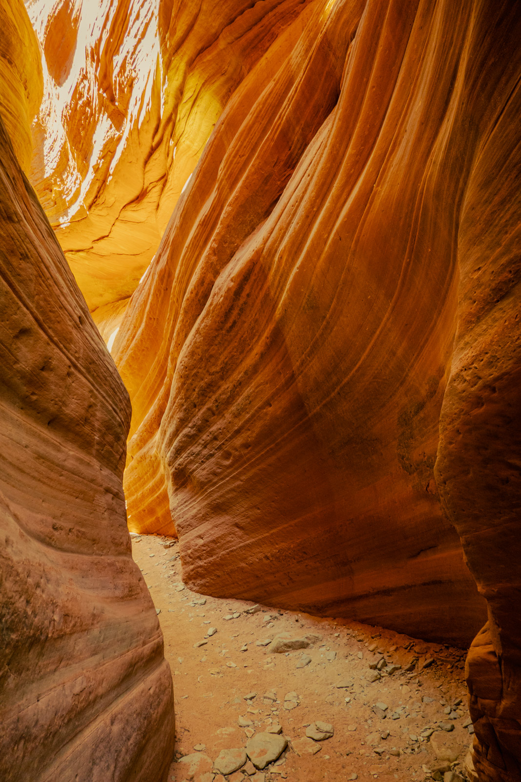 Utah has its share of unique desert scapes, but the land here offers something different too – slot canyons. Kanab’s Peek-a-Boo Canyon is an awesome slot canyon just north of Kanab off of US 89. It was an adventure driving the 4WD sandy track, 2.8 miles, to the drainage below the narrows. We had to stop to deflate the tires because we were getting stuck in the sand. Once we arrived at the slot canyon we hiked into the canyon, only .35 miles long. Some sections were warmer and others were flushed with chilly air as we found our way through the twists and turns of the towering sandstone walls. The abstract designs and dramatic lighting on the narrow walls at midday made for a photographers dream, providing the ideal tools to create a perfect image. Bob was able to create some amazing images of this beautiful slot canyon, Peek-a-Boo, a must see while visiting Kanab. Click on thumbnail to view images