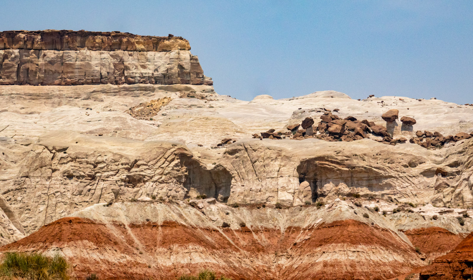 Today we drove to The Toadstools Trailhead just off US-89. The trail is only 1.6 miles R/T, a short hike that travels to a different planet. The trail starts in a wash, then climbs up towards the Entrada Sandstone hills, where it opens into a landscape of hoodoos, alcoves, and balanced rocks. The first toadstool we saw is giant and red, and often the “face” of the Toadstools as it is seen in all the guidebooks. These “toadstools” or hoodoos, form because Dakota Sandstone boulders perch atop pedestals of softer Entrada Sandstone. As the Entrada erodes away, the harder Dakota forms a cap, and leaves a rock column sheltered from water and wind. We wandered among the unworldly towers of balanced rock formations, stopping to take photos of the different “toadstools’ or capped mushrooms along the way. Click on thumbnail to view images