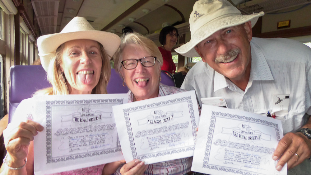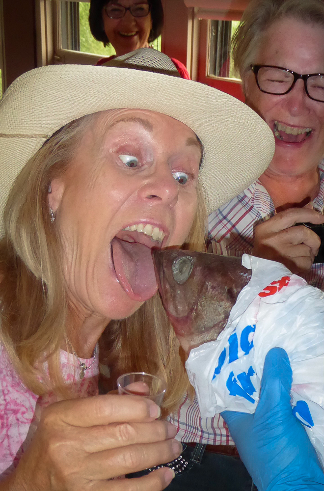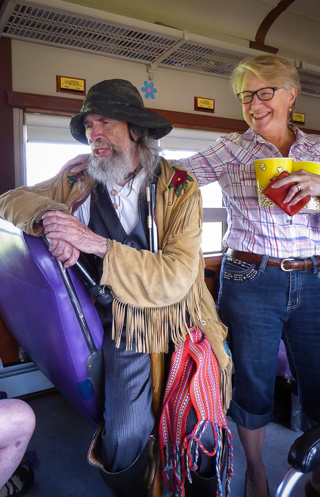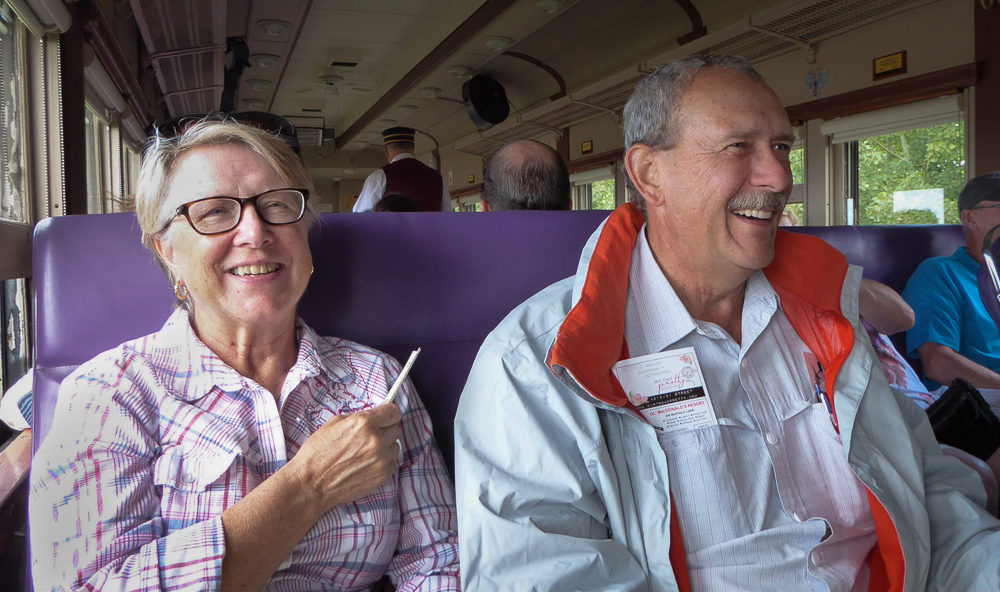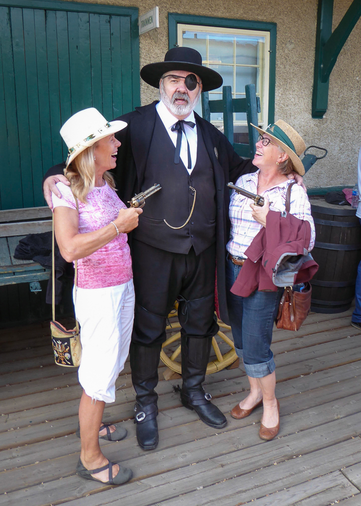 The trip lasts about 6 hours with a stopover in Big Valley and a buffet dinner. Our tickets were for the Newfoundlander Excursion, thus there we’re a lot of Newfie jokes and songs plus a special lobster and steak cooked dinner. We had time to explore the tiny town of Big Valley after dinner and then boarded the train for the ride back to Stettler. On the return trip we all became honorary Newfie’s when we “Kissed the Cod” and slammed back a shot of Screechers Rum. We spent the night at Harry’s brother’s house in Stettler and enjoyed meeting his sister as well. It was a fun day on another historical train ride, and a special time with Pat & Harry.