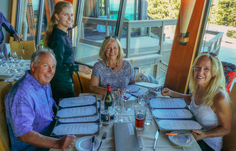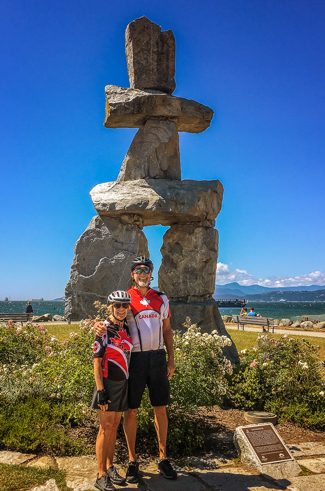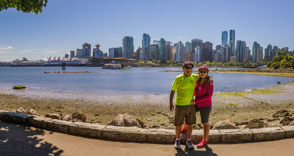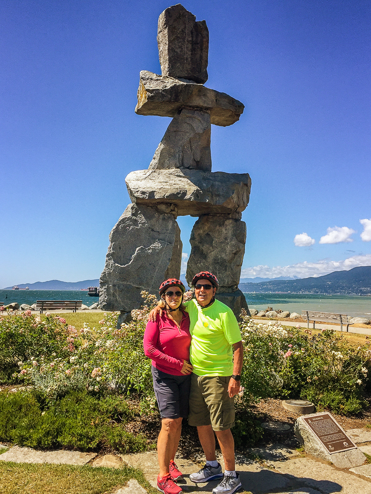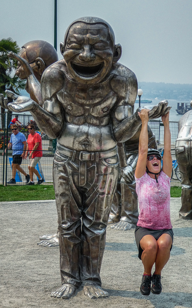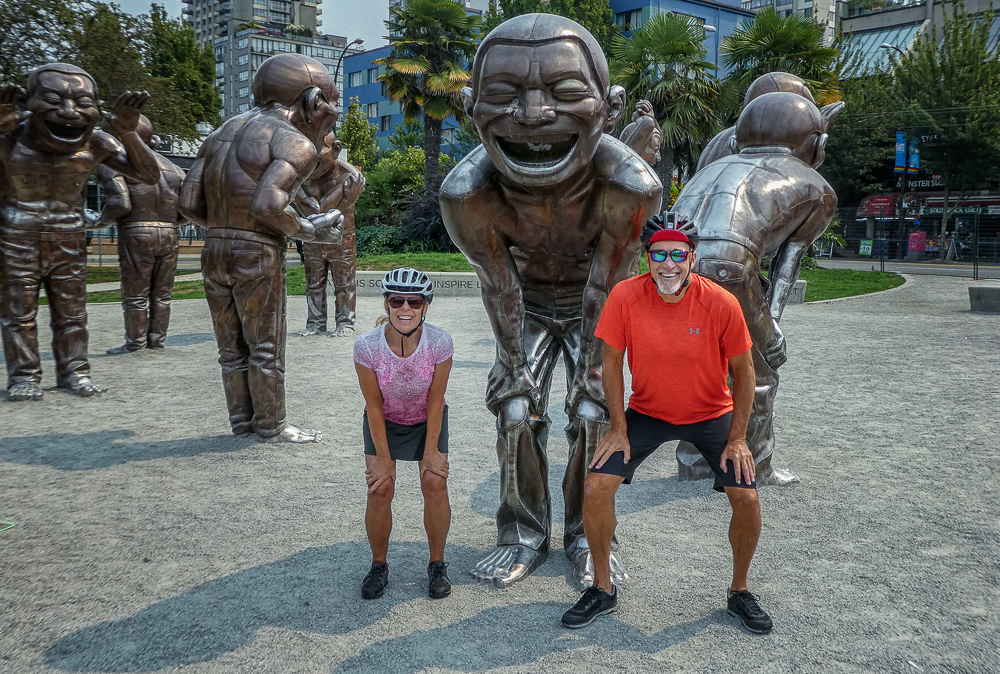Our friends from Cleveland, Ohio, Karen Moyer and Bruce Kahn, came to visit us for a few days on their way to Alaska. We picked them up at the airport and came back to the RV for a fabulous vegan lunch. After lunch we drove into Vancouver and checked in at the Sylvia Hotel, a designated heritage building, built in 1912. Then we walked around English Bay stopping at Morton Park to view the 14 enormous bronze statues, in all different poses, of a shirtless guy laughing hysterically, called A-maze-ing Laughter. We had dinner at the Cactus Club, sitting outside enjoying the sunset across English Bay from our table. The next morning we started our bike ride from the Sylvia Hotel and stopped at Granville Island for breakfast before heading to Stanley Park. What a fabulous day for a ride around Stanley Park, great views of the city and visited many of the sites in the Park. Later we took the gondola up Grouse Mountain to explore the top and have dinner at The Observatory Restaurant. We had two wonderful fun-filled days with Karen and Bruce, couldn’t have had a better time, full of laughs, eating, drinking and sightseeing, and lots of sunshine. Thanks for taking the time to visit us. Click on thumbnail to view images