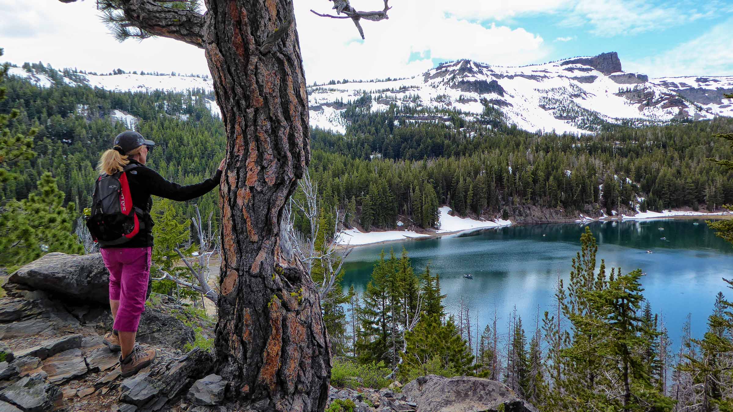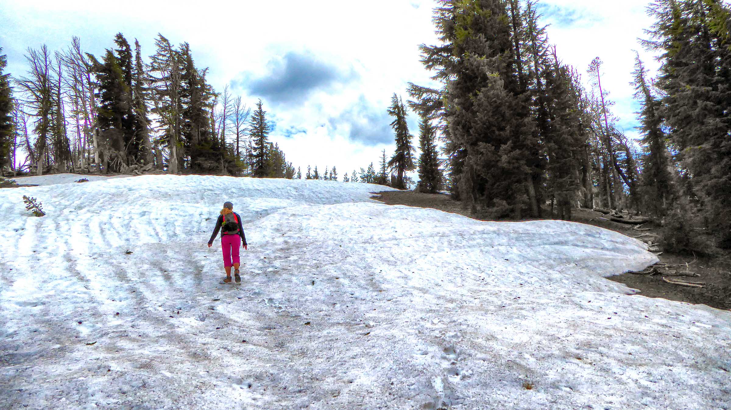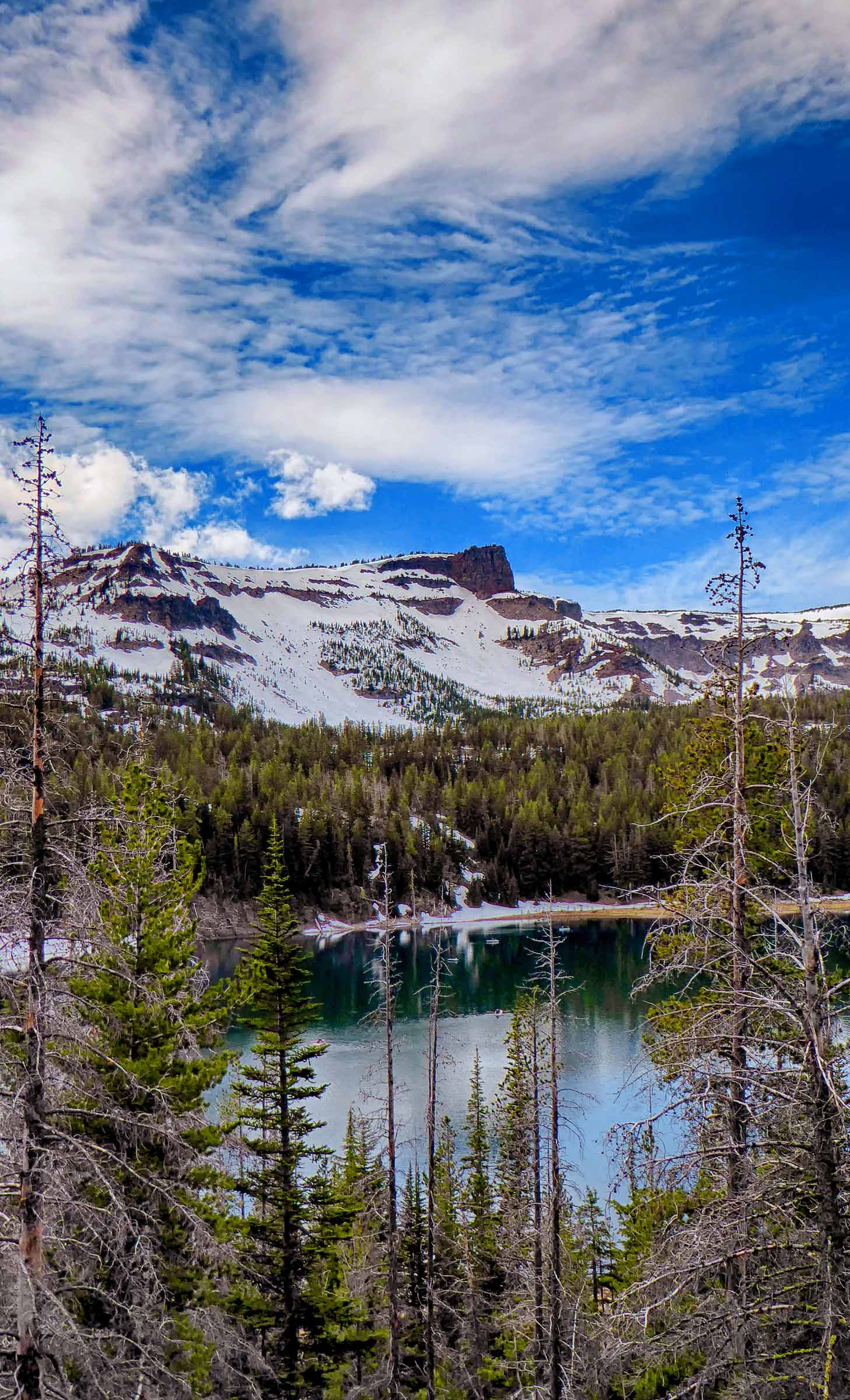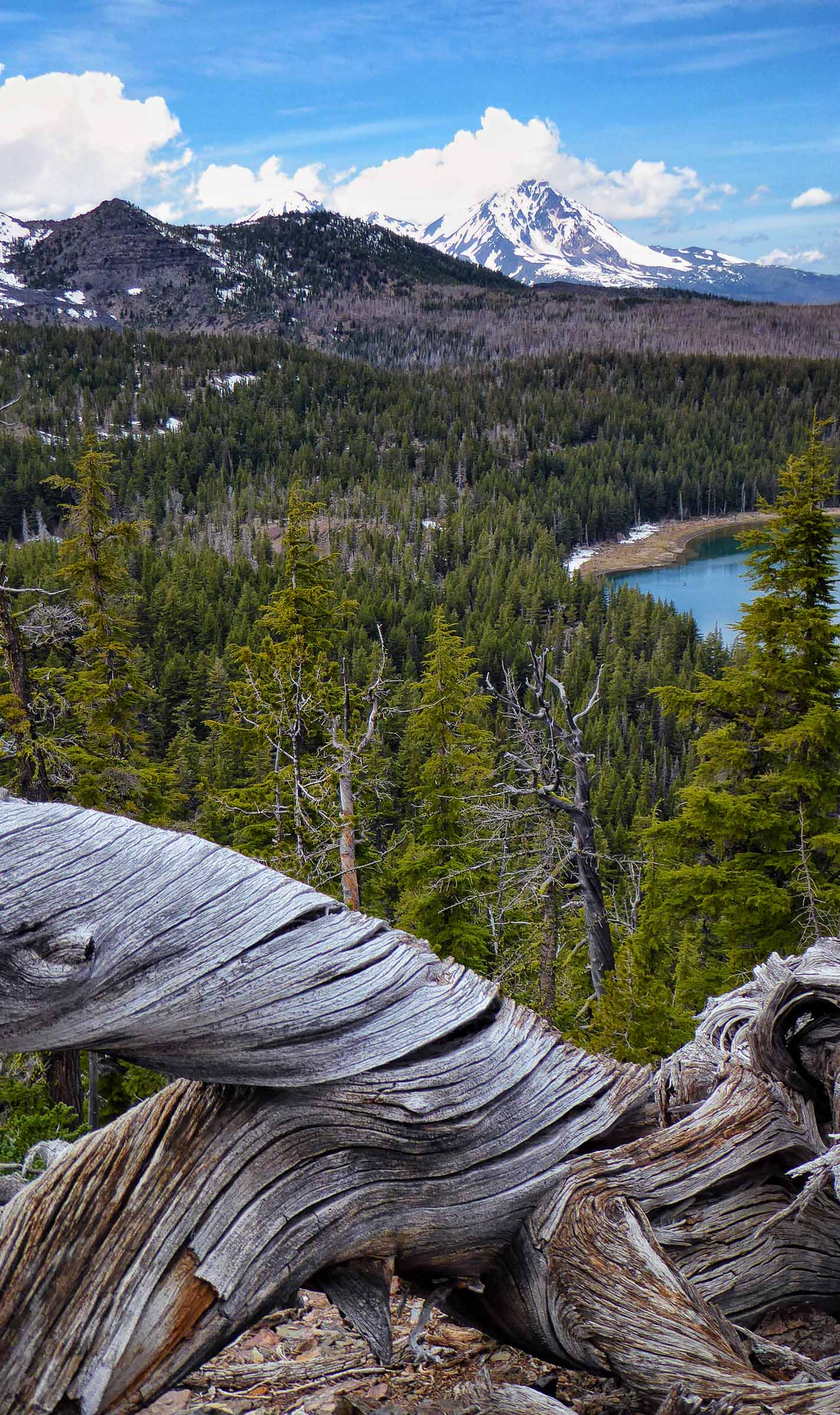 We drove to Sisters this morning to hike the Tam McArthur Rim Trail located just outside of the town off of Elm Street in The Sisters Wilderness. The Trail started from Three Creek Lake at 6,550 feet elevation, it was a winding switch back single track trail to begin but the views were well worth the hike the higher we went. However, the snow was still present on the trail and we struggled to keep going. The Rim is at 8,000 feet and usually the snow does not melt until Aug so we were a little early and were not going to make it to the top. The views of Three Creek Lake, Mt Jefferson and Broken Top were beautiful as the weather was crystal clear. After enjoying the views we headed back to the Jeep and went to see Tumalo Falls, near Bend.