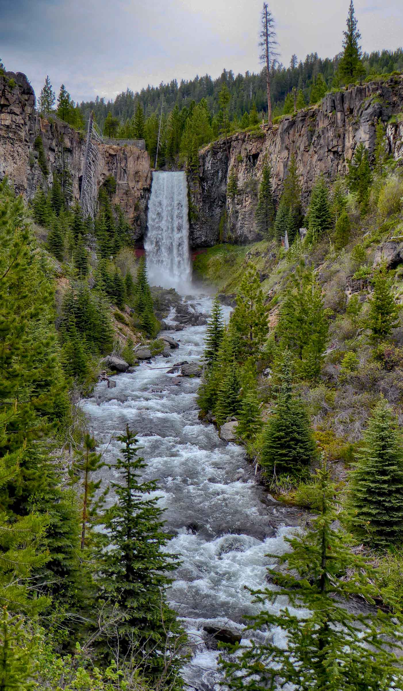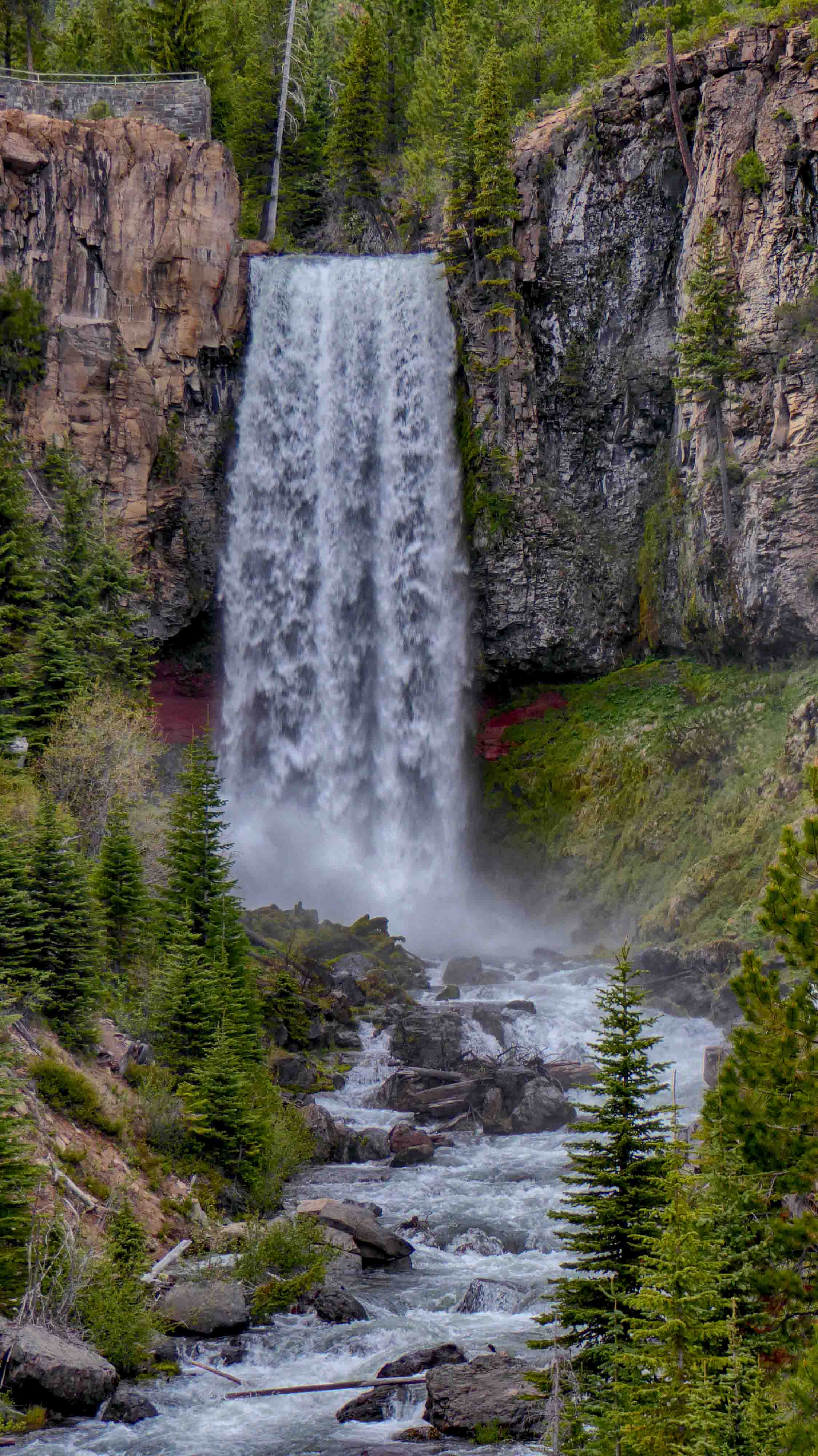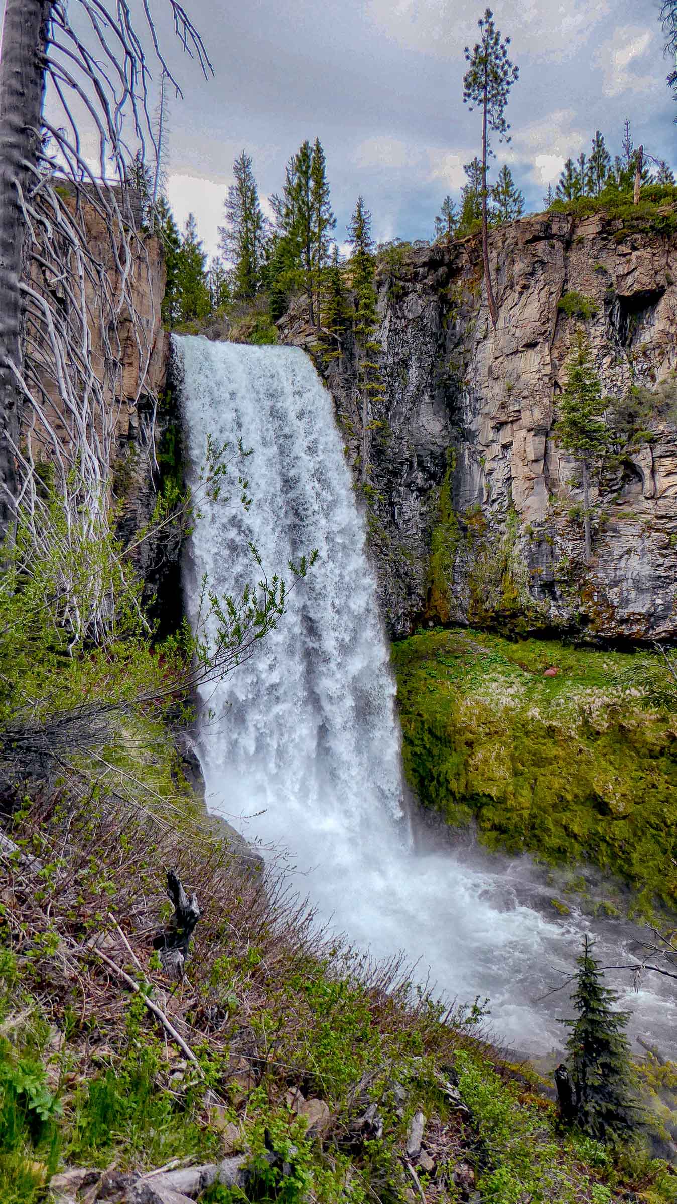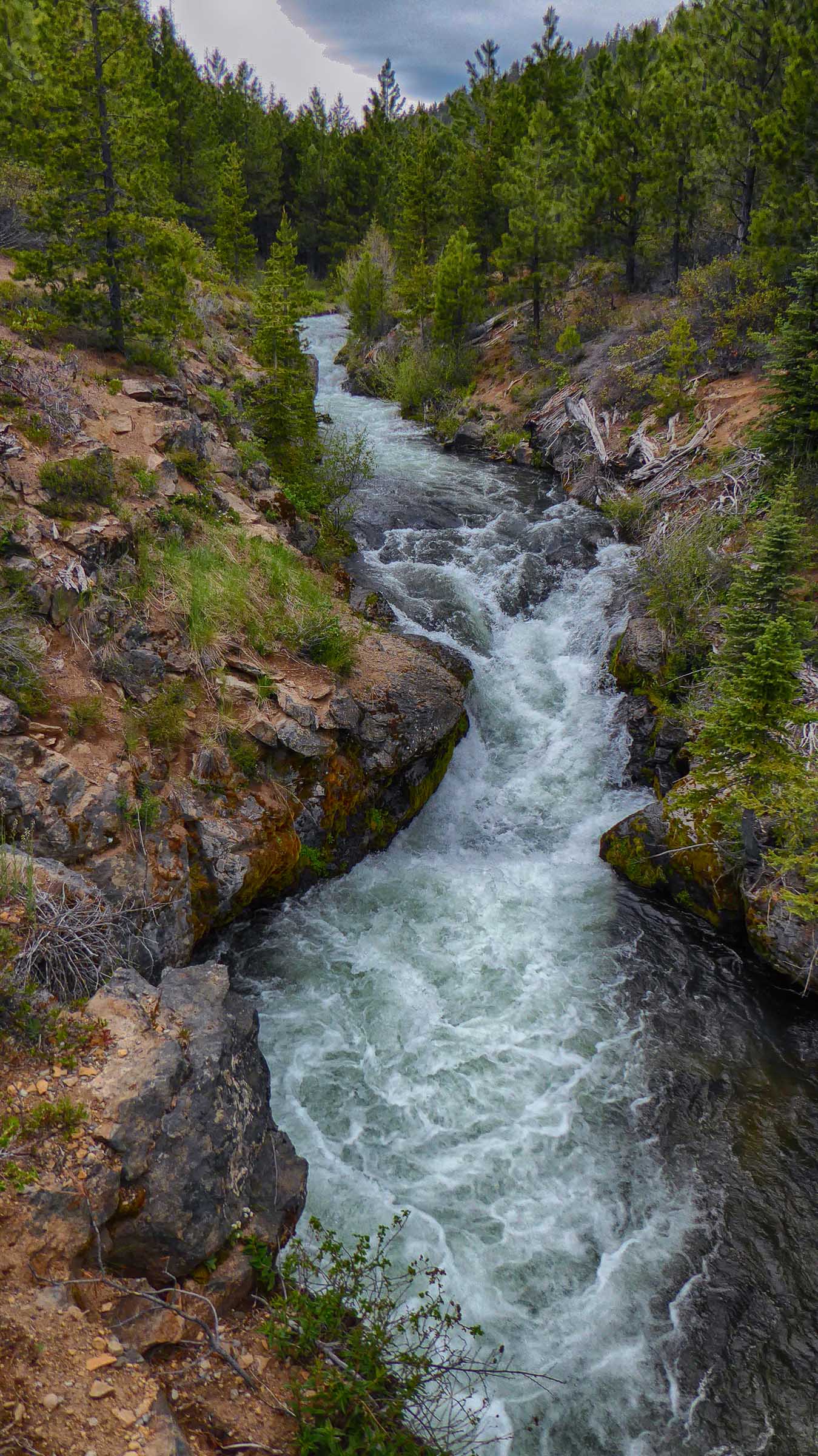 Another obstacle faced us, this time the road was closed to the Falls so we had to hike the 3 miles along the Tumalo Creek to see the Falls. It was a flat well-maintained trail with mountain bikers passing us along the trail. Once we arrived at the Tumalo Waterfalls we were amazed by the 97 feet of water cascading down into the Tumalo Creek below. We hiked along the edge of the Creek below the falls and I stood under the raging torrent of water that was so loud it was hard to hear anything else but the power of the water. The volume of water, mostly from snow melt, was very impressive as it tumbled over the 97 foot drop to the creek. Then it was the long 3 mile hike back to our car and a drive to Bend where we stopped at the Broken Top Bottle Shop for dinner and tasty micro beer. Great reward for a long day of hiking.