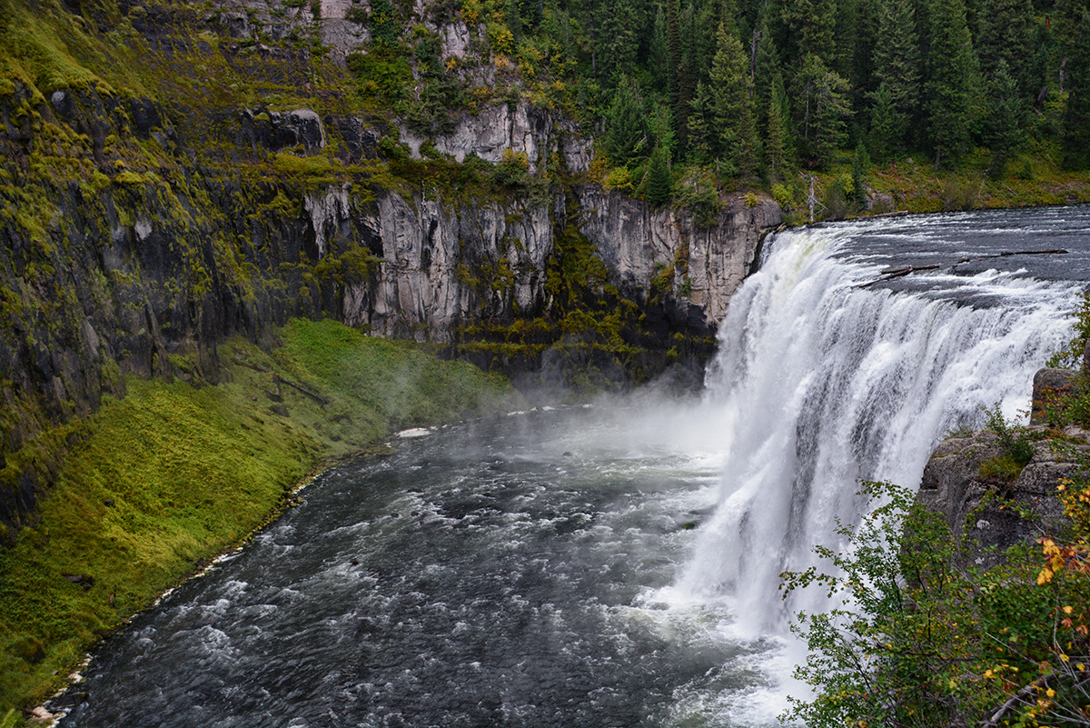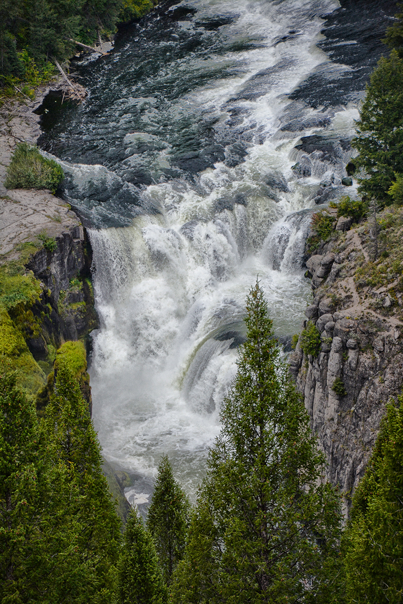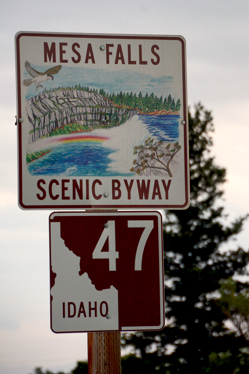 The Teton Scenic Byway ended in Ashton and we picked up the 28 mile long Mesa Falls Scenic Byway on Hwy 47, to the Mesa Falls. As we approached the falls on the walkway from the visitor center you could hear the thundering water of the Henry Fork of the Snake River cascaded over the Upper and Lower Mesa Falls. The Lower Mesa Falls is 65′ high and we saw them from the viewing platforms high above and the Upper Mesa Falls is 112′ viewed from a closer platform. The sky was getting darker as we stood on the viewing platforms and I decided to make a run for the car. It started to rain and then hail and by the time Bob reached the car he was soaking wet. We drove back to Idaho Falls and took a walk along the Snake River Greenbelt and saw the 20′ falls that the town is named after. We ate a late lunch at the Snow Eagle Brewing and Grill Restaurant where they served Beaver Dick Brown Pelt America Style Brown Ale. Then back to the RV Park after another successful day of sightseeing.