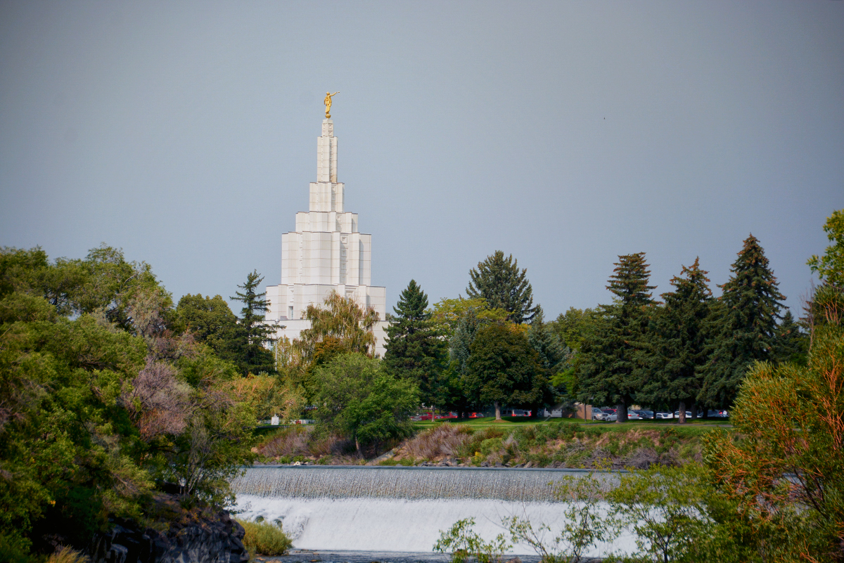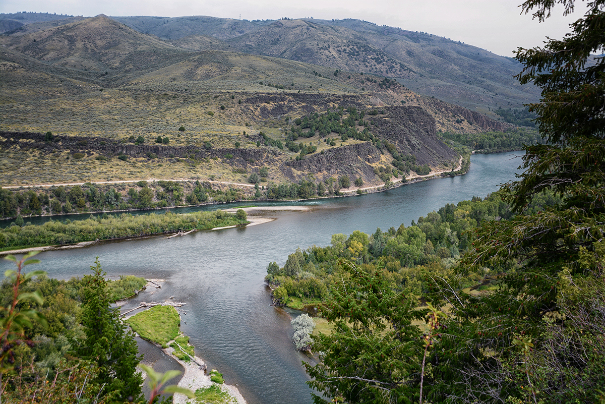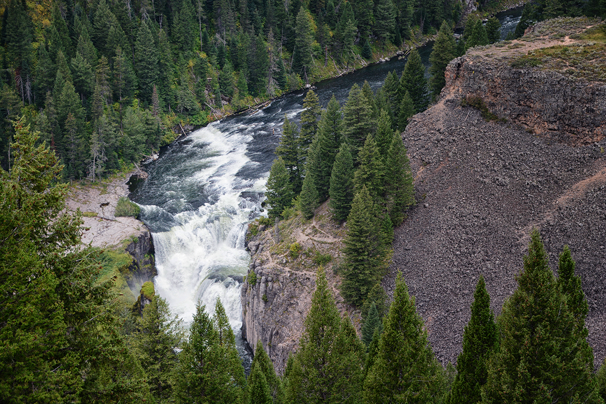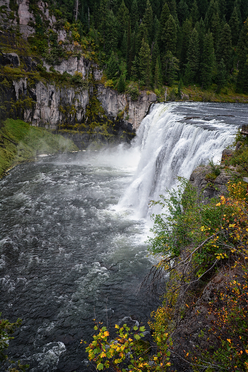 The Teton Scenic Byway ended in Ashton and we picked up the 28 mile long Mesa Falls Scenic Byway on Hwy 47, to the Mesa Falls. As we approached the falls on the walkway from the visitor center you could hear the thundering water of the Henry Fork of the Snake River cascaded over the Upper and Lower Mesa Falls. The Lower Mesa Falls is 65′ high and we saw them from the viewing platforms high above and the Upper Mesa Falls is 112′ viewed from a closer platform. The sky was getting darker as we stood on the viewing platforms and I decided to make a run for the car. It started to rain and then hail and by the time Bob reached the car he was soaking wet. We drove back to Idaho Falls and took a walk along the Snake River Greenbelt and saw the 20′ falls that the town is named after. We ate a late lunch at the Snow Eagle Brewing and Grill Restaurant where they served Beaver Dick Brown Pelt America Style Brown Ale. Then back to the RV Park after another successful day of sightseeing.