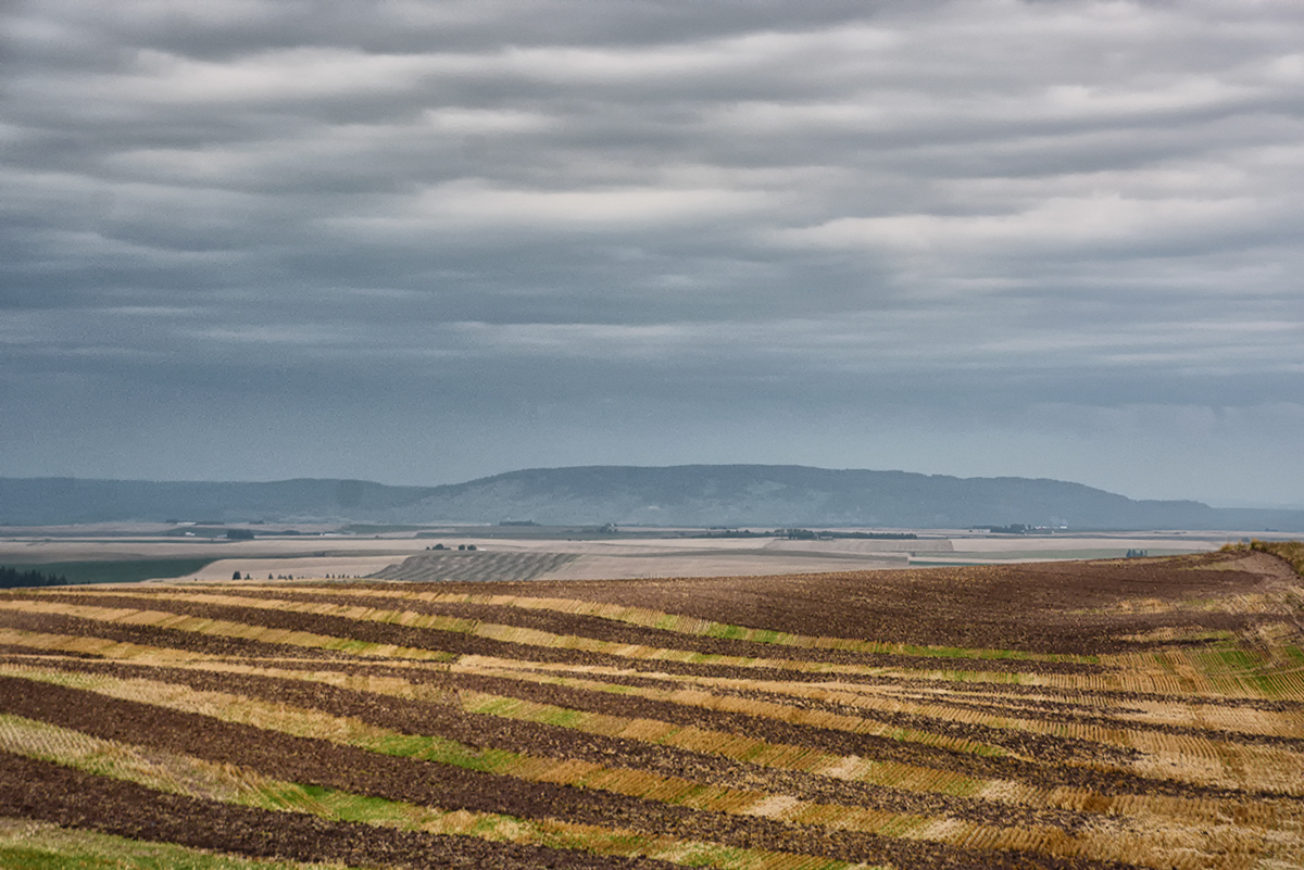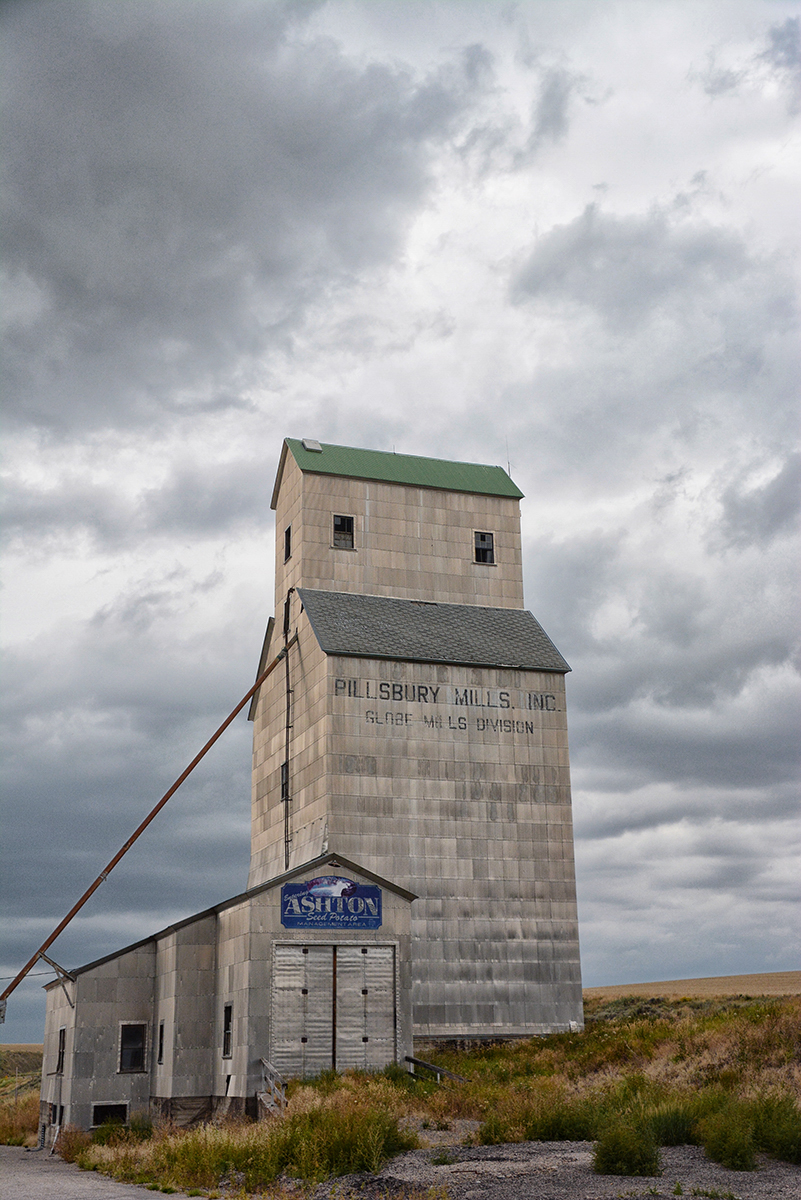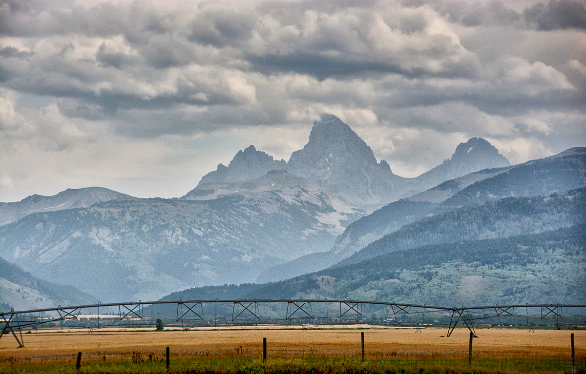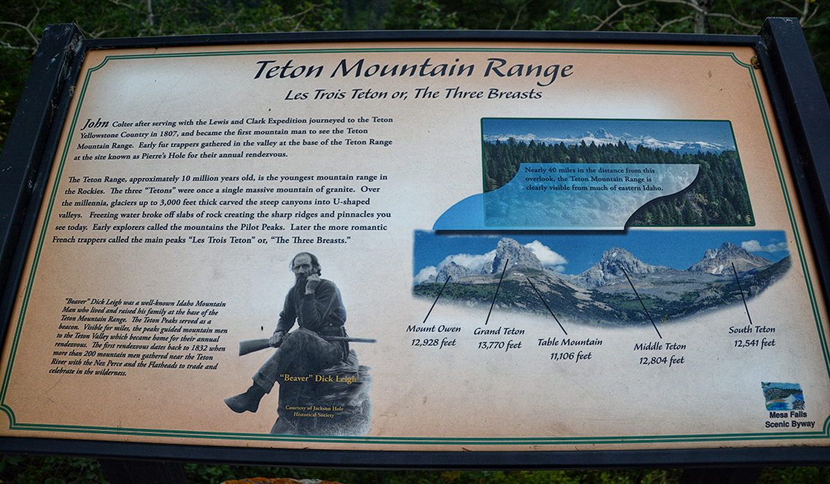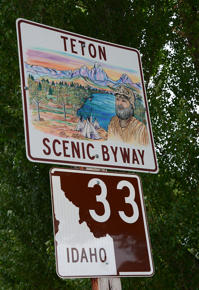 Saturday, Aug 30th, we are staying at the Snake River RV Park in Idaho Falls, ID and today we decided to take a drive along the Teton Scenic Byway, Hwy 31. The highway is about 20 miles long and we followed the Snake River for some time, the largest and longest contributory to the Columbia River, along a country road. We passed through rolling hills of barley and wheat and the grain silos standing tall in the fields, with the combines working gathering the wheat and barley. The weather was cloudy as we entered the Big Hole Mountains following the rim of the Pine Creek Gorge, we stopped to get a view of the Grand Teton in the distance but it was mostly shrouded in mist. Eventually we were able to see the jagged peaks of the “Les Trois Tetons” or the Three Breasts which the French Trappers used to call them.