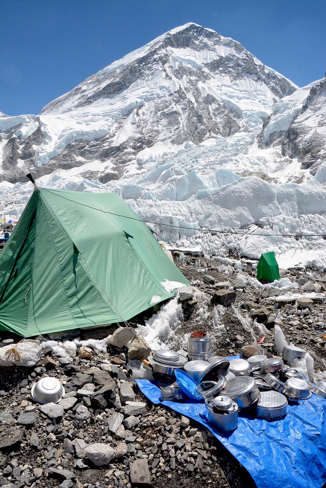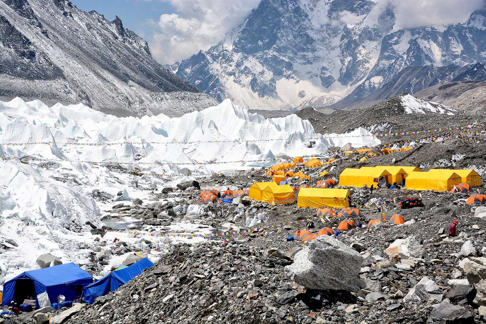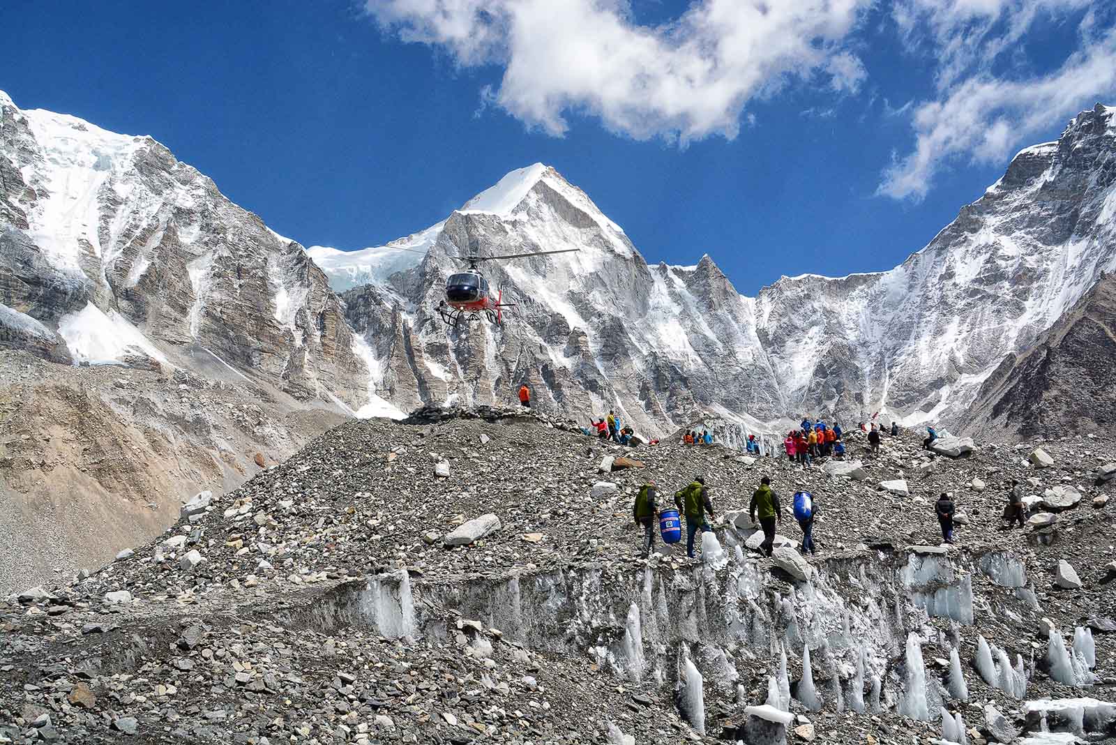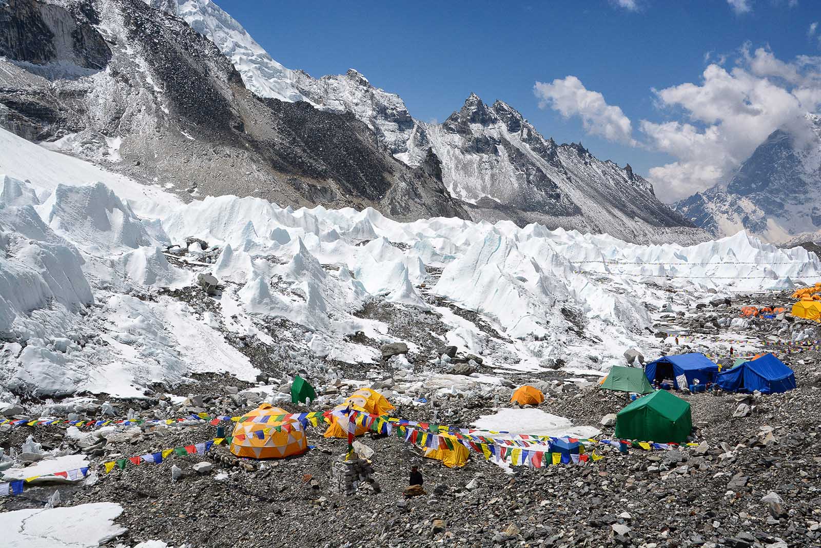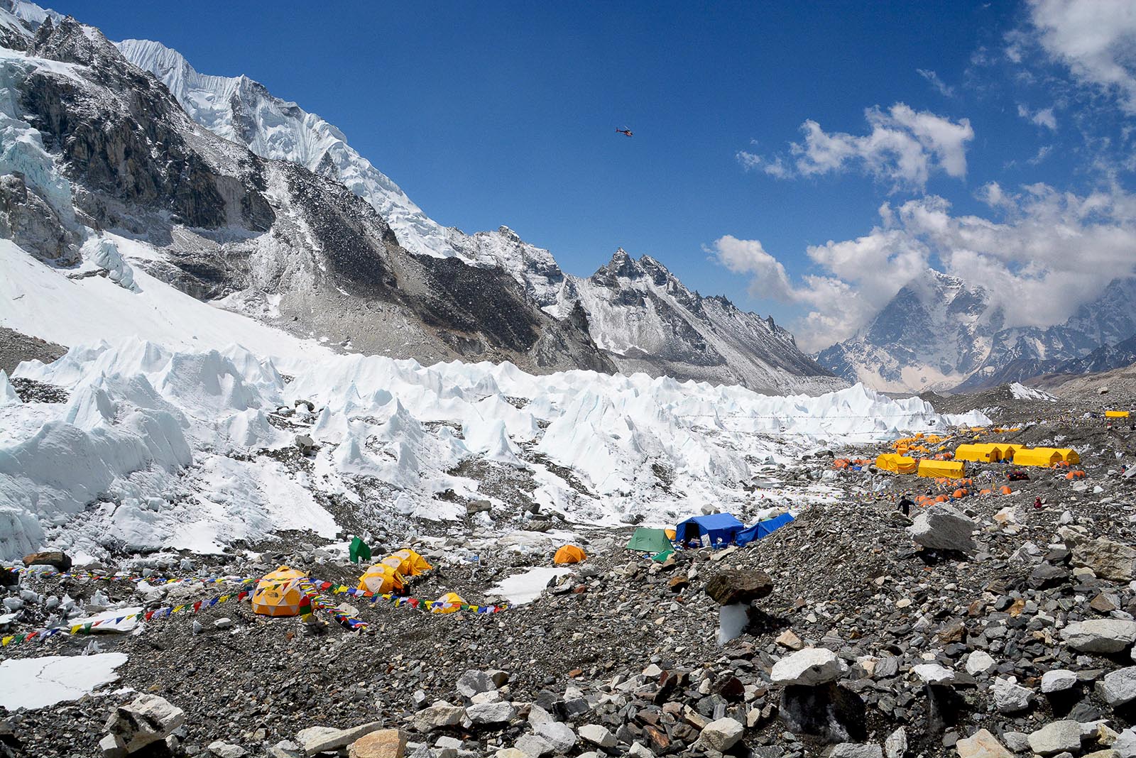 Never imagined that we would be sleeping at Everest Base Camp, on the Khumbu Glacier at 17,650 ft, the highest we have ever stayed at over night. We borrowed Kevin’s -40 and -30 degree sleeping bags, so we were warm and cozy inside the tent. However, getting up in the middle of the night to go to the bathroom was not fun at all. The sun woke us up around 7am it was so bright inside our yellow tent. Breakfast at 8am with the sound of the helicopters flying over head. It was a massive evacuation from Everest Base Camp. All day the helicopters flew people down the mountain or up to Camp 2 to remove all the gear that had been taken there before the avalanche happened. The sun was shining brightly and we were able to walk around Base Camp to experience the overwhelming magnitude of this “city on ice” nestled in a valley at the base of the highest mountains in the world. As far as the eye could see were tents filled with the climbers and Sherpas who were preparing for their ascent of Everest, which unfortunately was cancelled this year. Now sadly leaving their camps to return to Kathmandu and places beyond.
