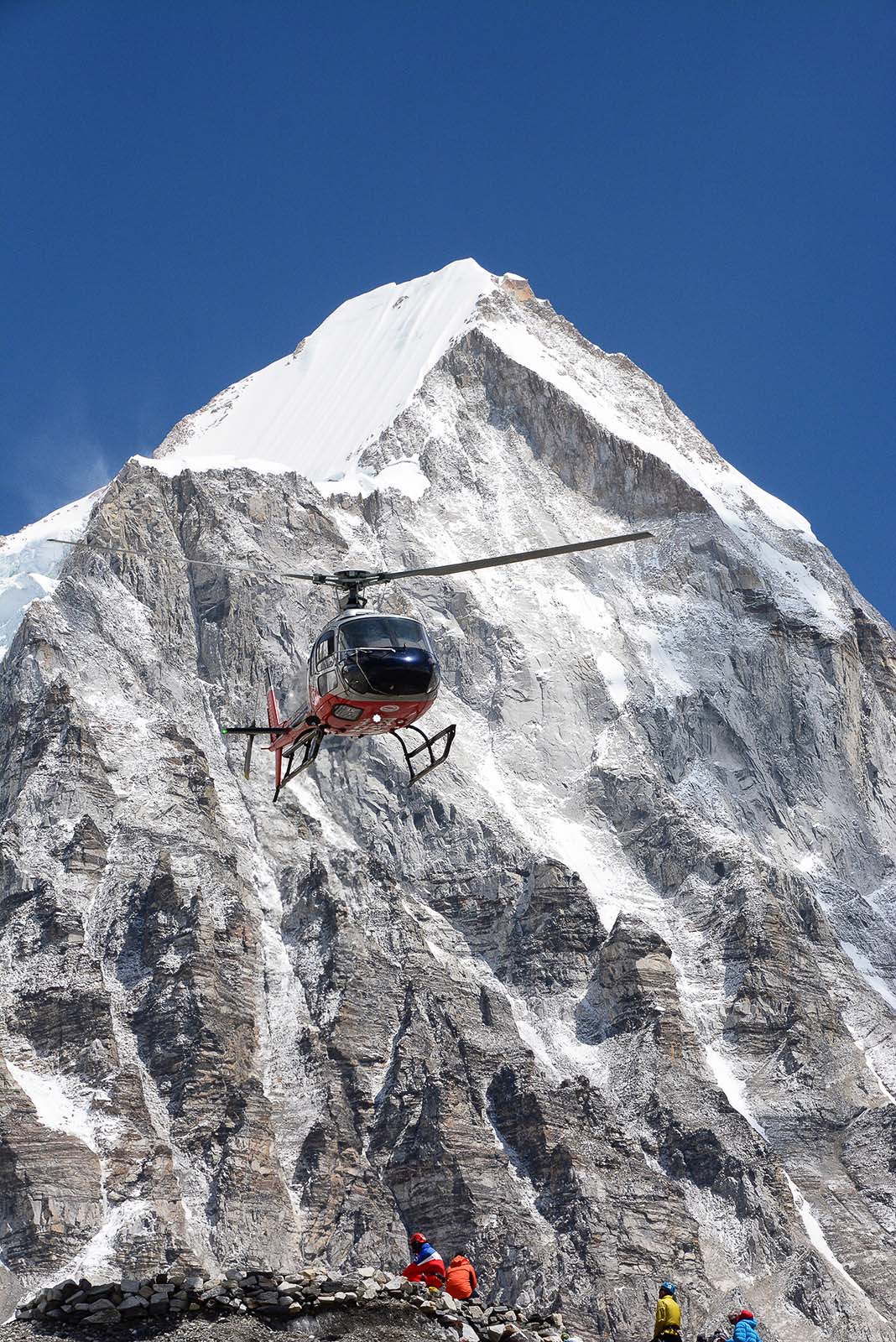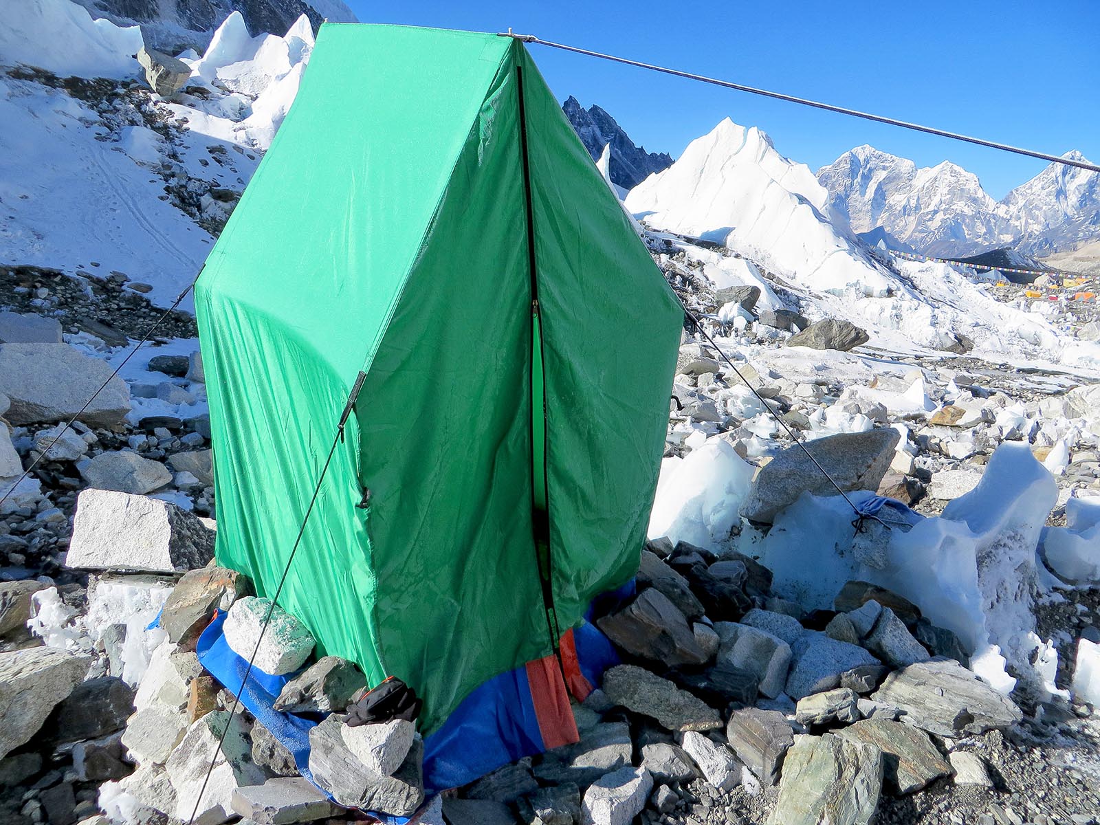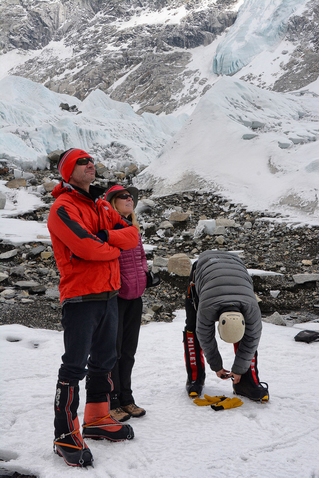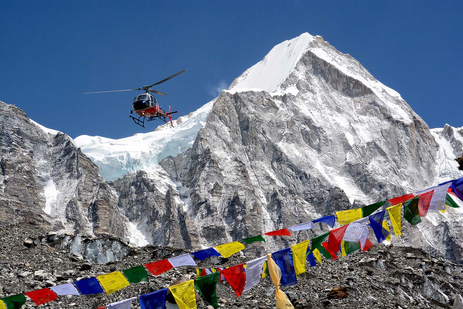 Never imagined that we would be sleeping at Everest Base Camp, on the Khumbu Glacier at 17,650 ft, the highest we have ever stayed at over night. We borrowed Kevin’s -40 and -30 degree sleeping bags, so we were warm and cozy inside the tent. However, getting up in the middle of the night to go to the bathroom was not fun at all. The sun woke us up around 7am it was so bright inside our yellow tent. Breakfast at 8am with the sound of the helicopters flying over head. It was a massive evacuation from Everest Base Camp. All day the helicopters flew people down the mountain or up to Camp 2 to remove all the gear that had been taken there before the avalanche happened. The sun was shining brightly and we were able to walk around Base Camp to experience the overwhelming magnitude of this “city on ice” nestled in a valley at the base of the highest mountains in the world. As far as the eye could see were tents filled with the climbers and Sherpas who were preparing for their ascent of Everest, which unfortunately was cancelled this year. Now sadly leaving their camps to return to Kathmandu and places beyond.