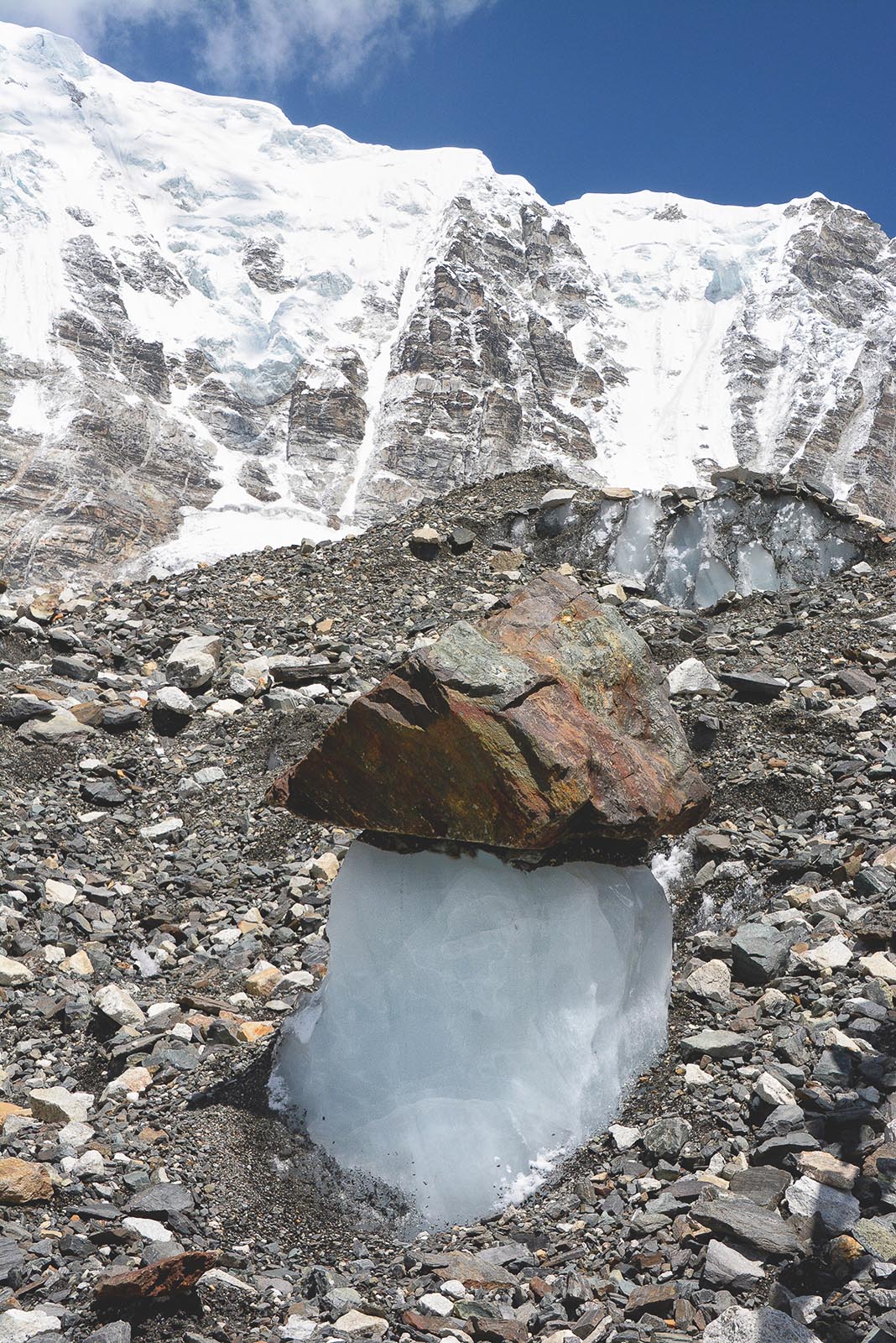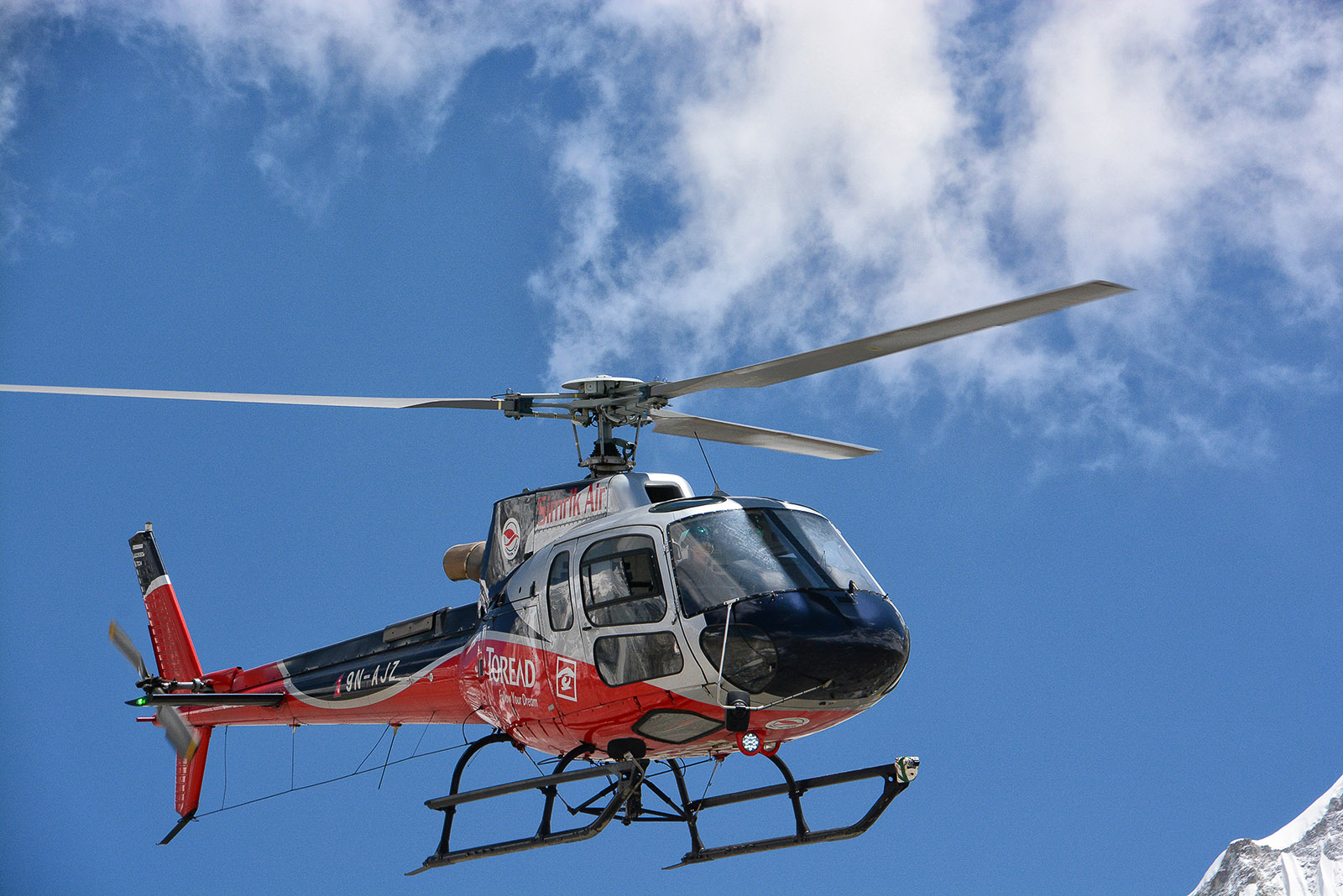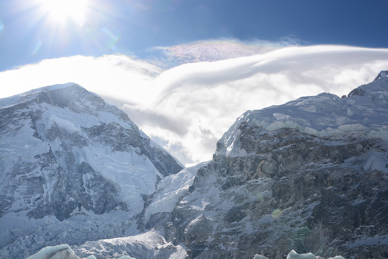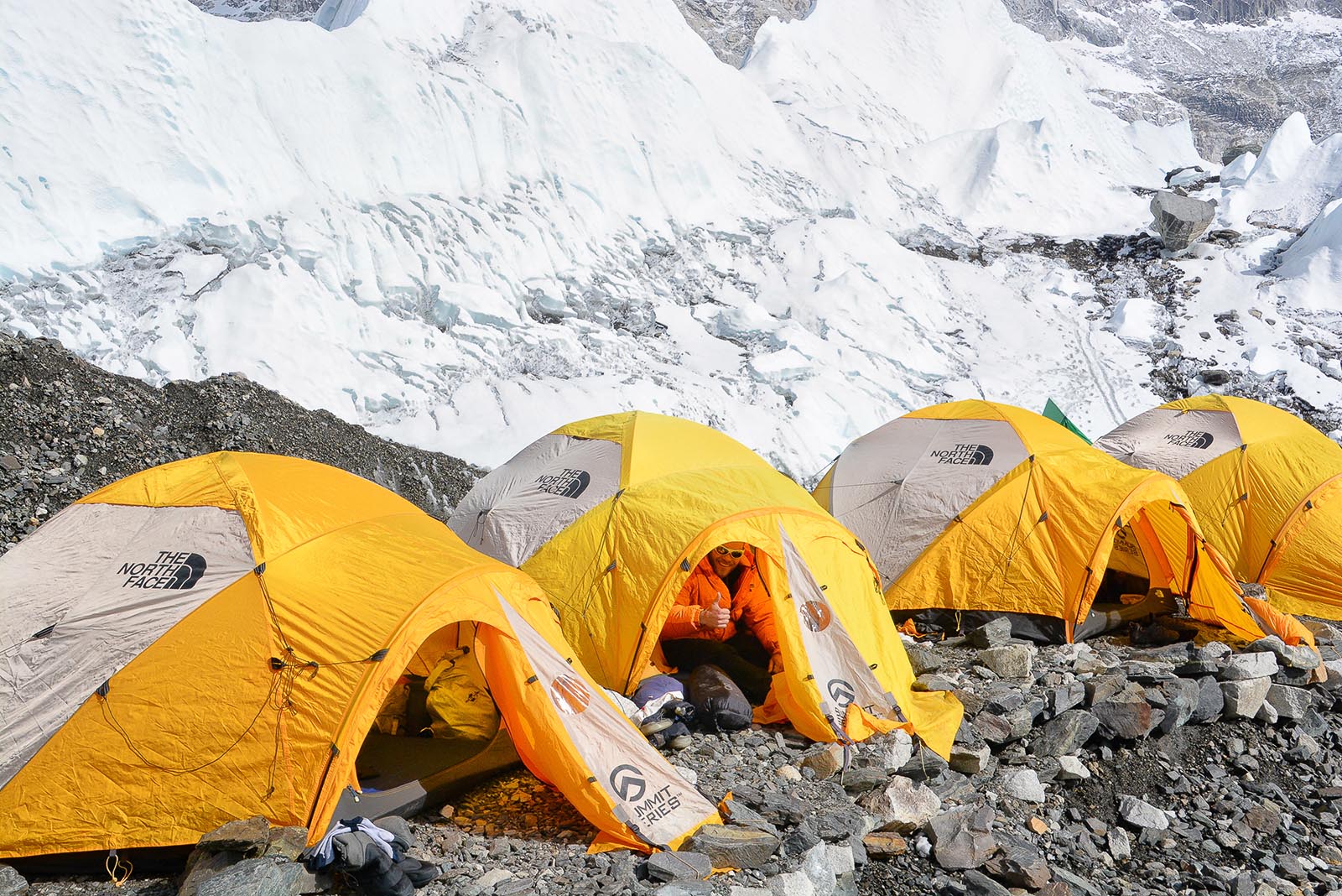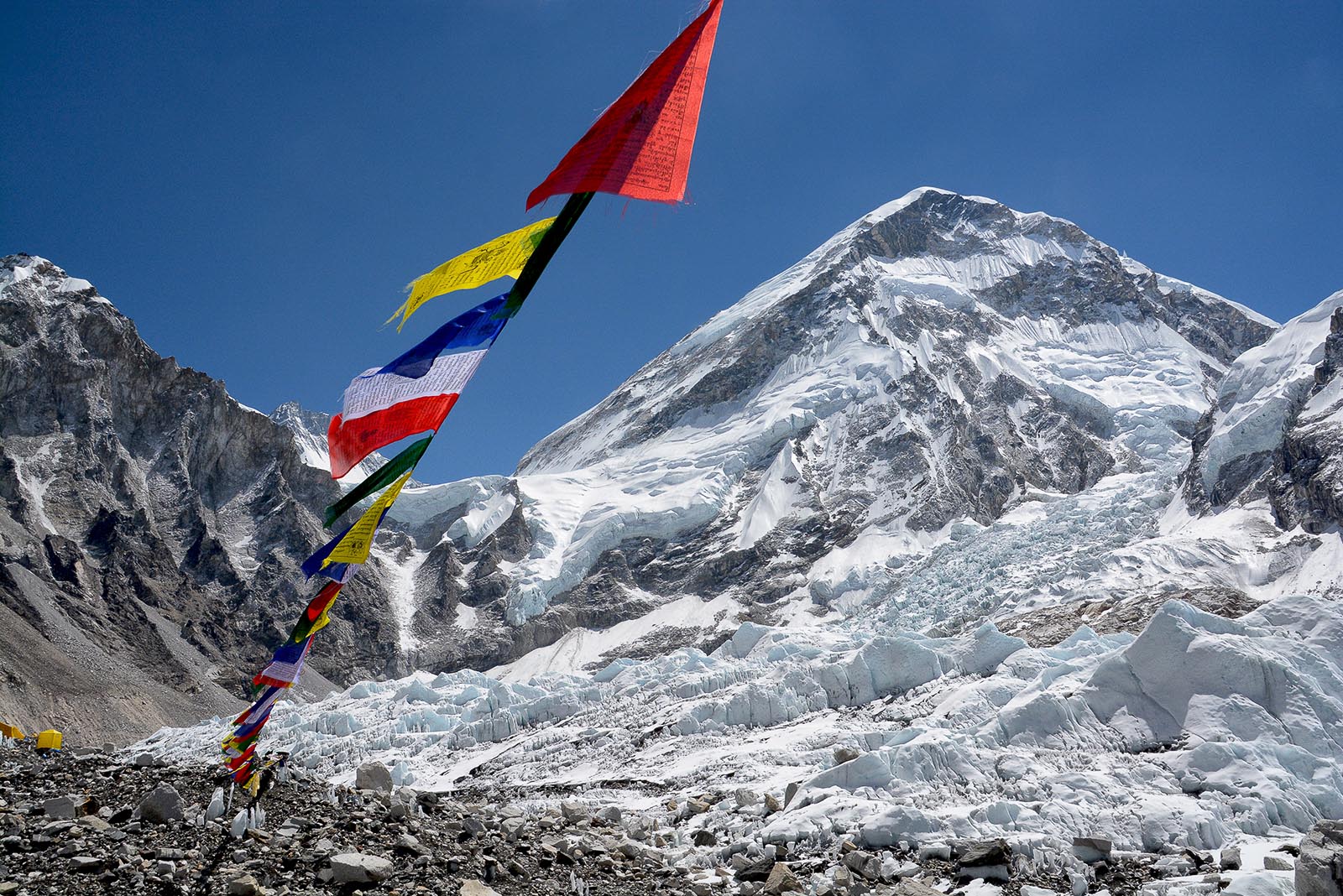 Never imagined that we would be sleeping at Everest Base Camp, on the Khumbu Glacier at 17,650 ft, the highest we have ever stayed at over night. We borrowed Kevin’s -40 and -30 degree sleeping bags, so we were warm and cozy inside the tent. However, getting up in the middle of the night to go to the bathroom was not fun at all. The sun woke us up around 7am it was so bright inside our yellow tent. Breakfast at 8am with the sound of the helicopters flying over head. It was a massive evacuation from Everest Base Camp. All day the helicopters flew people down the mountain or up to Camp 2 to remove all the gear that had been taken there before the avalanche happened. The sun was shining brightly and we were able to walk around Base Camp to experience the overwhelming magnitude of this “city on ice” nestled in a valley at the base of the highest mountains in the world. As far as the eye could see were tents filled with the climbers and Sherpas who were preparing for their ascent of Everest, which unfortunately was cancelled this year. Now sadly leaving their camps to return to Kathmandu and places beyond.