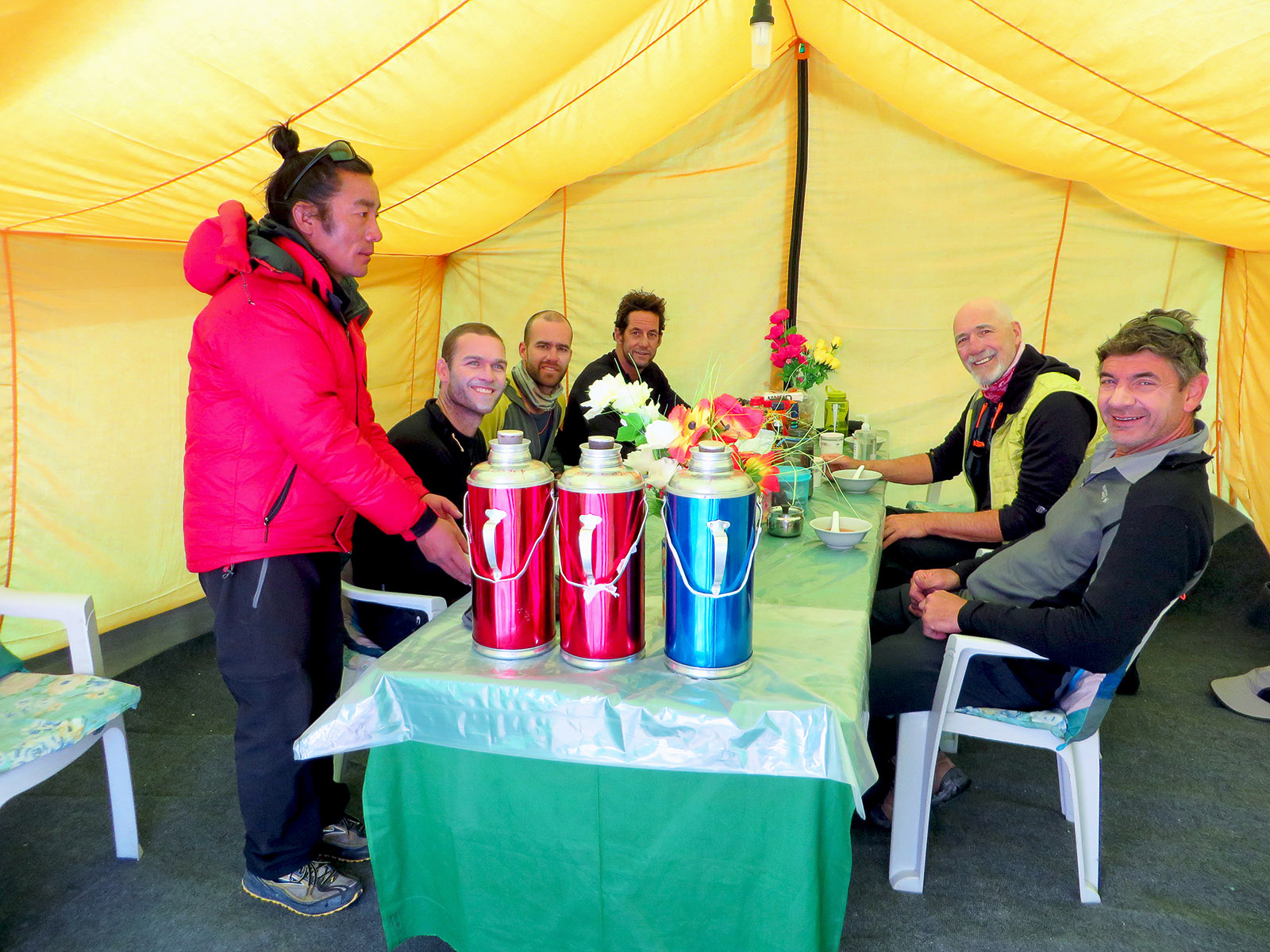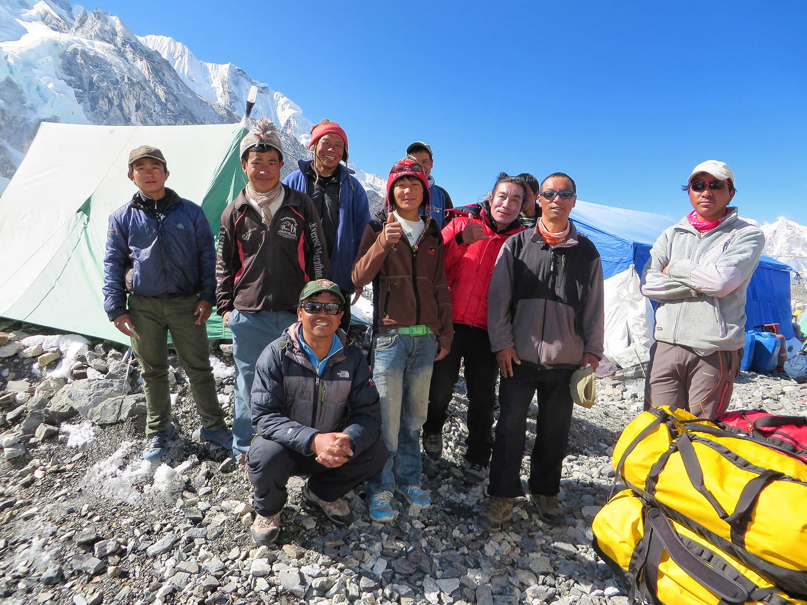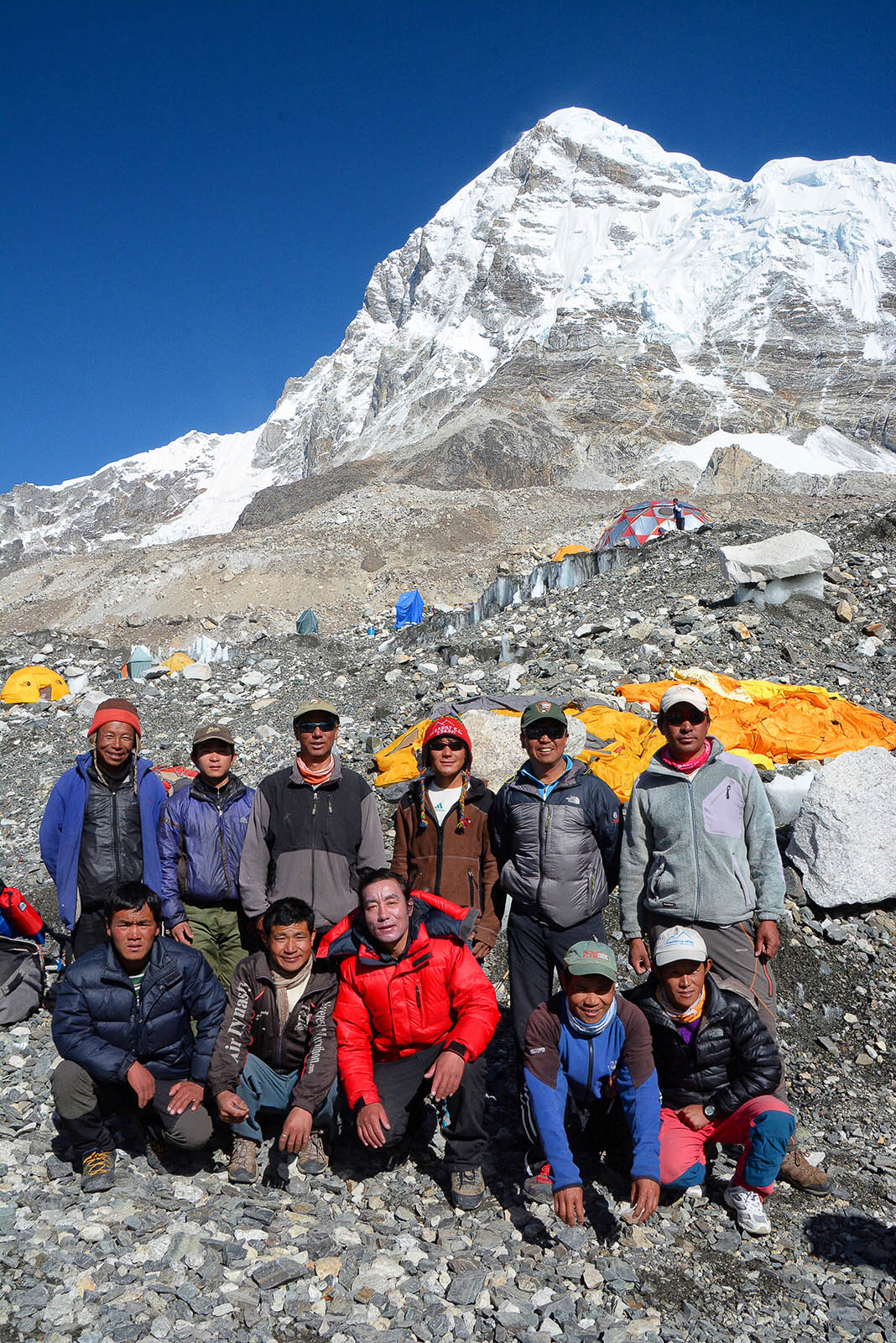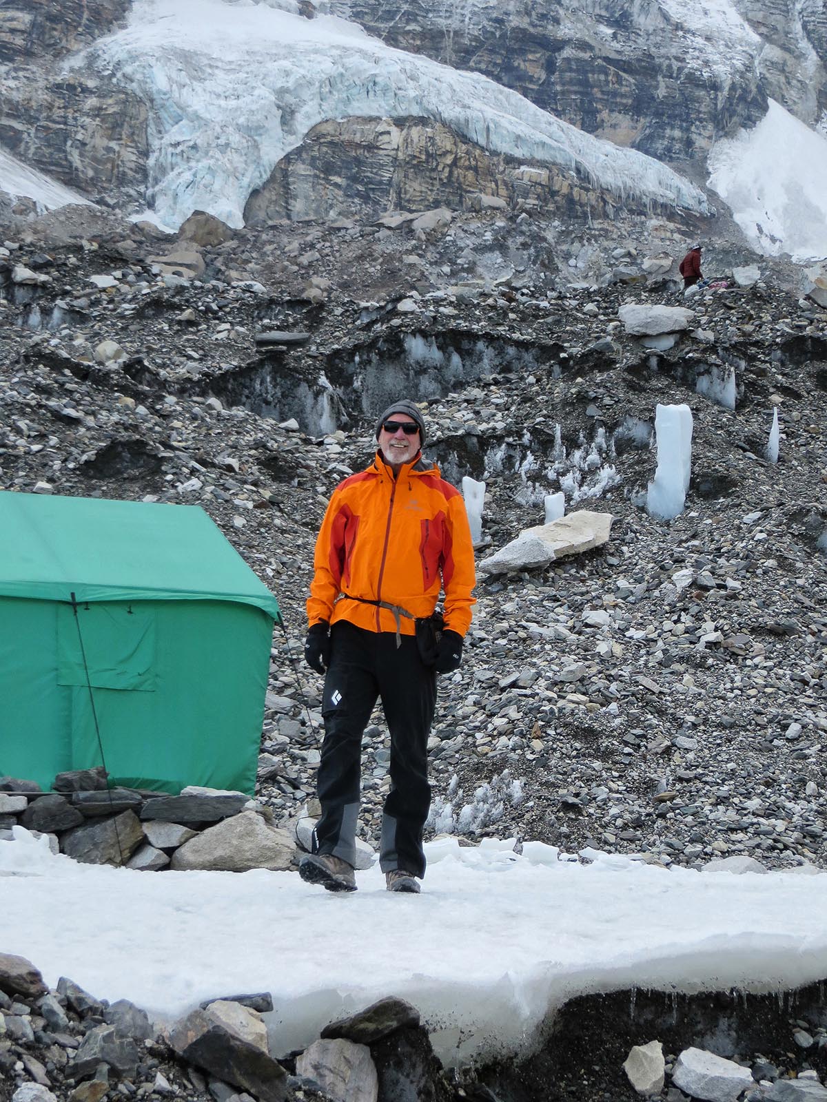 Lunch was served at noon in our mess tent. Afterwards we all went with Panuru to watch Kevin, B-1, Brad and Ake practice ice climbing on the ice wall near our camp. With crampons ready and ice picks in hands each had their turn climbing the 40 foot ice wall as Bob and I watched. It started to snow so we returned to our tents before dinner to try and warm up. When the sun is out it is very warm here but once it is cloudy it gets very cold. At dinner we planned our descent down the mountain tomorrow to Lobuche and then Kevin, Brad, B-1 and Ake with Tashi will hike to Lobuche high base camp to spend the night getting ready to climb Mt Lobuche.